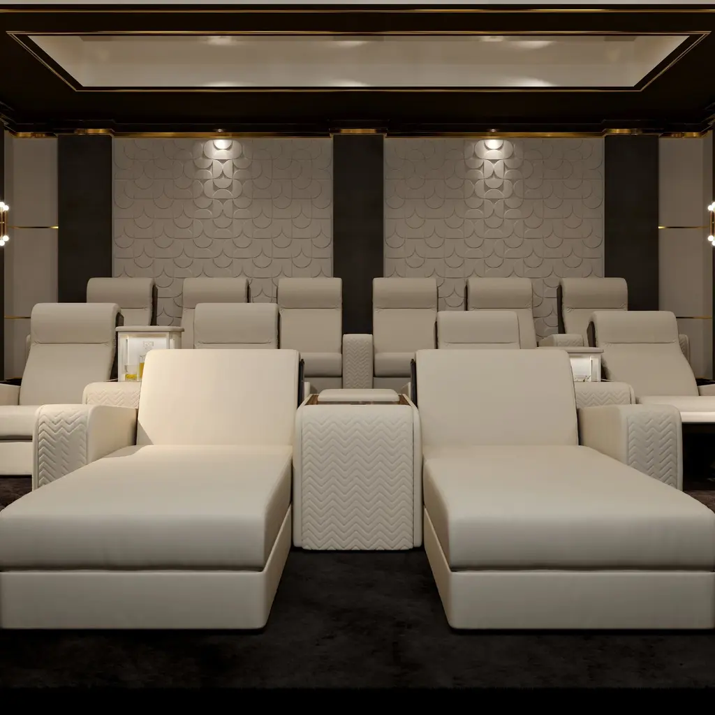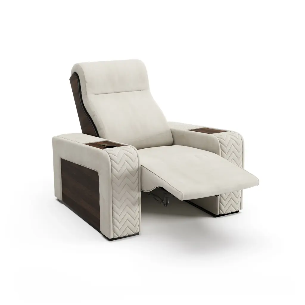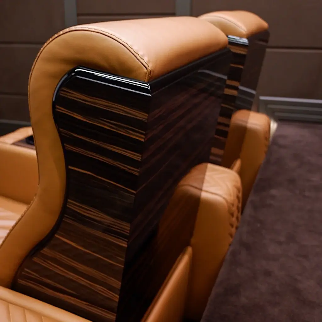 The definitive seat for a luxury home cinema, the Onassis Reclining Chair from Vismara is a masterpiece of Italian craftsmanship and high-impact design. Made in Italy, this contemporary chair features a back shell of glossy Makassar Ebony veneer, creating a stunning contrast with the soft leather upholstery. The armrests are detailed with a unique zig-zag quilted pattern. A fusion of sophisticated materials and ergonomic technology, it’s designed to bring the ultimate cinematic experience to your private residence. Highlights: