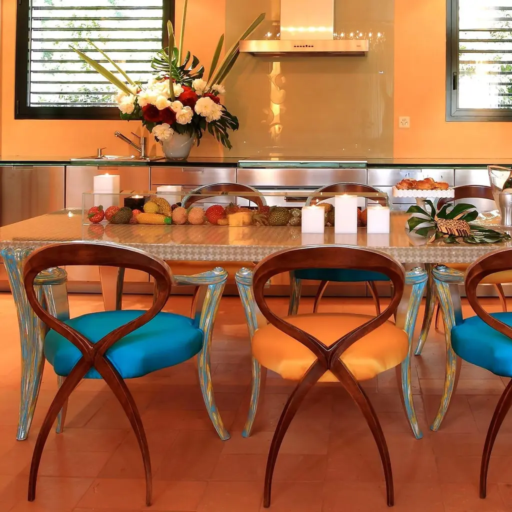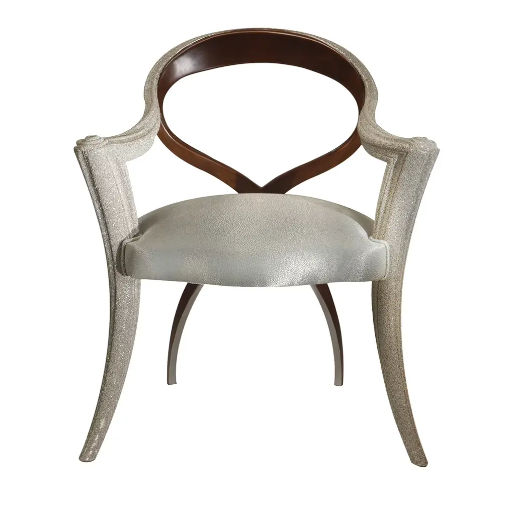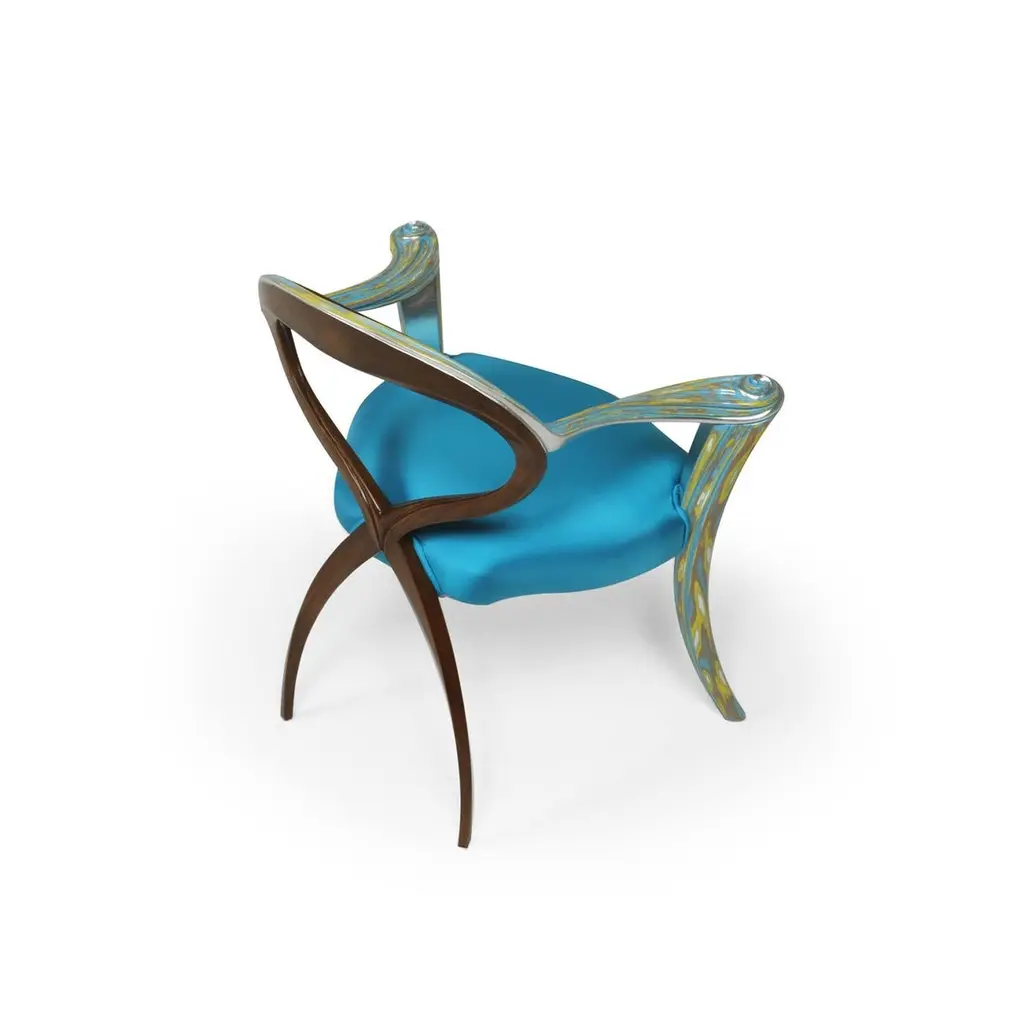 Sinuous lines combined to achieve a disarming sense of grace define the airy look of this stylish armchair. Enriched with silver leaf details, the wooden frame is minutely carved and boasts a polychrome, mottled look on the front legs that stands in contrast with the walnut (also lacquered) characterizing the rear ones. Please consult the Concierge to explore the wide variety of customization options.