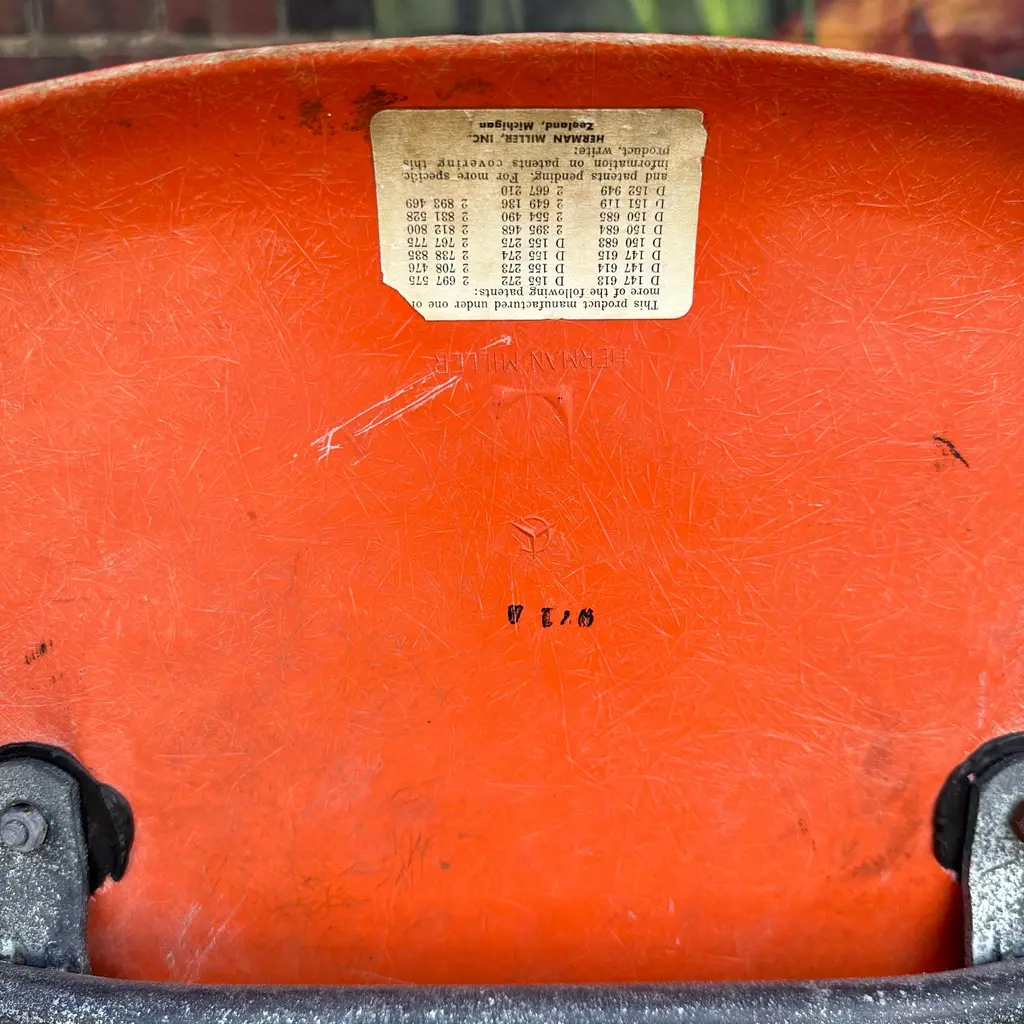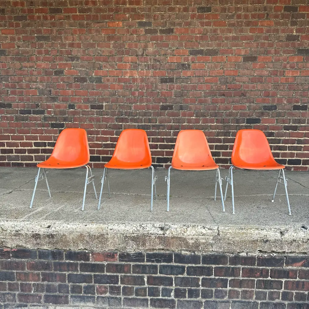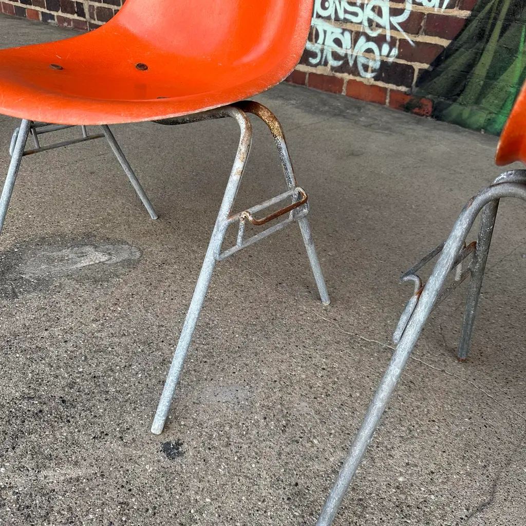 1960s DSS molded fiberglass shell chairs on stacking base, designed by Charles and Ray Eames for Herman Miller. Gleaming orange shells are in original condition, each with a distinct thready texture. They’ve been modified at some point in time and have four holes drilled into seats to attach to bases. Sold individually.