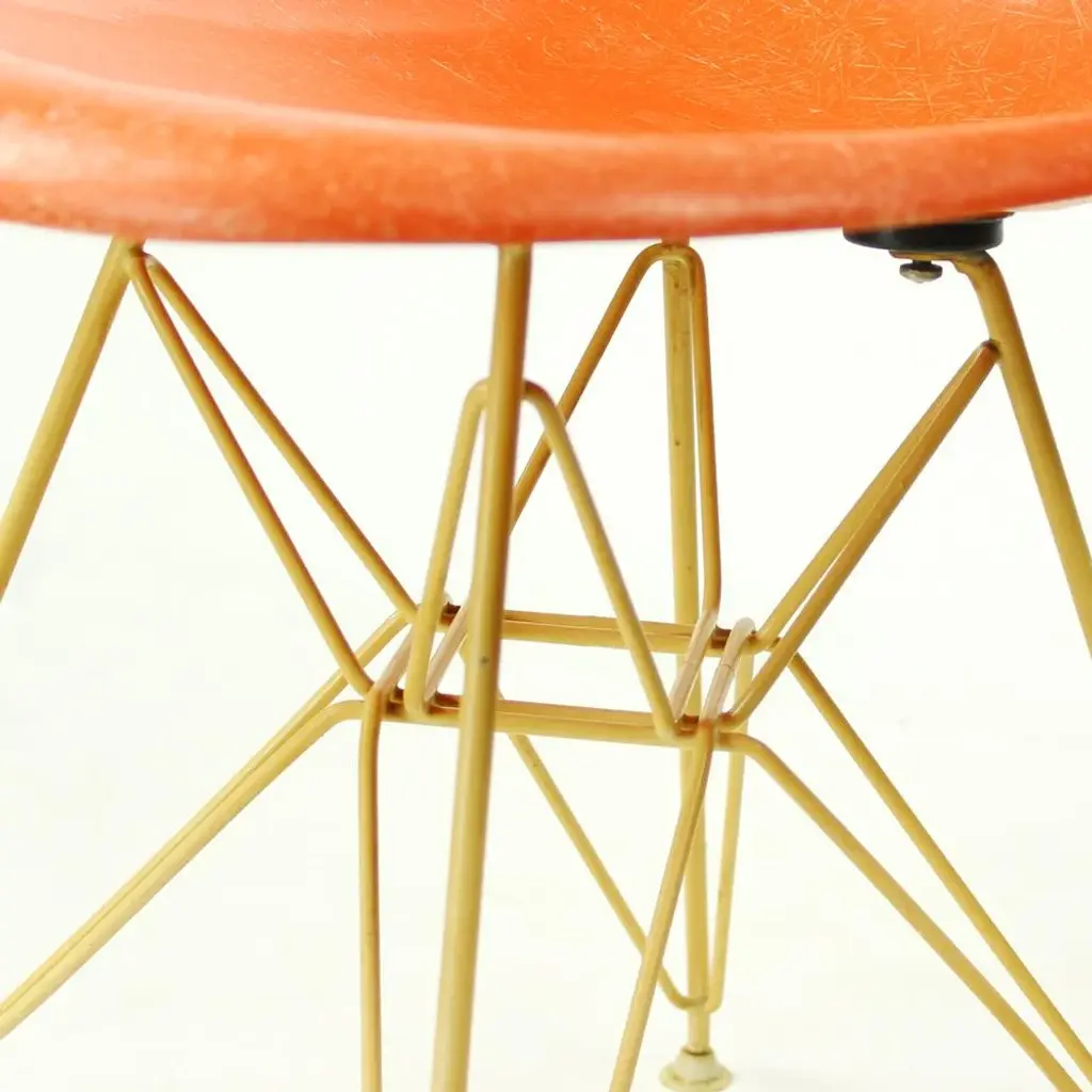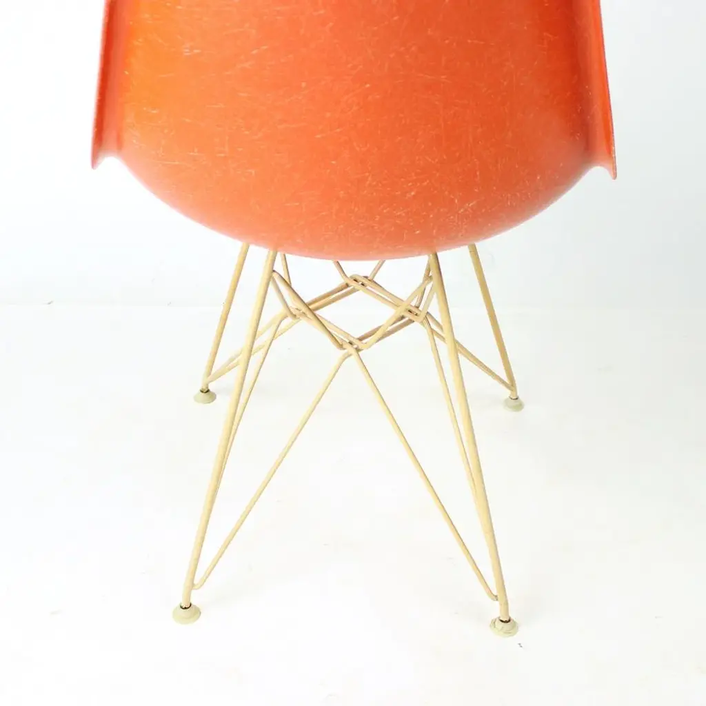 Original 1960s orange fiberglass shell chair designed by Charles and Ray Eames for Herman Miller. The scarse candy orange color has its original finish with the distinct thread texture. The shell is mounted on the original Eiffel base in light cream color. The base is also original and shows some minor age and use wear. This iconic chair has original stamps underneath. We have 5 chairs available. This piece has an attribution mark, I am sure that it is completely authentic and take full responsibility for any authenticity issues arising from misattribution