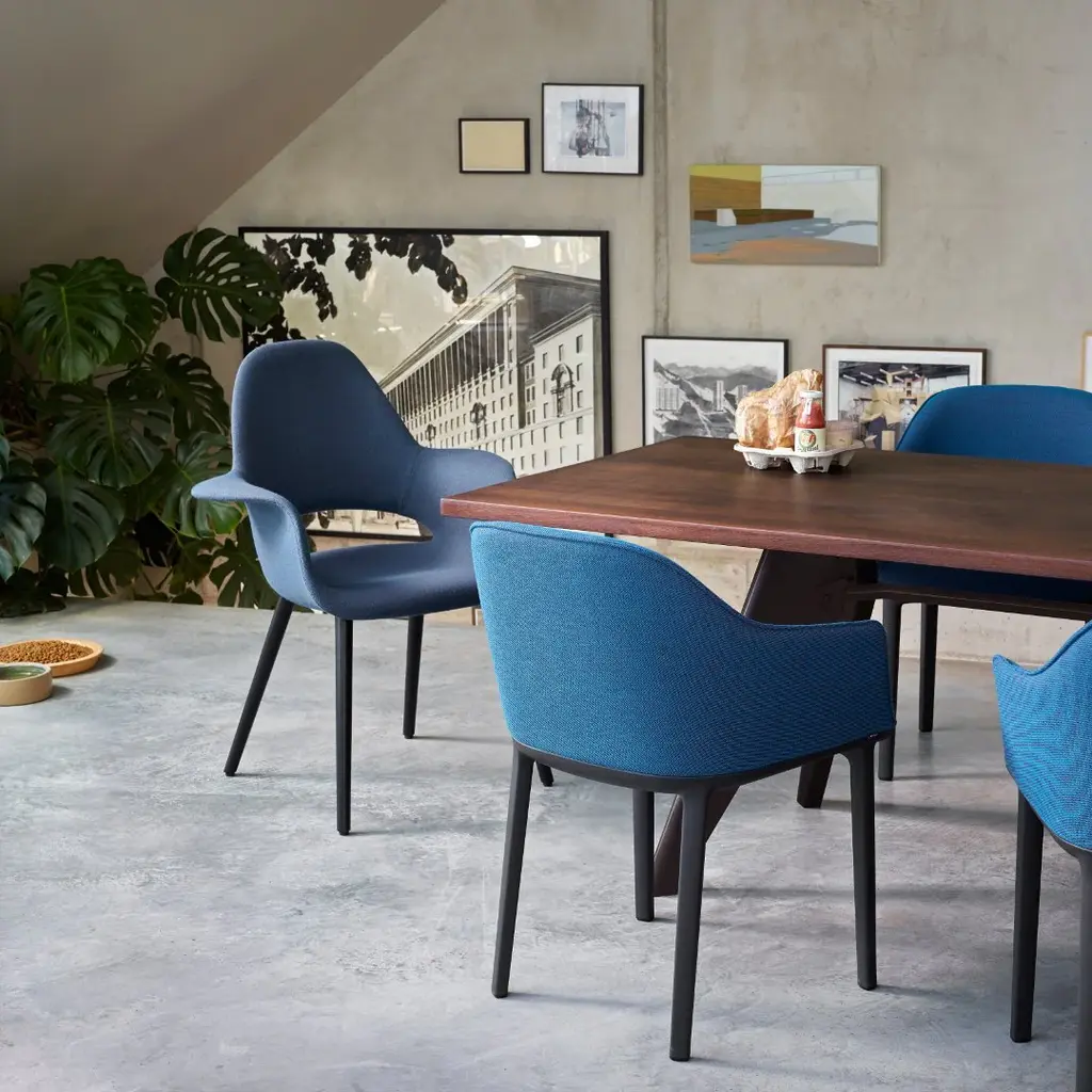 The Organic Chair – a small and comfortable reading chair – was developed in several versions for the 1940 ‘Organic Design in Home Furnishings' competition organised by the Museum of Modern Art in New York. With its sculptural shapes, the design was ahead of the times. But due to the absence of suitable manufacturing techniques, the armchair never went into production. Not until 1950 did it become possible to manufacture and market organically shaped seat shells in large quantities, as exemplified by Charles and Ray Eames's famous Plastic Armchair or Saarinen's Tulip Chair.