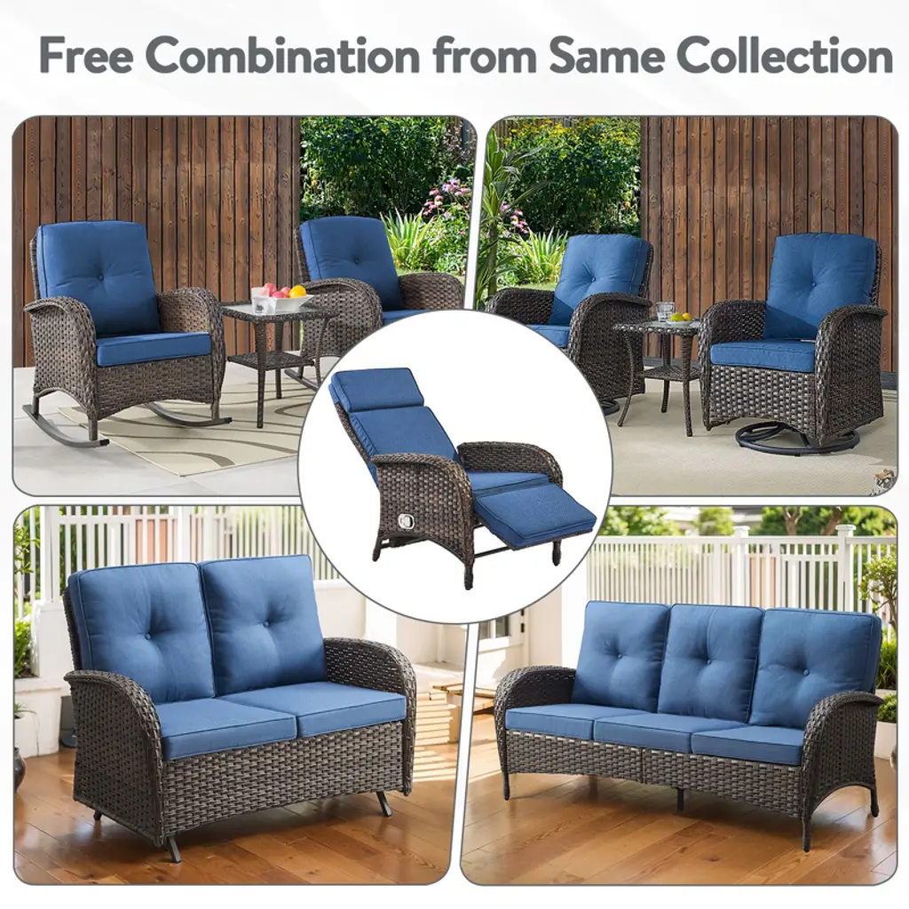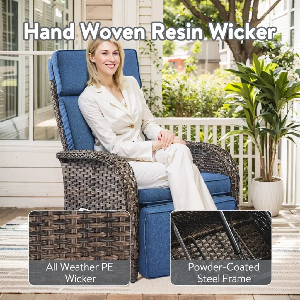 Our convertible wicker chaise lounge is available in three forms: single sofa, recliner, and bed to meet the needs of our customers. Customers can adjust the seat angle (any positions) to choose their comfortable sitting position. Our patio sofa is made of durable PE rattan material, which is all-weather resistant and can withstand much weight. Soft, thick, and washable cushions with high-density foam offer you deep seating and help you to dispel fatigue. Specification Chaise Lounge Type:Single chaise Exterior Materia:Resin Reclining:Yes Wheels/Casters Included:No Weight Capacity:300 lb. Cushions Included:Yes Cushion Durability:Water Resistant, Year Round Use; UV Resistant Cushion Cover Material:Polyester Durability:Weather Resistant; Water Resistant; UV Resistant;Mold /Mildew Resistant; Rust Resistant Removable Cushions:Yes Upholstery Fill Material:Foam Features Modern & comfortable adjustable sofa bed: This patio furniture set has any backrest settings. It can be easily and quickly converted into an armchair, a large guest bedroom, as well as an outdoor recliner, to meet your various needs, and help you find. Quick easy assembly: The outdoor patio sectional sofa is assembled as required, and all the hardware and necessary tools are included. 30-45 minute estimated assembly time with explicit instruction. High quality & durable: our patio furniture sets are made of sturdy and firm pe rattan material, which is not only environment friendly but also can withstand the heavyweight of tall people for deep seating, suitable for indoor or outdoor, patio, porch, lawn, garden, backyard, poolside, balcony. Water Resistant & Easy Clean: The pool recliner is water resistant and easy to clean. This is useful for outdoor use, where you don't have to worry about moisture or accidental spills when placing the patio wicker recliner in poolside. The water resistant material and coating of the cushions and wicker prevents moisture from seeping into the interior of the chair and also makes it easy for you to clean. All you need to do is wipe the surface with a damp cloth to remove dust and stains. What's in the box? 1* Lounge Chaise with cushion 1* All Hardware and manual