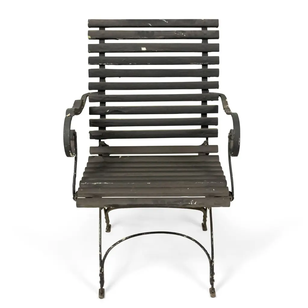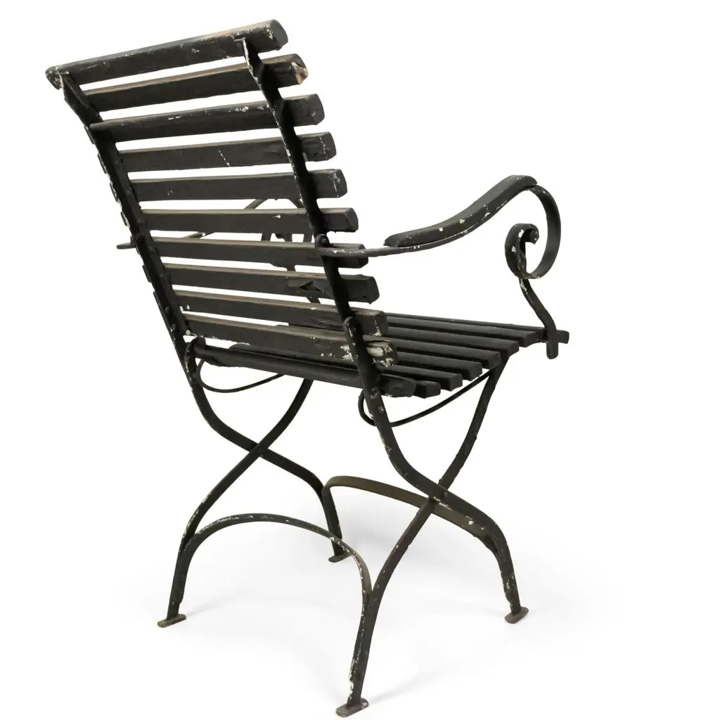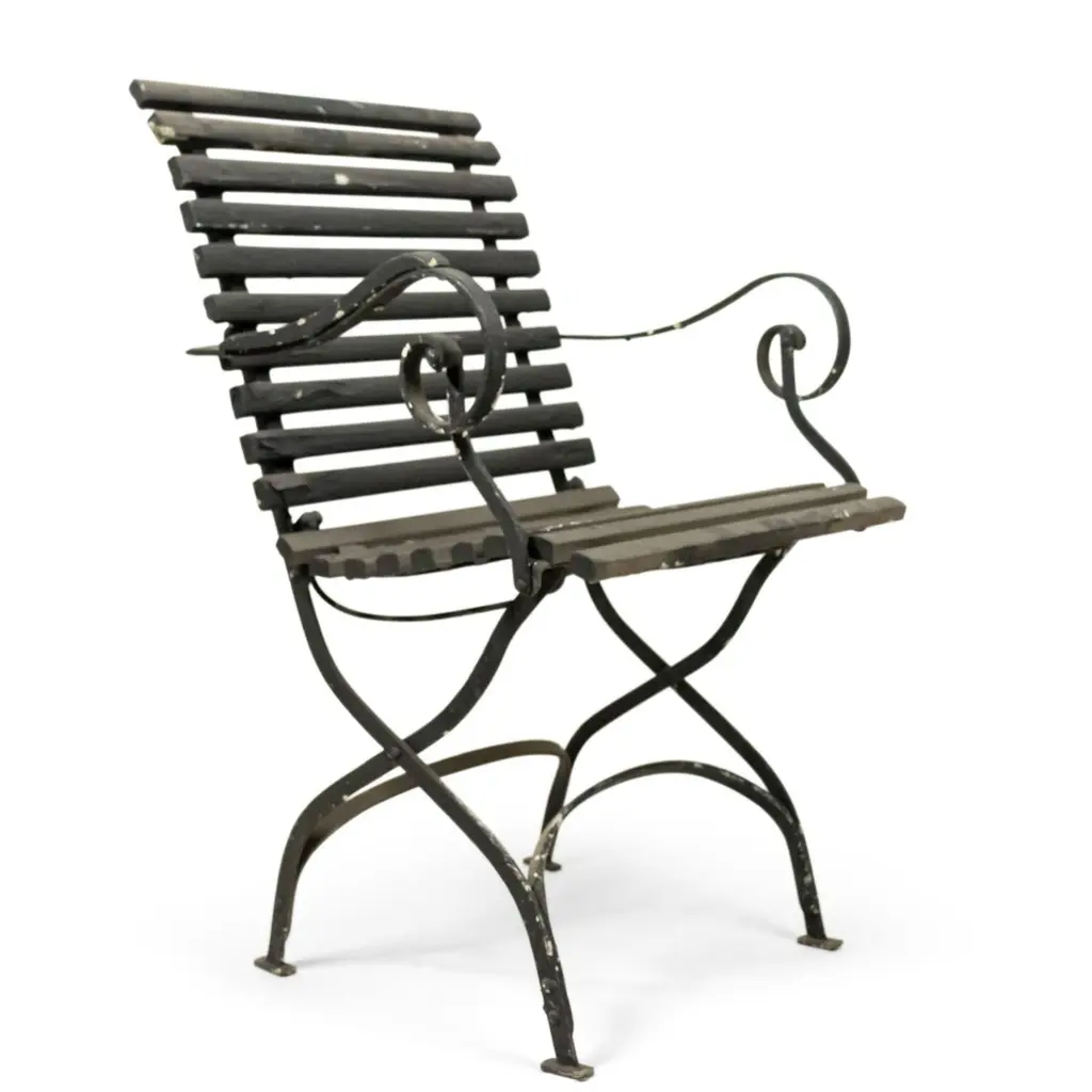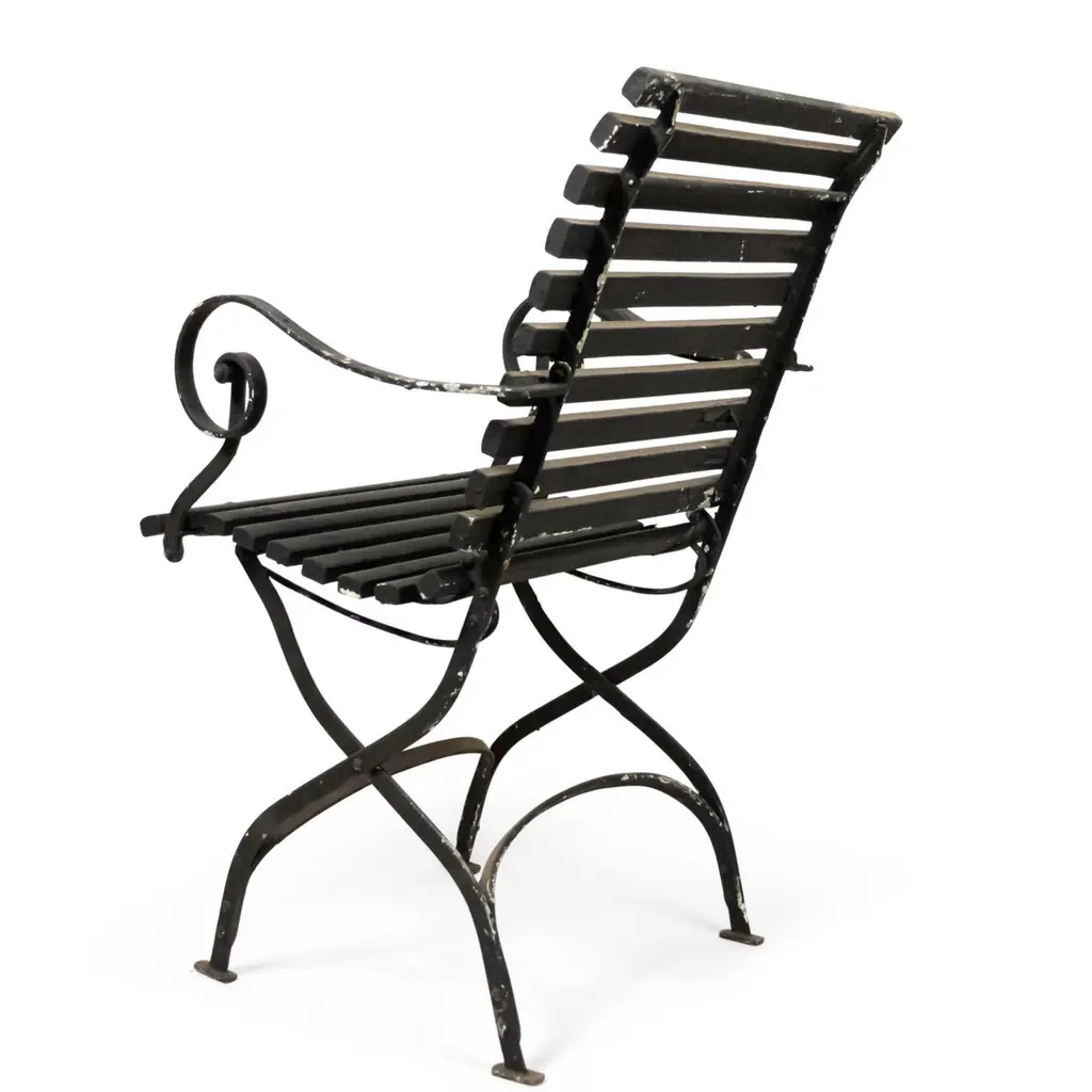 7 Outdoor (19th-20th Century) folding black painted iron arm chairs with scroll designs and slat seats and backs. (PRICED EACH)