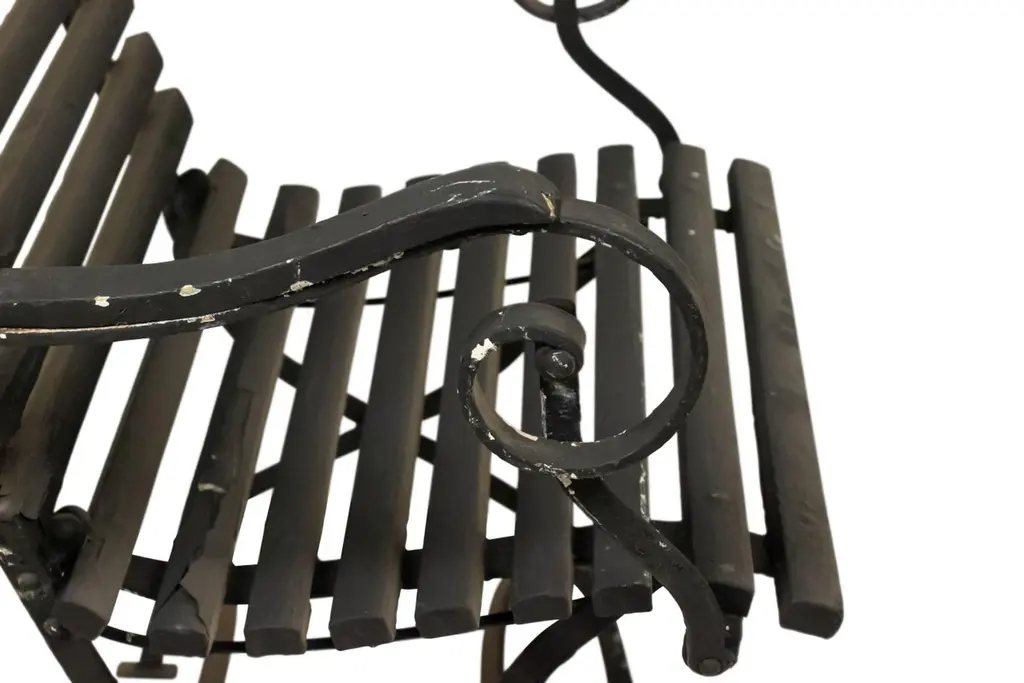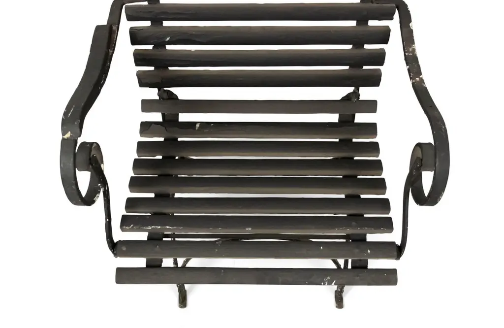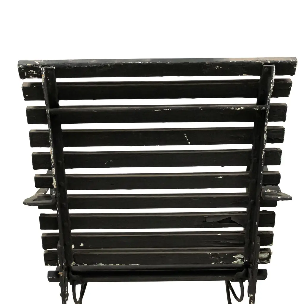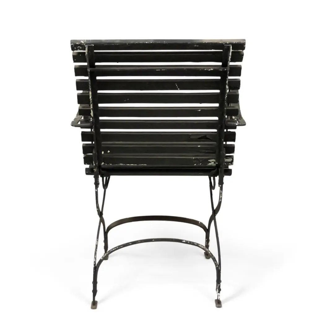 7 Outdoor (19th-20th Century) folding black painted iron arm chairs with scroll designs and slat seats and backs. (PRICED EACH)