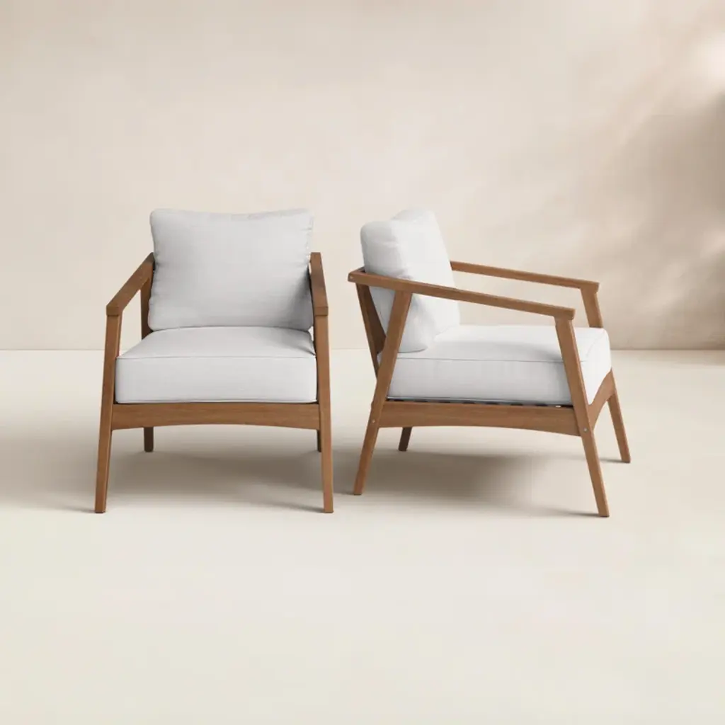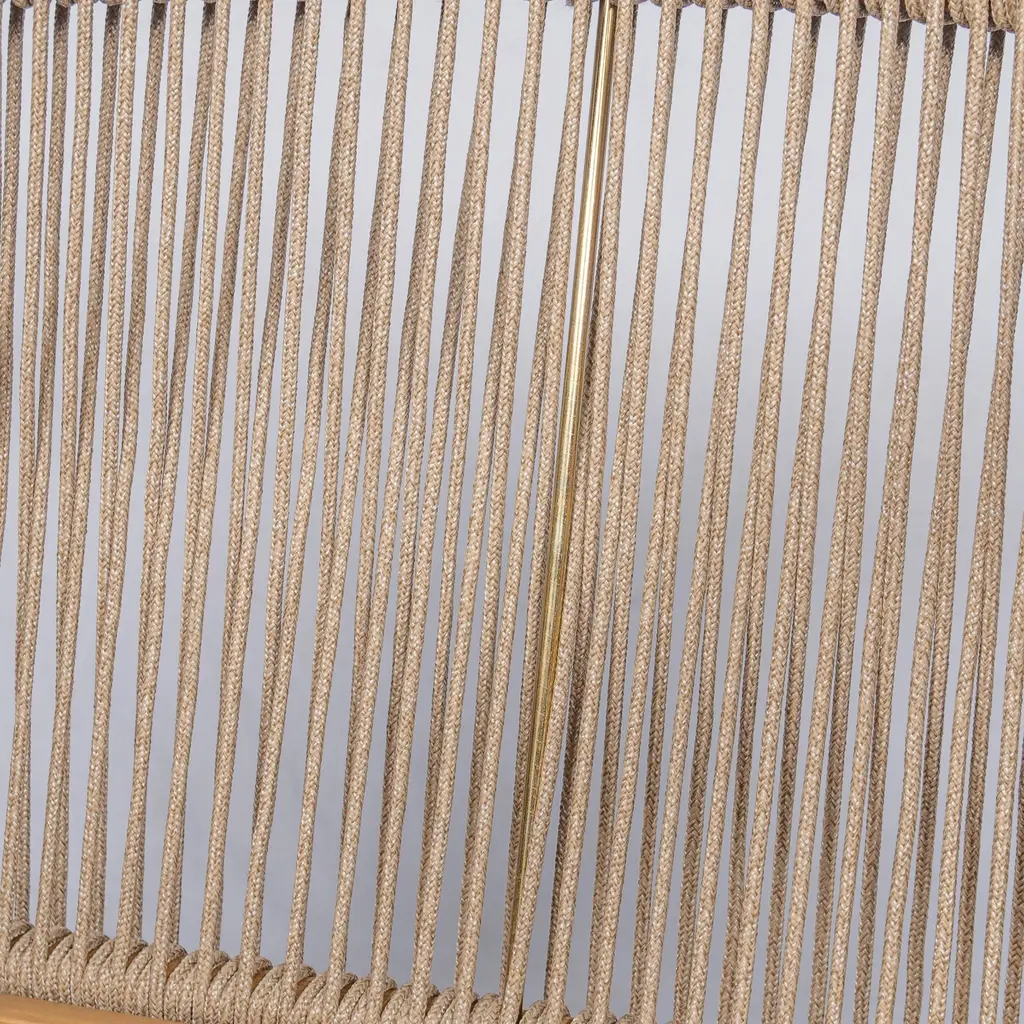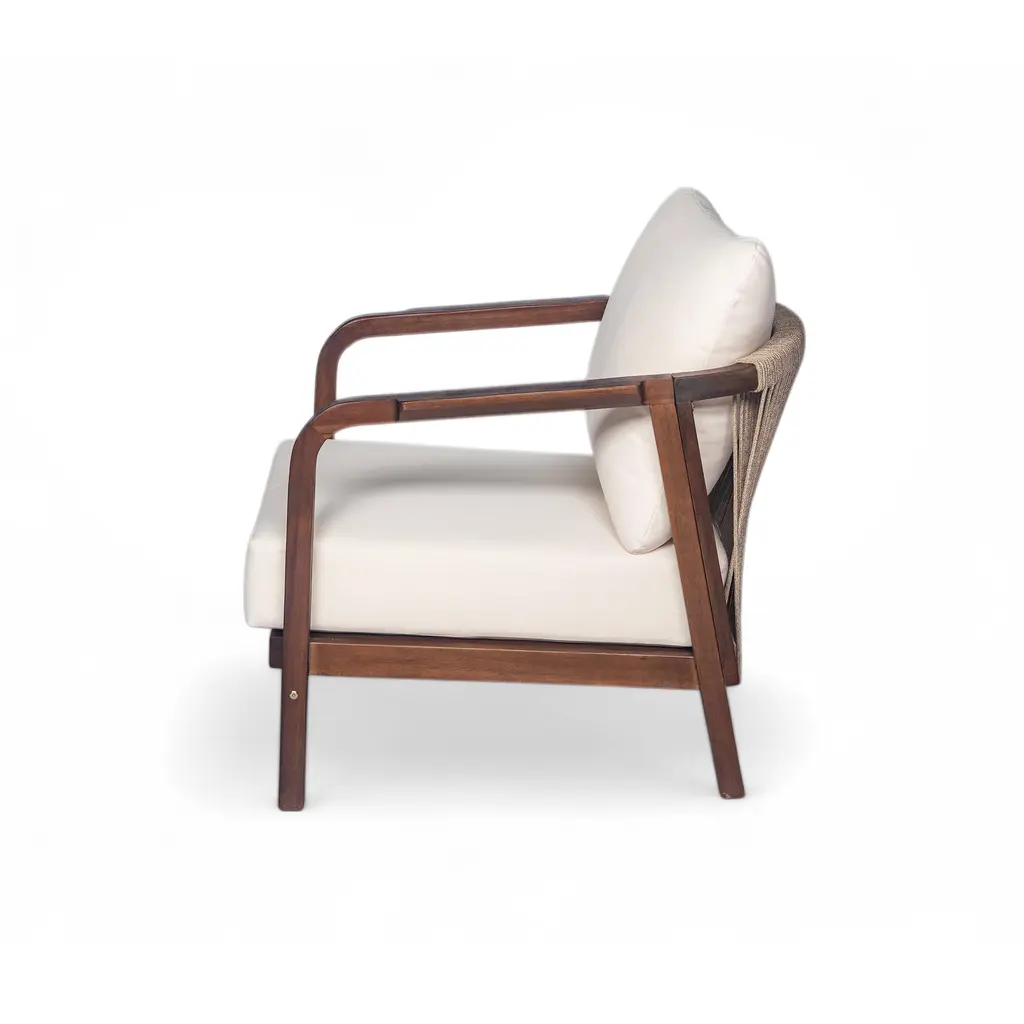This outdoor lounge chair is a true masterpiece for your outdoor haven. It combines the beauty of a solid wood frame with the comfort of plush cushions, creating an inviting and serene space. The woven backrest adds a touch of artistry and charm, making it a standout piece. Whether you're unwinding after a long day or enjoying a sunny afternoon, this chair offers the perfect retreat. Its design is not only aesthetically pleasing but also engineered for durability, ensuring it withstands the elements and provides years of enjoyment. The curved armrests provide added comfort and support, allowing you to relax in style. It's a haven of relaxation that transforms your patio or garden into a peaceful oasis.