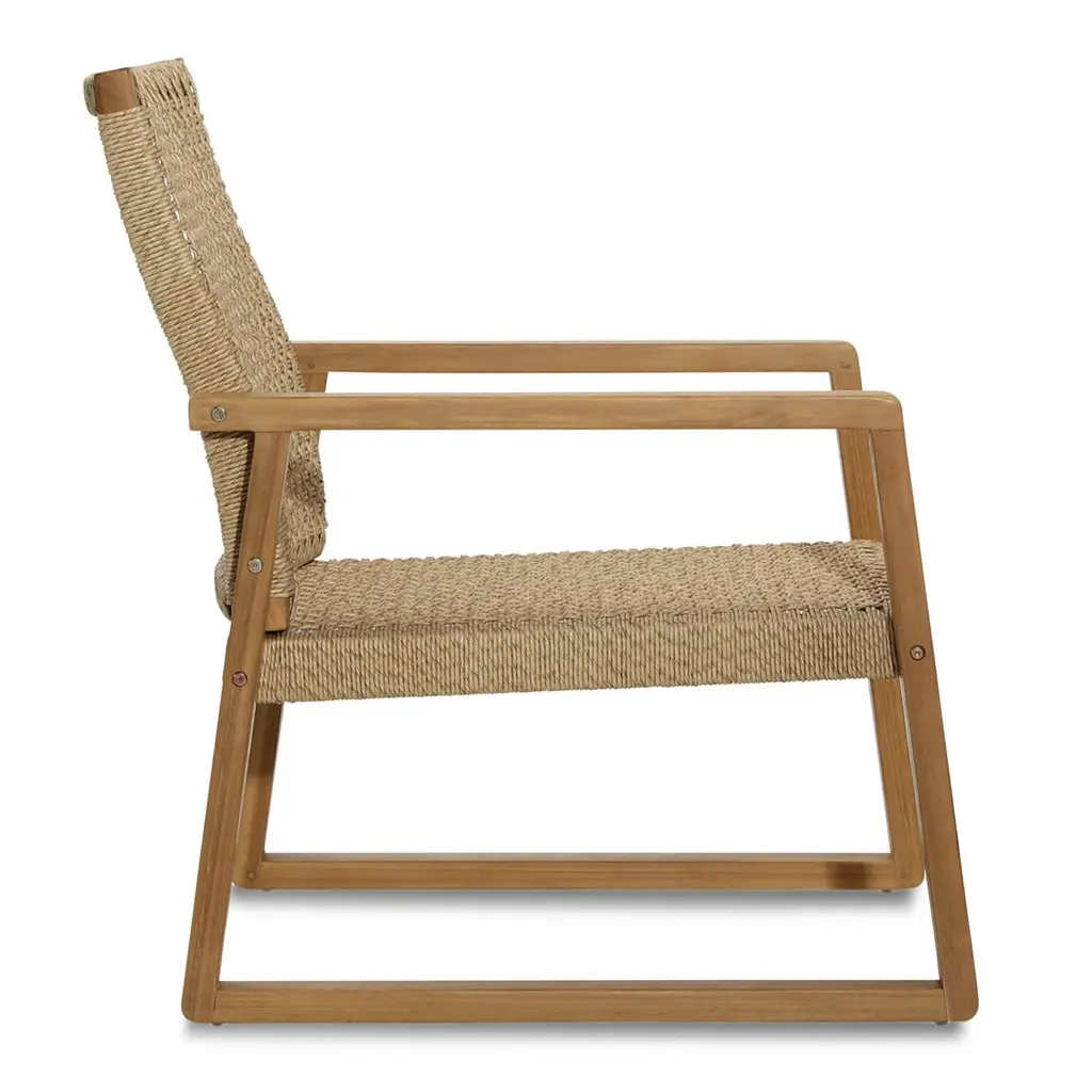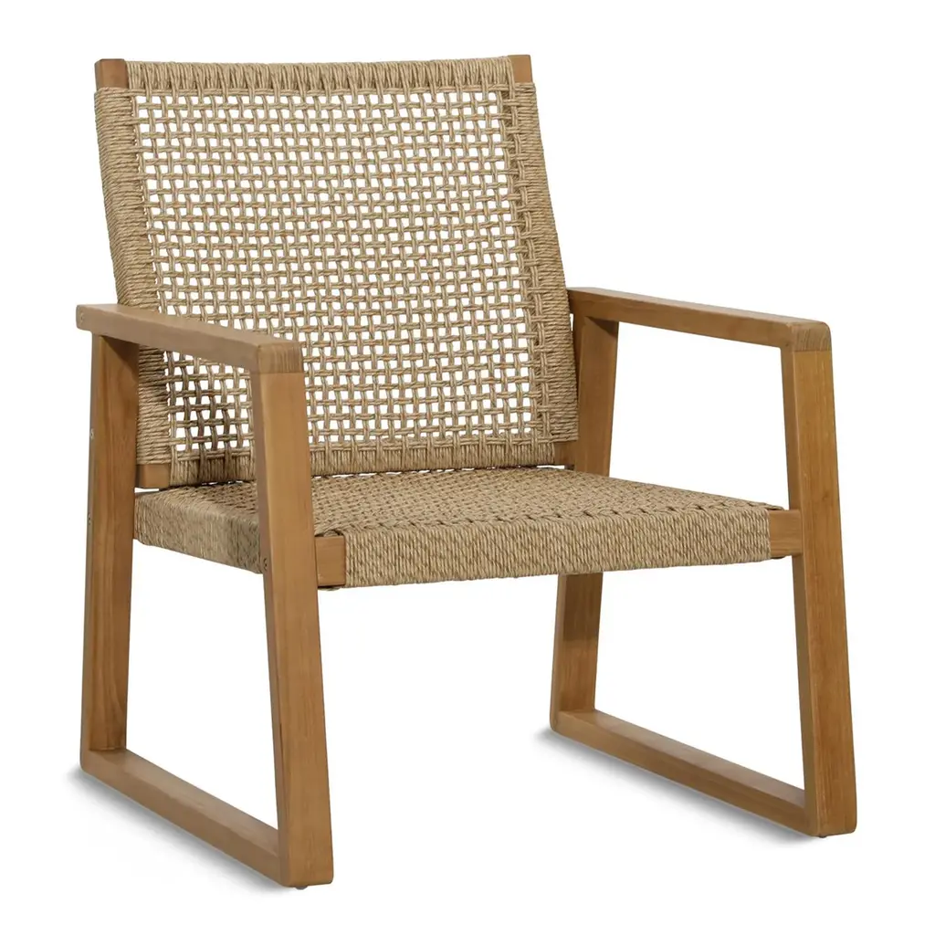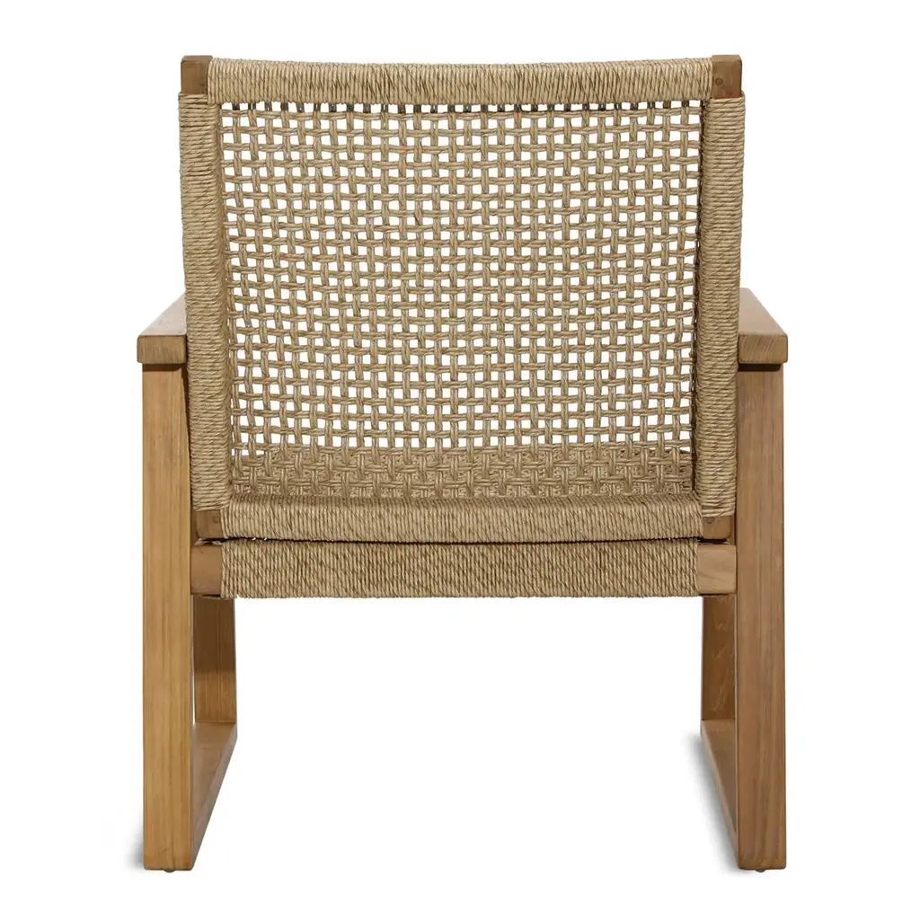Contemporary outdoor teak wood frame outdoor arm chair. Woven hyacinth and faux wicker back and seat. Each chair will vary in exact coloring, wood grain, and natural imperfections. Weighs approx. 25 lbs. Recommended for under cover use only. Exposure to the elements will change the finish.