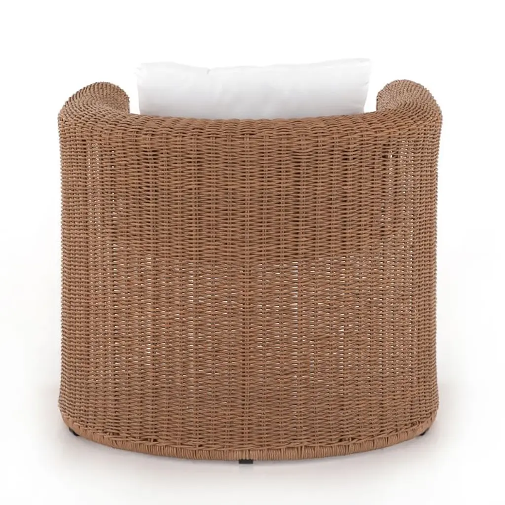 Iron frame covered in woven rattan in a Natural finish. Cushions are covered in 100% olefin upholstery in White. Seat and back cushions are foam and fiber filled. Attached seat cushion and loose back cushion with zip-off covers. For indoor or outdoor use. Made in Indonesia.