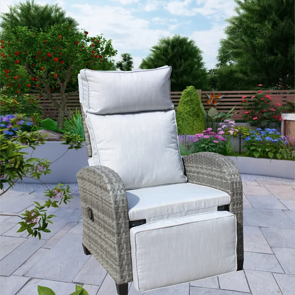 Outdoor Wicker Recliner Chair,Tall and curved backrest, wide armrests, and ample seat space design for ultimate comfort,A contemporary design and ergonomically comfortable patio seating piece to enjoy your outdoor living spaceIdeal for placement on the porch, patio, or by the pool and any outdoor settingAssemble backrest required Assemble backrest requiredTo prolong service life, extra protection will needed for some extreme weather conditions.