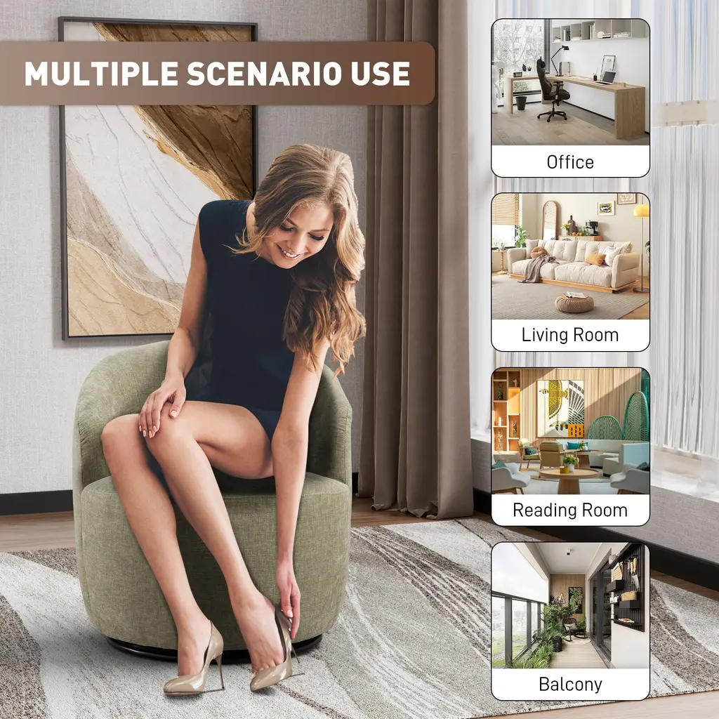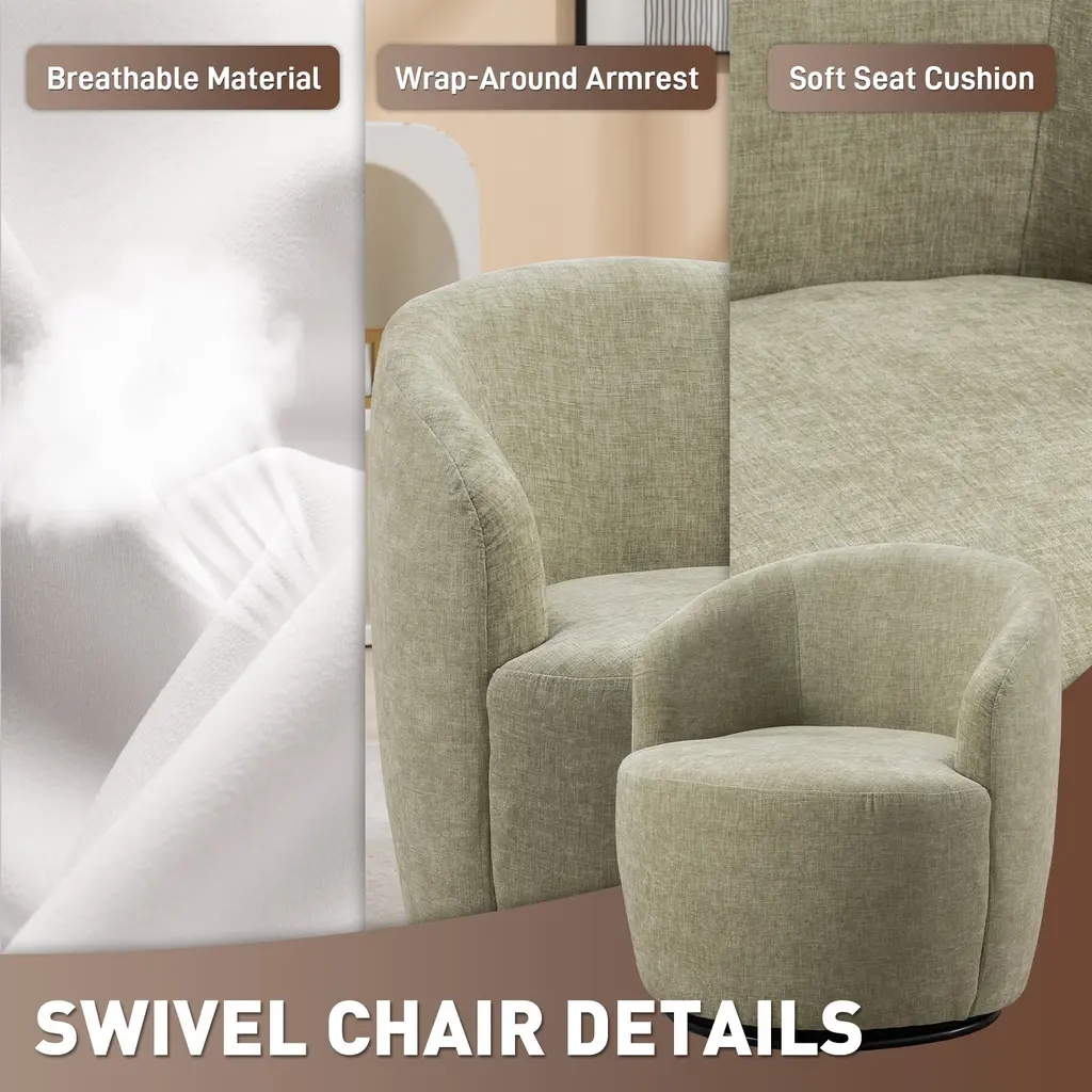Upgrade your home office, workspace or small living spaces with this swivel chair, which will be an attracting home decoration and complements with existing furniture. Made of solid pine and plywood, the frame of this swivel barrel chair rests securely on a swivel base to ensure stability and durability, with a weight capacity of 250 lbs. It is filled with high-density foam to make the seat soft and supportive. Meanwhile 13" high carved backrest can give you a hugging feeling when you rest on it to working or reading.Features:Additions:Notes: