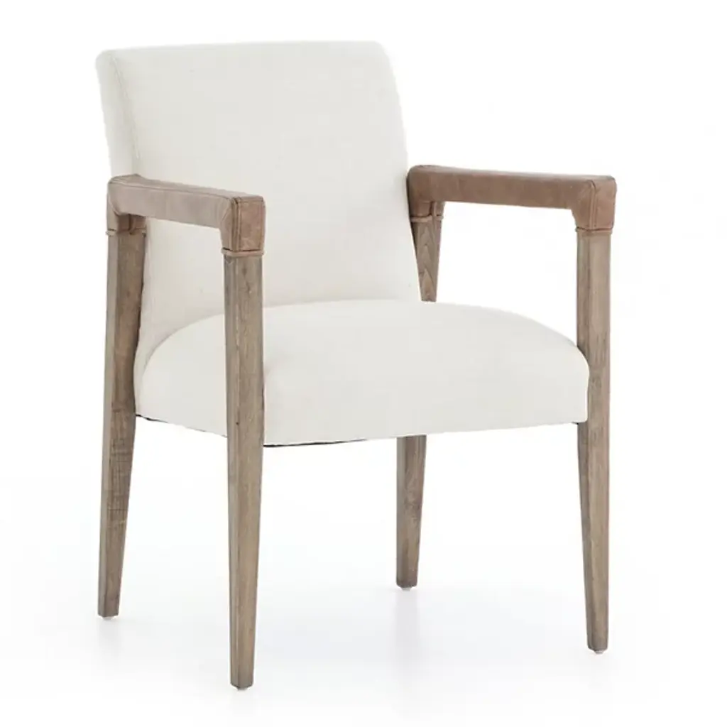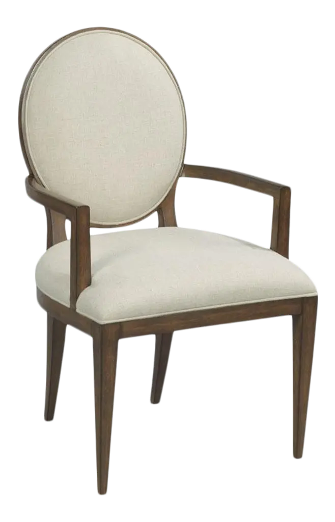 A lovely chair with an oval shaped upholstered back is joined by descending shaped arms over an upholstered seat elevated by squared tapering legs.