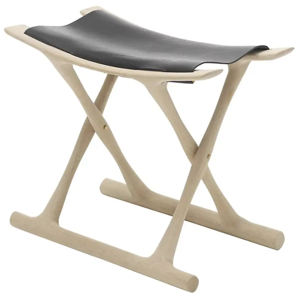 Danish Modern design inspired by ancient Egypt. The Carl Hansen OW2000 Egyptian Folding Chair has a dignified, throne-like look that you can bring with you wherever you need it. It features a smooth panel of butt leather stretched across a collapsible frame of solid wood. Designed by Ole Wanscher in 1957.
