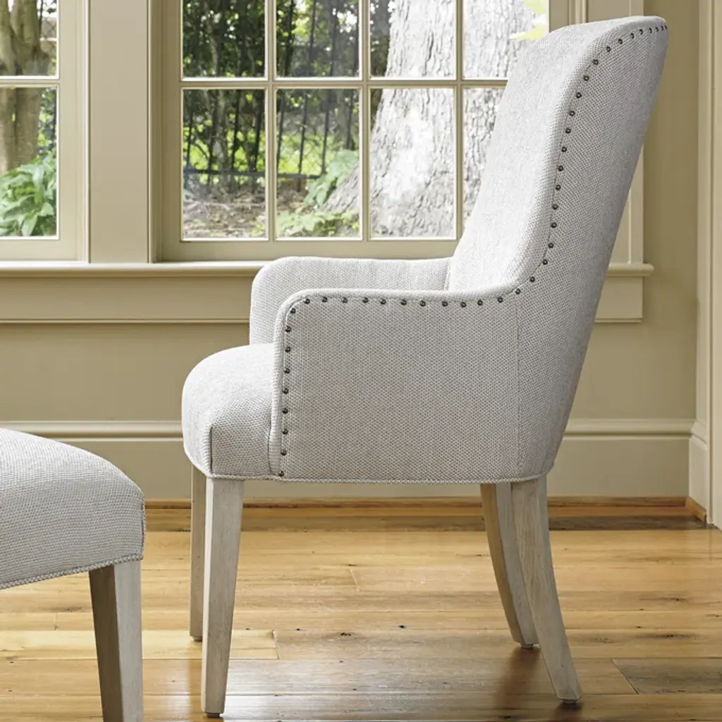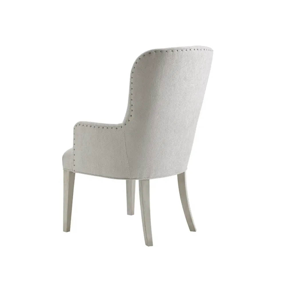 A textured basketweave fabric pattern with a soft hand enhances its tapered legs and decorative nailhead trim. A curved back and armrest provide unparalleled comfort.