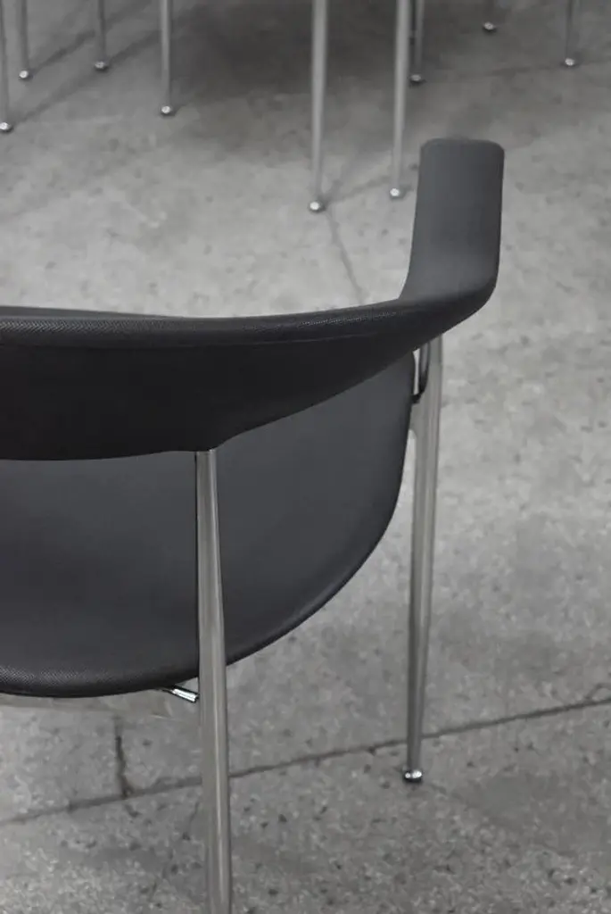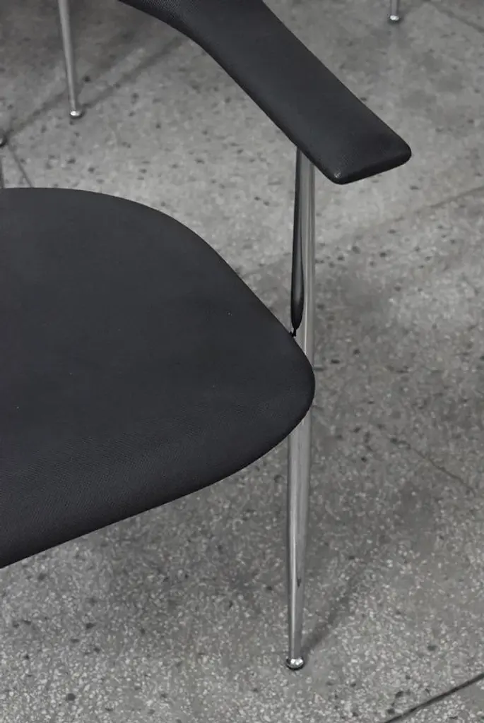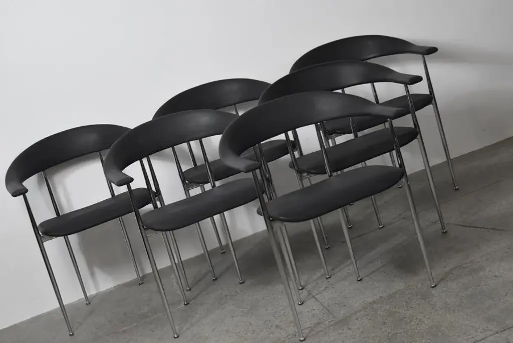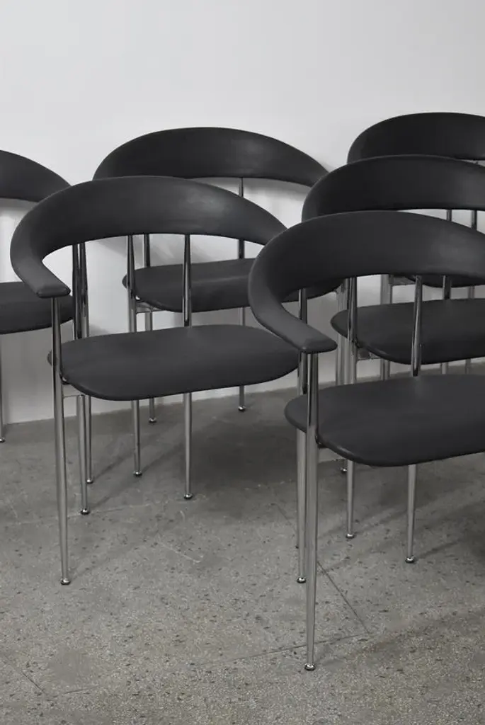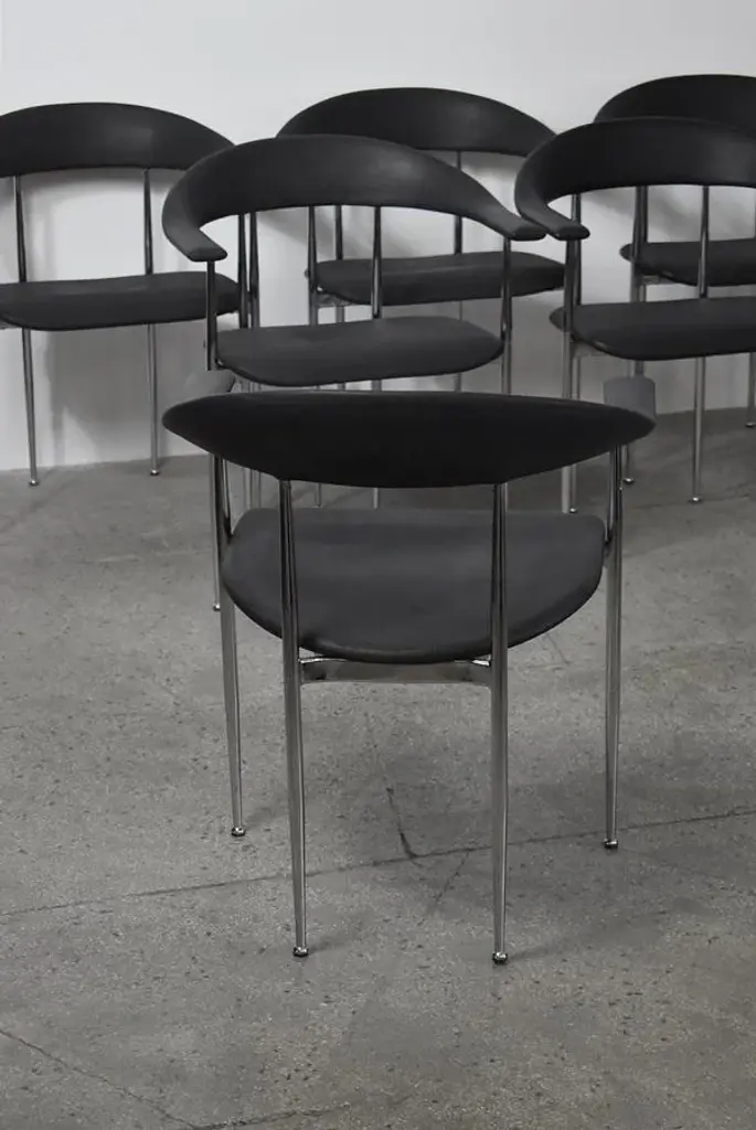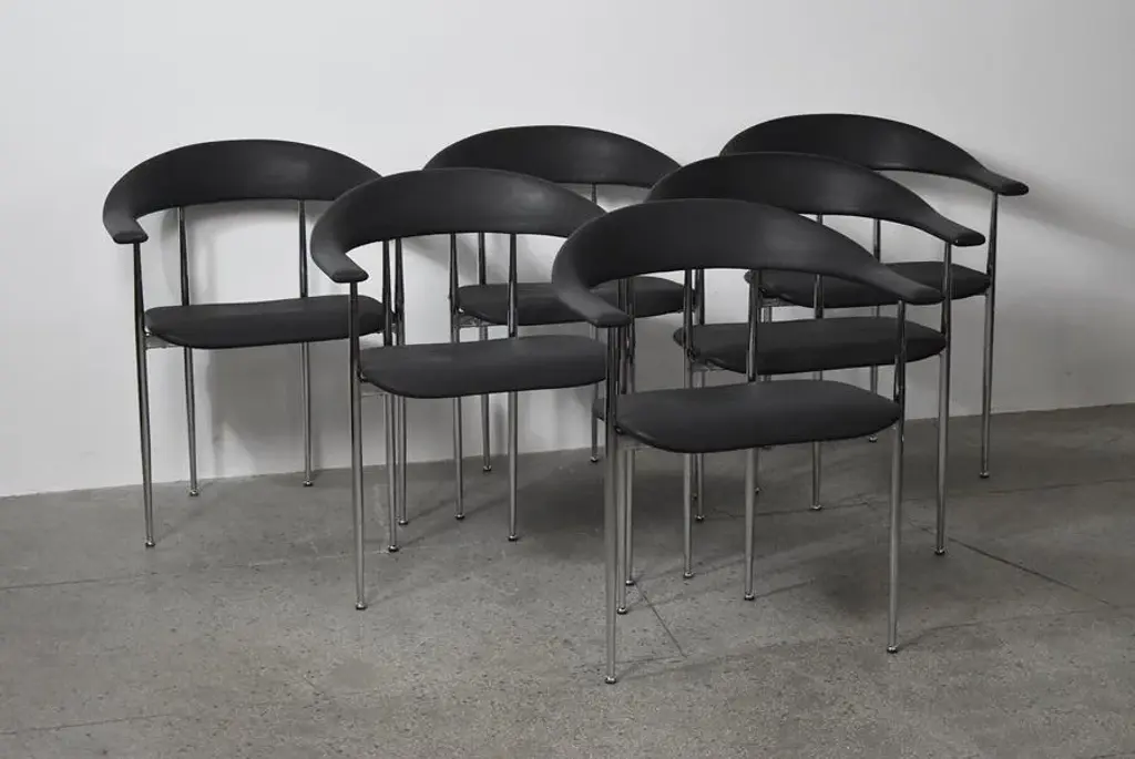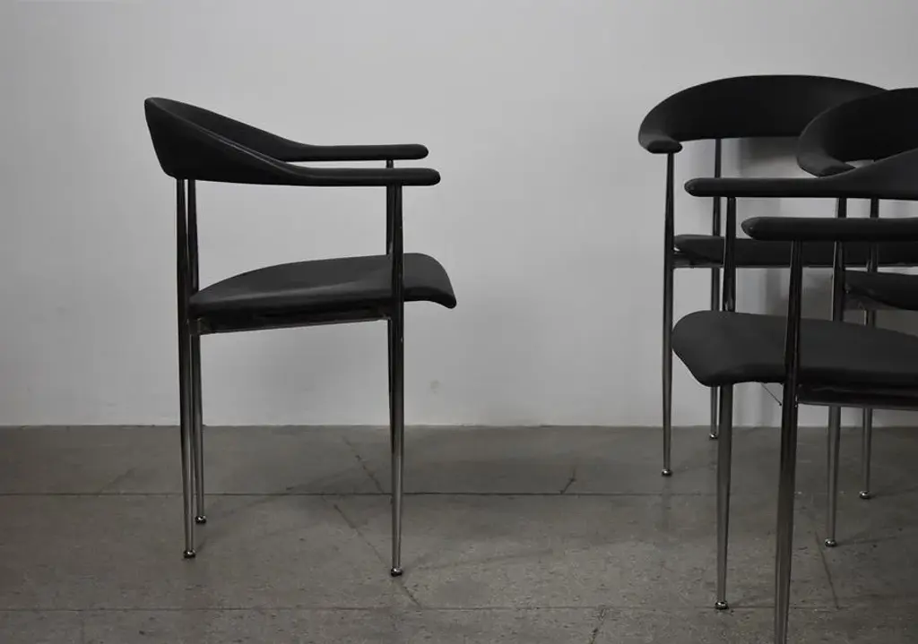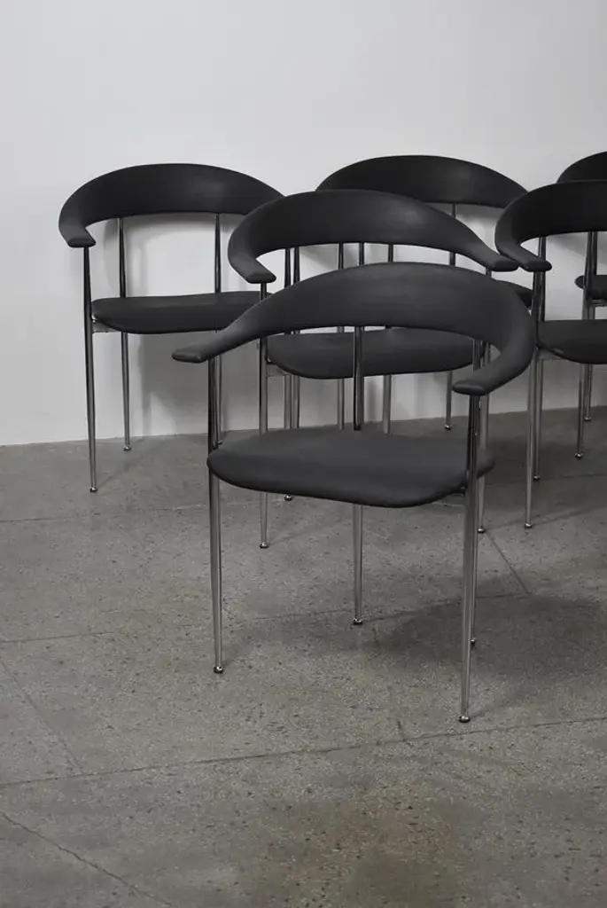 P40 chairs designed by Giancarlo Vegni and Gianfranco Gualtierotti for Fasem, Italy in 1980. The structure goes in chromed steel and the seating part comes in a remarkably textured black industrial rubber. I have official proof of authenticity such as vintage catalogs, designer records, or other literature sources and take full responsibility for any authenticity issues arising from misattribution