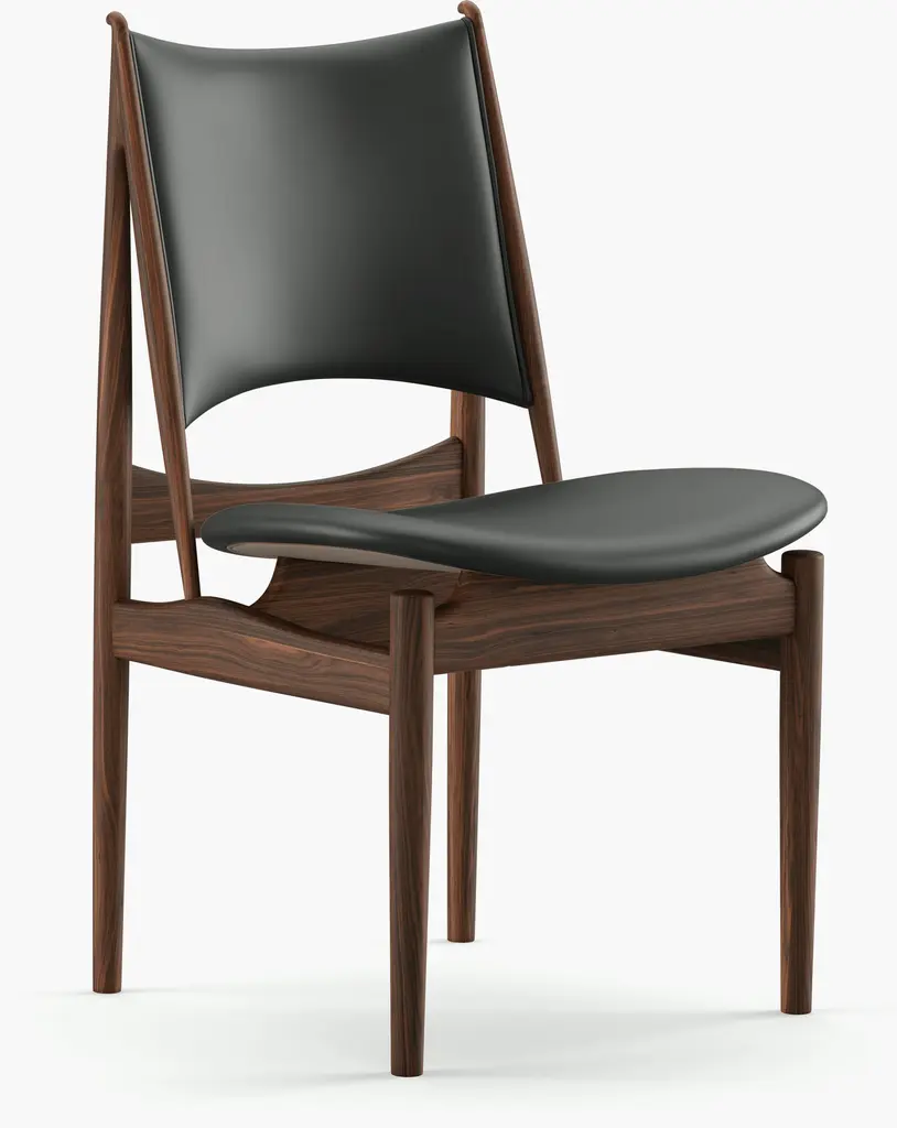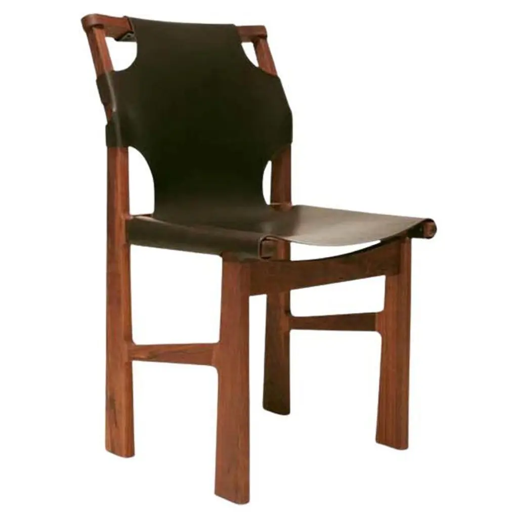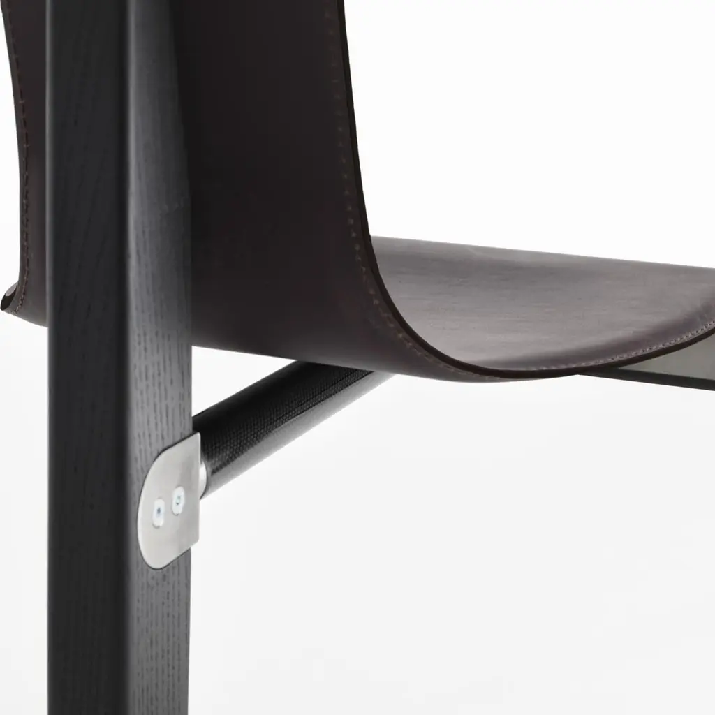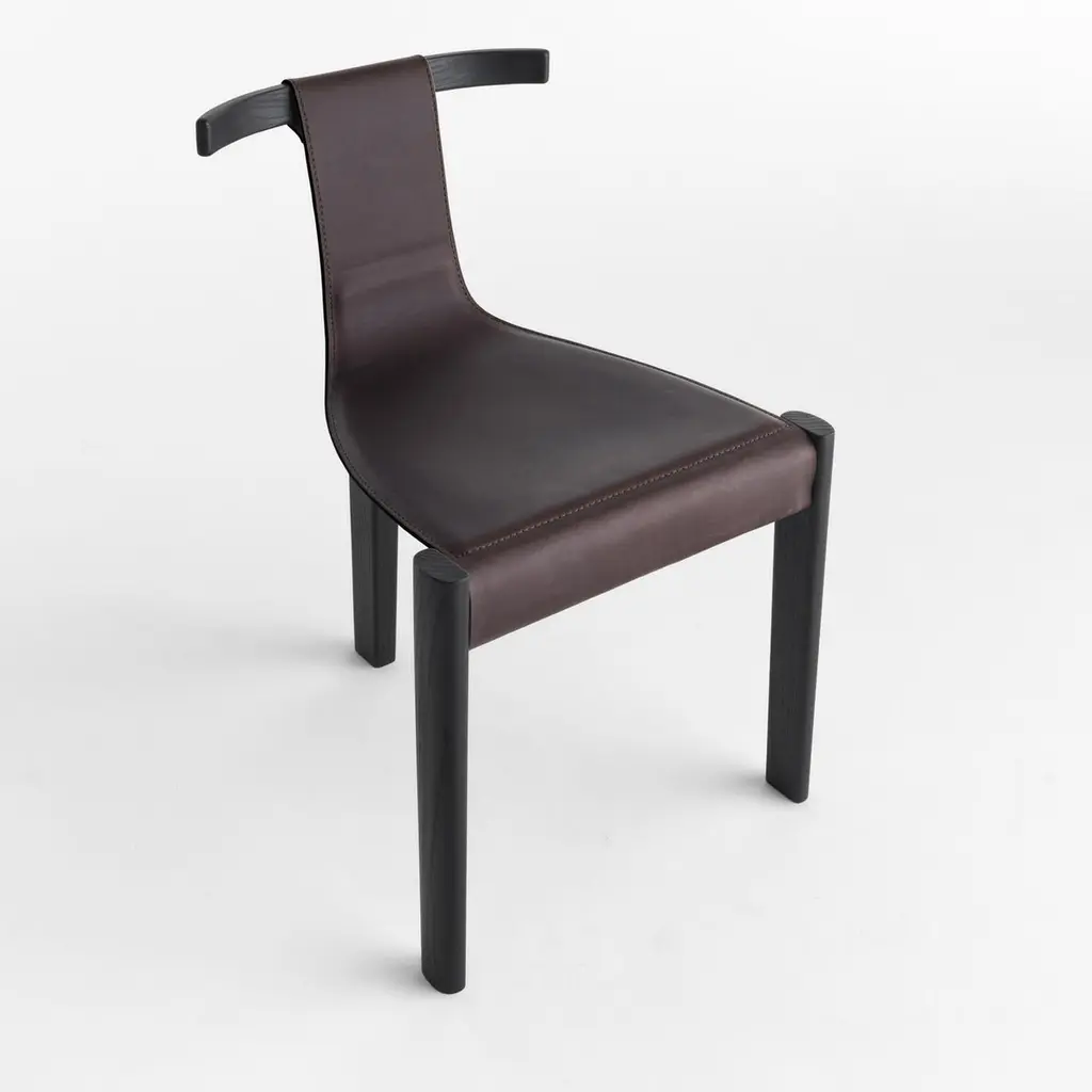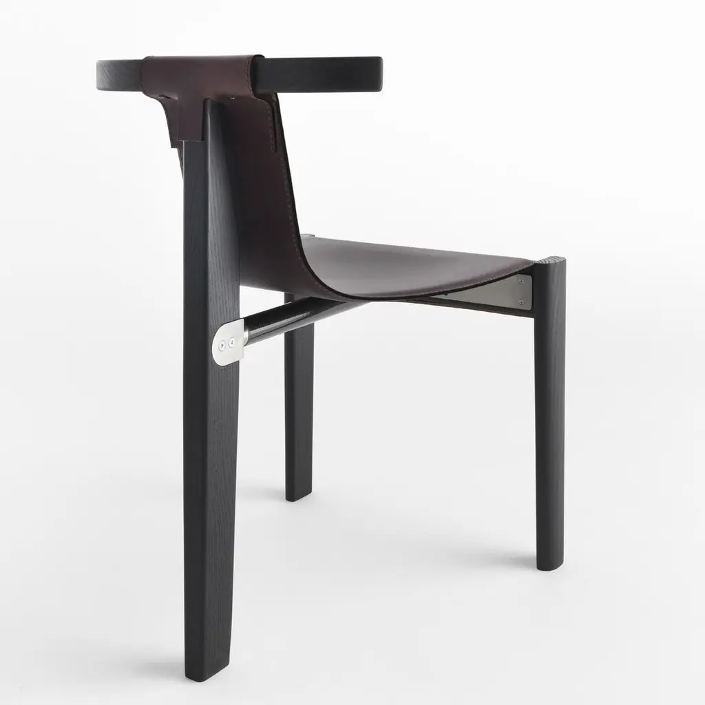 Reminiscent of Picasso’s cubist sculptures and signature style, this three-legged chair designed by Marcello Pozzi is a lightweight and refined piece of functional decor. It is composed of solid black ash supporting frame and backrest, the latter characterized by a “T” shape. The element connecting the legs combines stainless steel and carbon fiber, while the seemingly suspended seat with a metal core is padded and fully covered with leather.