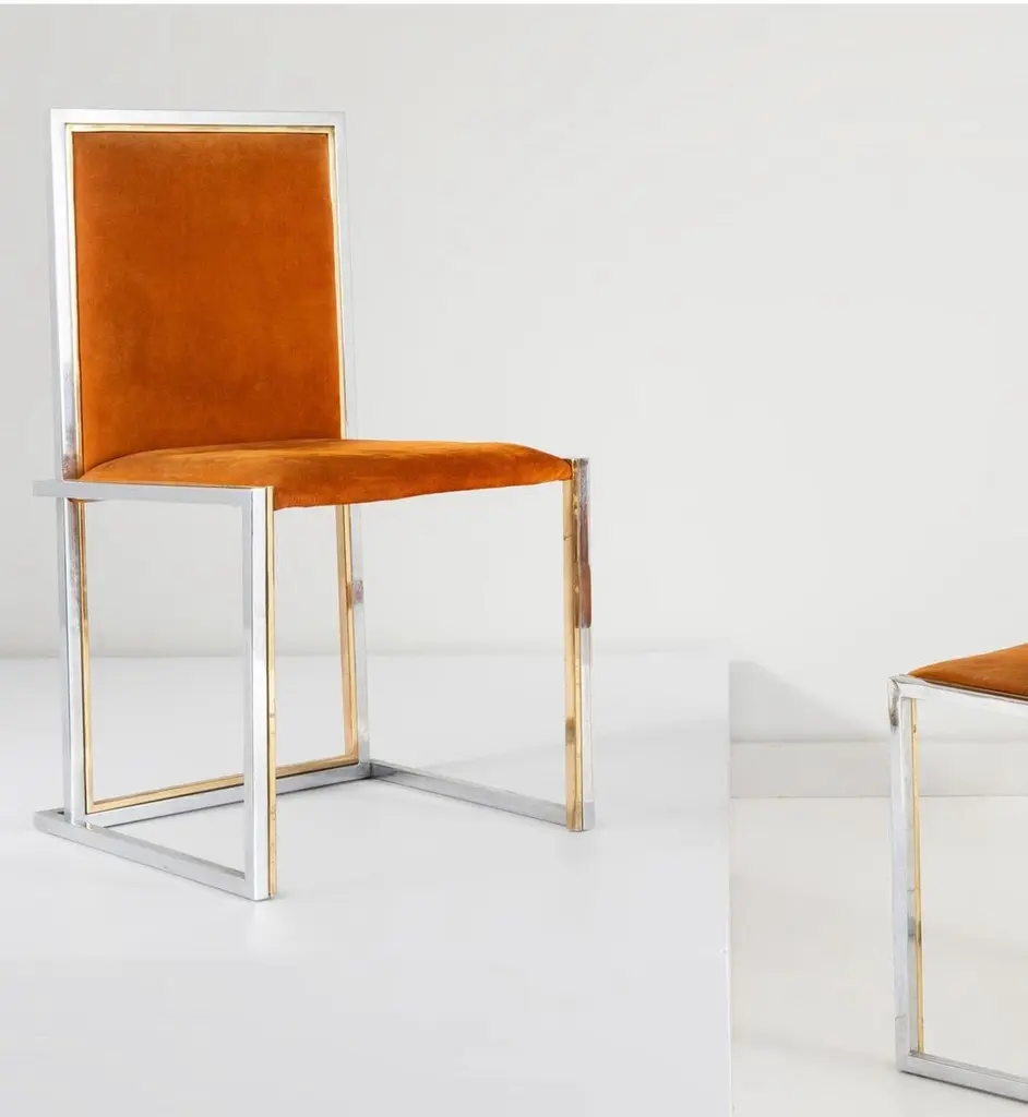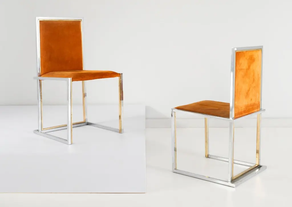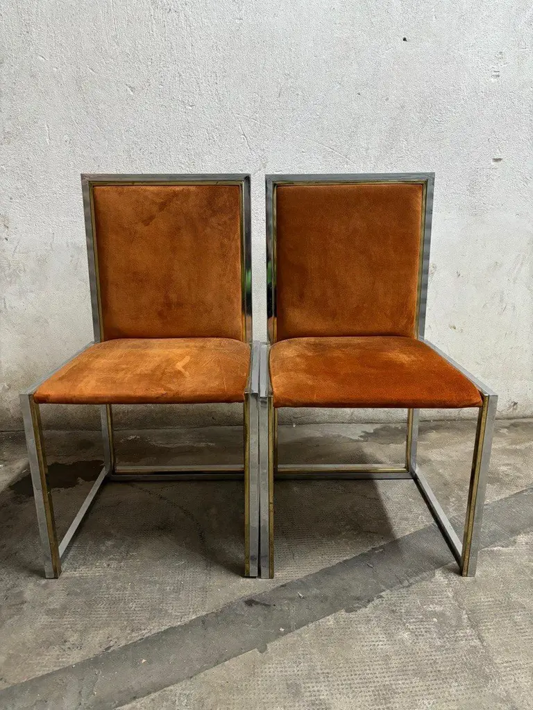 Pair of chairs in the style of Willy Rizzo 1960s Products that reflect the age of the 20th century.Mid-centurymodern.Modernity for interior decorator studio or office projects, interior designChairs that can match their quality in vintage as well as modern settings.Material: velvet suede, brass and full nickel.