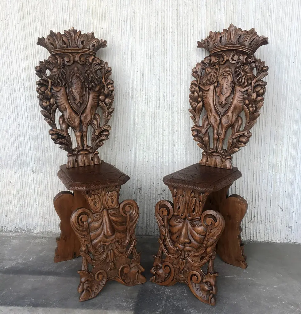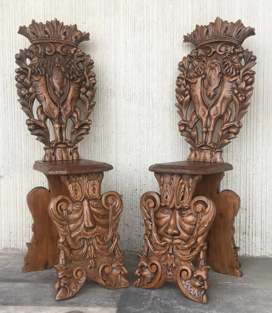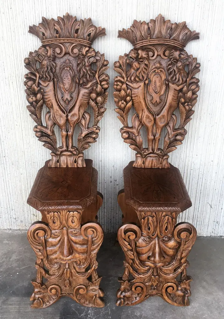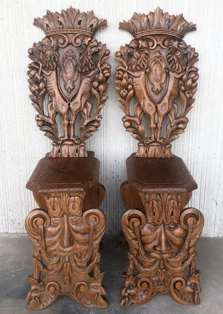 Pair of 18th century Italian Renaissance lion carved walnut Sgabello hall chairs.Pair of Flemish carved oak hall chairs, circa 1890.Profusely carved with heads, swags and foliage.Pair of antique Italy "Sgabello" carved oak chairs, circa 1790. These striking chairs with their elaborate carved details and distinctive profile are modeled after a specific type of stool with a back that first made an appearance in Renaissance Italy. These chairs never had arms because at that time it was common for only one seat in an interior to have arms and it was reserved for the most powerful person in the room. The deeply carved surfaces seen on these chairs recall the time when the inside of a home was illuminated only by the natural light cast by a blazing fire and flaming candles. This kind of light casts dramatic shadows and lends itself to sculptural carving. Please take a moment to enlarge each photograph provided to see the skill exerted by the artisan who made these chairs. The overall balance of the symmetrically placed motifs of scrolls and flourishes is immediately evident and their voluptuous quality recalls the best of Baroque Italian design. Interestingly a "sgabello" chair was kept against the wall in the anteroom or hallway where it remains flat against the wall. This use explains the flat linear quality possessed by the chairs when seen from the side. Obviously these were not chairs designed to loll about in decadent pleasure but rather emblems of a powerful family with a well furnished interior.These chairs will be a strong decorative statement is the entry or hallway of a modern home because of their uniquely sculptural shape.