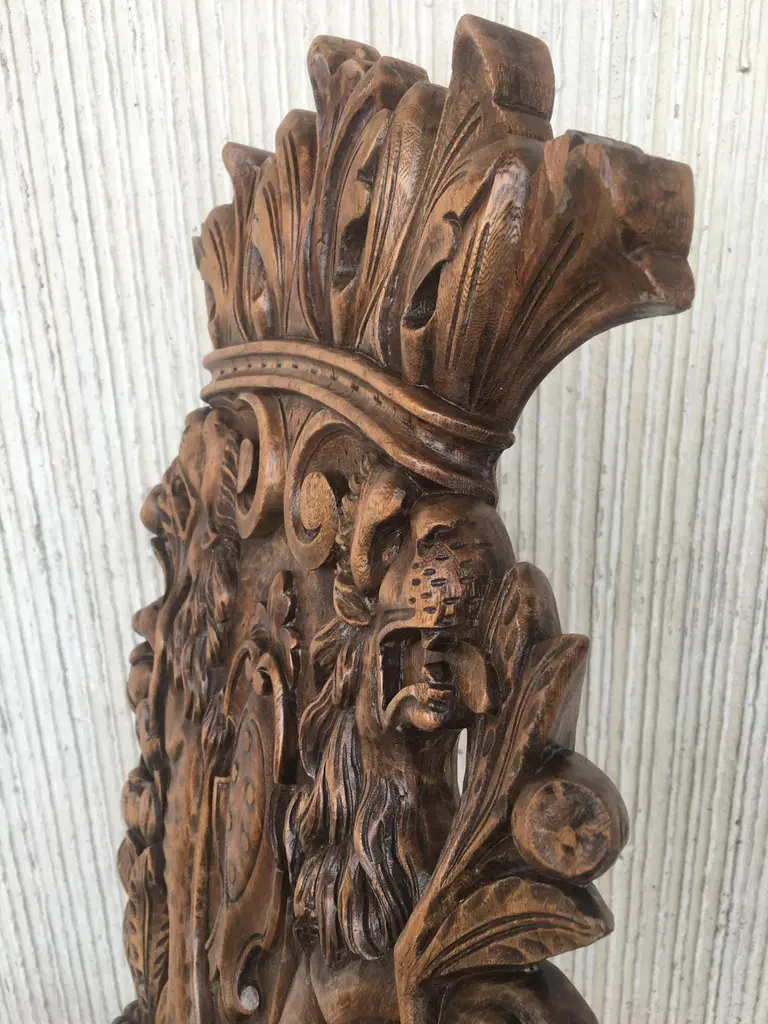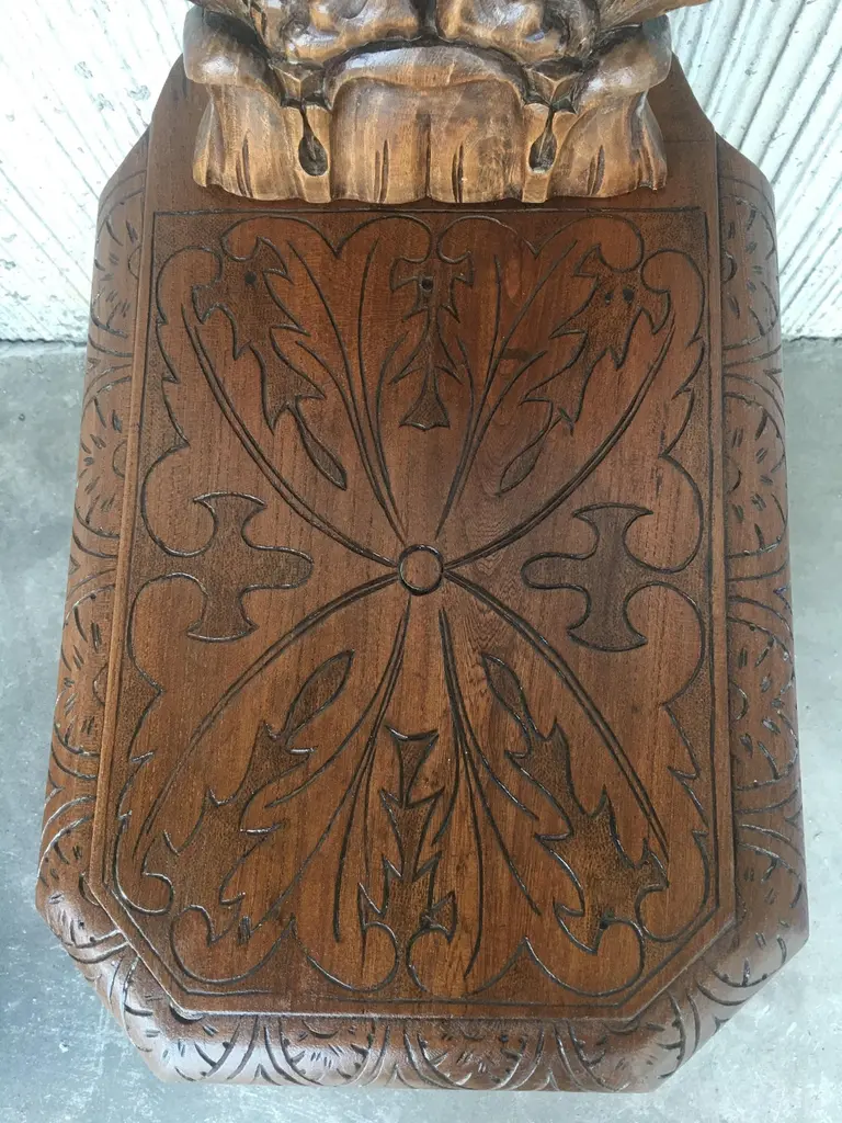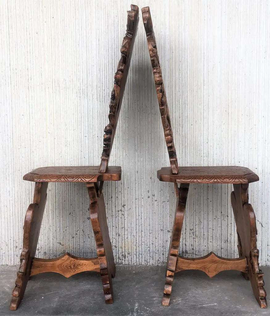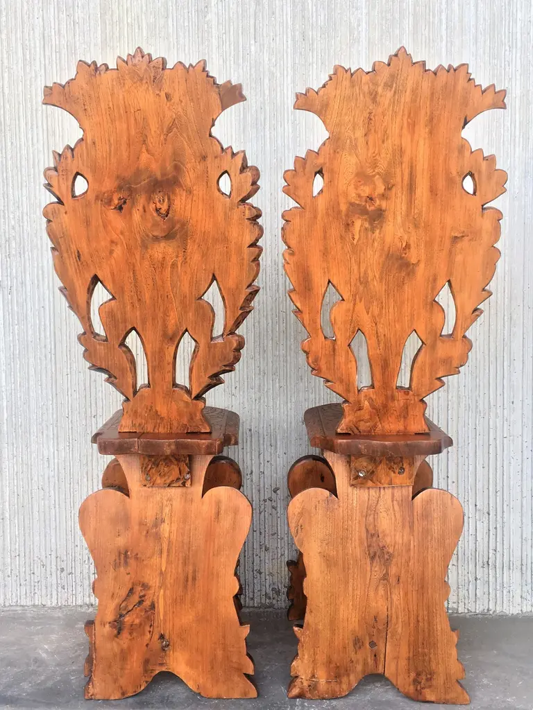 Pair of 18th century Italian Renaissance lion carved walnut Sgabello hall chairs.Pair of Flemish carved oak hall chairs, circa 1890.Profusely carved with heads, swags and foliage.Pair of antique Italy "Sgabello" carved oak chairs, circa 1790. These striking chairs with their elaborate carved details and distinctive profile are modeled after a specific type of stool with a back that first made an appearance in Renaissance Italy. These chairs never had arms because at that time it was common for only one seat in an interior to have arms and it was reserved for the most powerful person in the room. The deeply carved surfaces seen on these chairs recall the time when the inside of a home was illuminated only by the natural light cast by a blazing fire and flaming candles. This kind of light casts dramatic shadows and lends itself to sculptural carving. Please take a moment to enlarge each photograph provided to see the skill exerted by the artisan who made these chairs. The overall balance of the symmetrically placed motifs of scrolls and flourishes is immediately evident and their voluptuous quality recalls the best of Baroque Italian design. Interestingly a "sgabello" chair was kept against the wall in the anteroom or hallway where it remains flat against the wall. This use explains the flat linear quality possessed by the chairs when seen from the side. Obviously these were not chairs designed to loll about in decadent pleasure but rather emblems of a powerful family with a well furnished interior.These chairs will be a strong decorative statement is the entry or hallway of a modern home because of their uniquely sculptural shape.