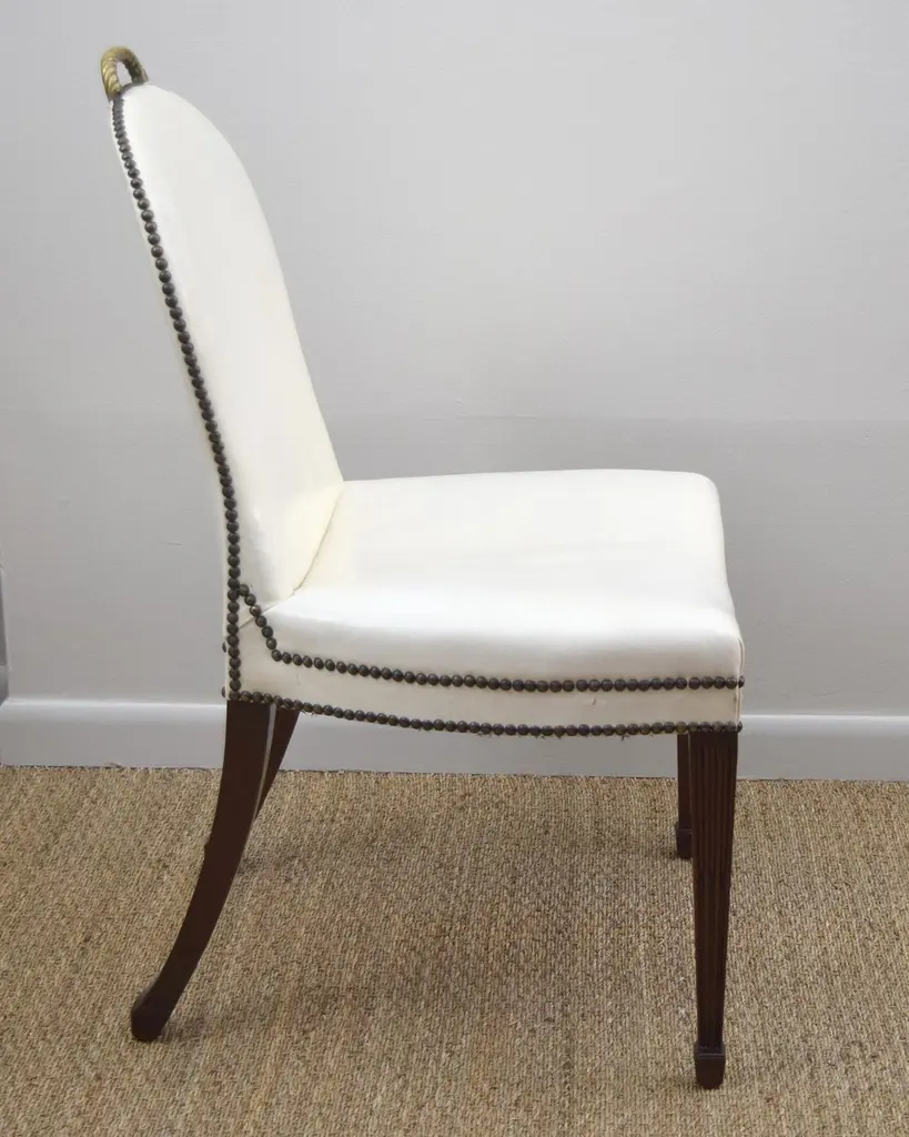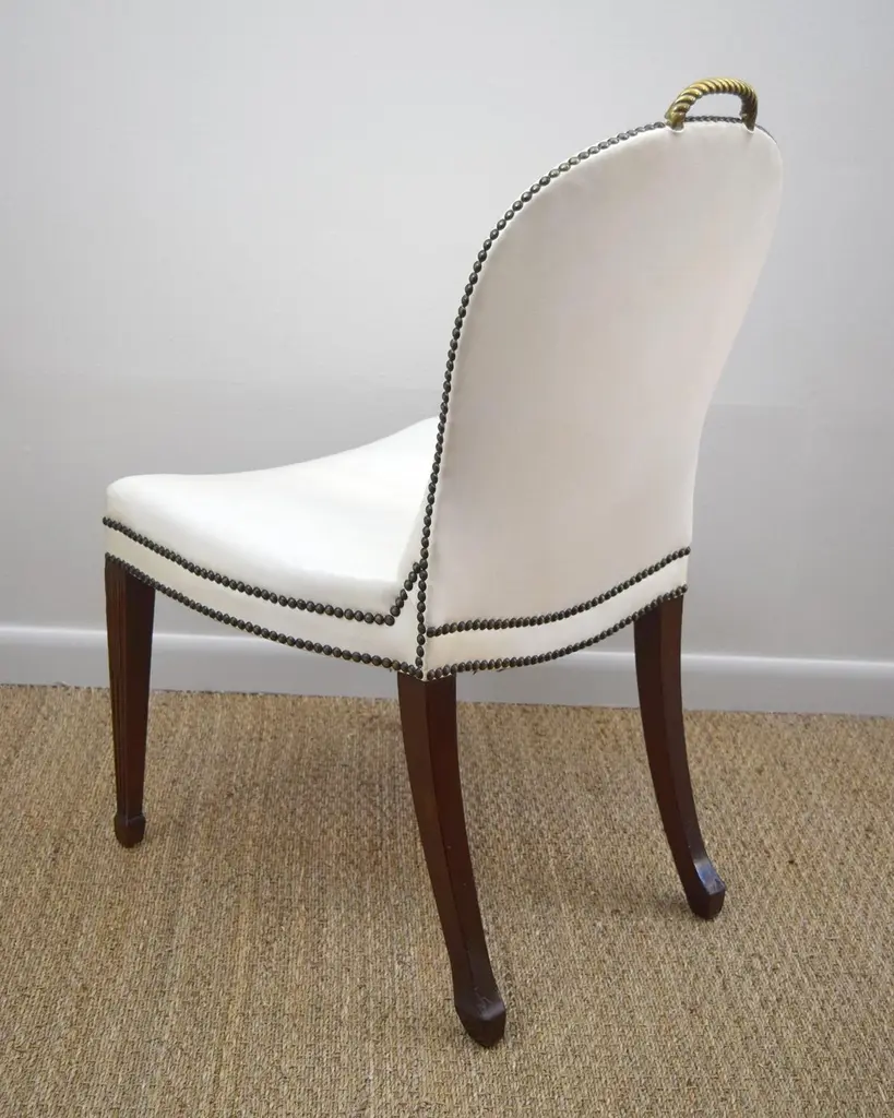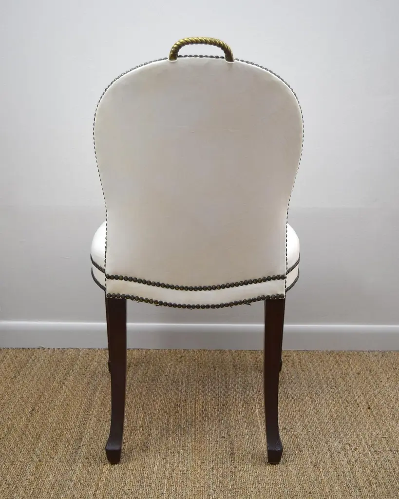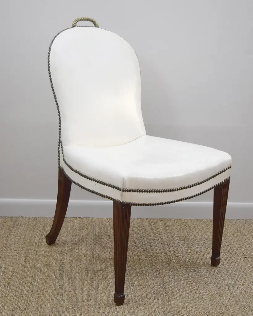 These over-scaled chairs were said to have been designed by Chicago architect Sam Marx, but they were probably made by William Quigley, whose workshop and showroom supplied him with furniture. The sweeping lines of the back and seat, the white leather upholstery studded with nailheads, and the fluted mahogany legs, are a sleek riff on the George III style. The brass-rope handles allow the chairs to be dragged easily hither and yon.