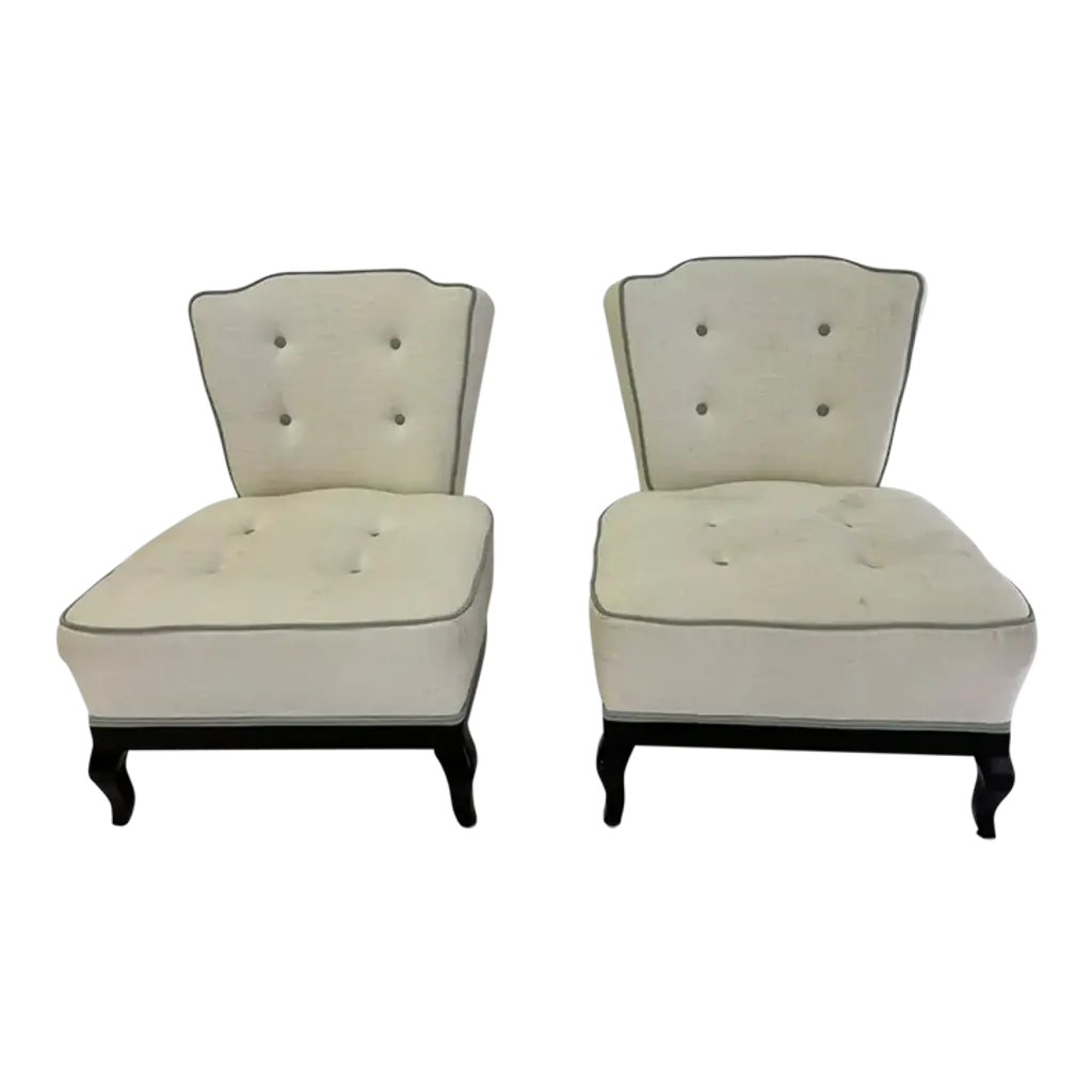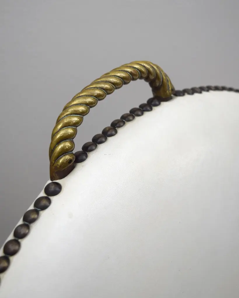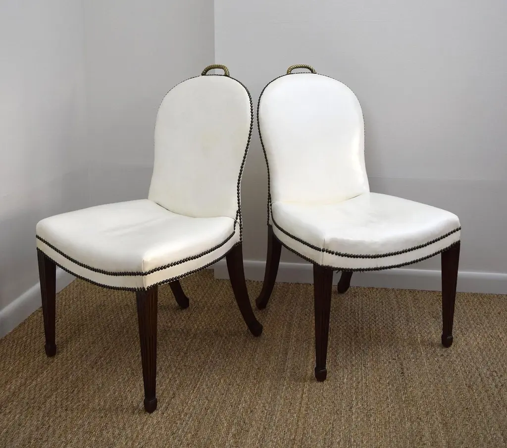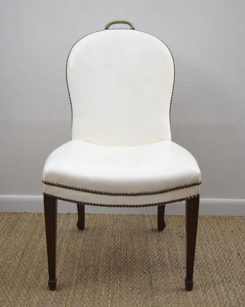 These over-scaled chairs were said to have been designed by Chicago architect Sam Marx, but they were probably made by William Quigley, whose workshop and showroom supplied him with furniture. The sweeping lines of the back and seat, the white leather upholstery studded with nailheads, and the fluted mahogany legs, are a sleek riff on the George III style. The brass-rope handles allow the chairs to be dragged easily hither and yon.