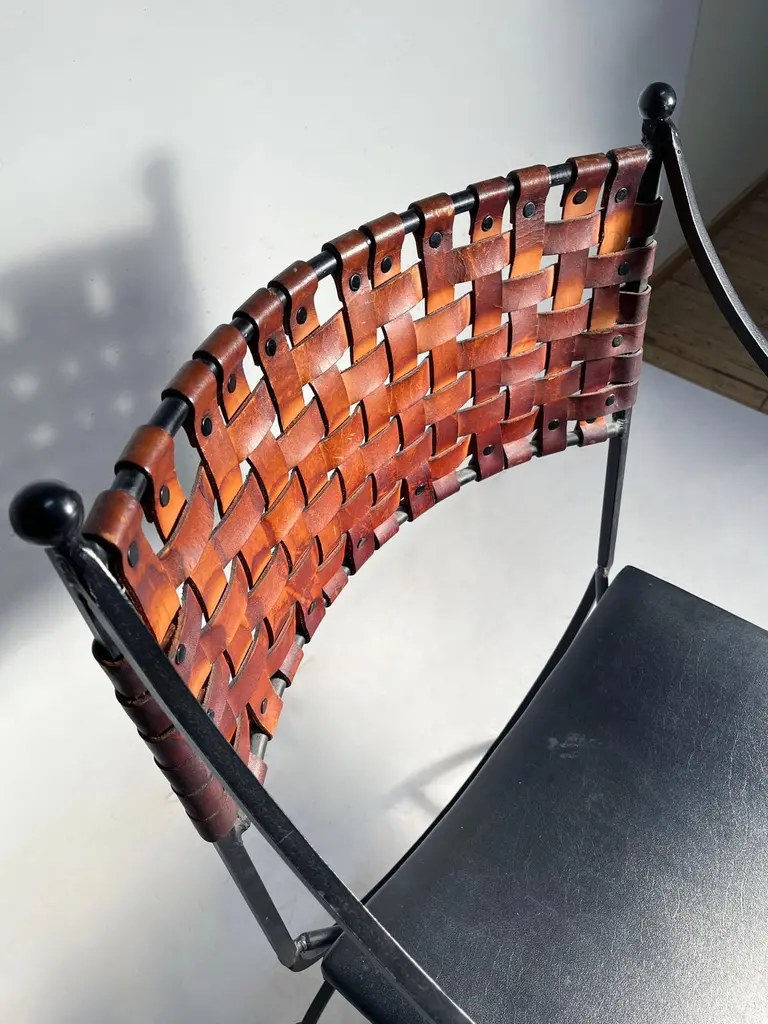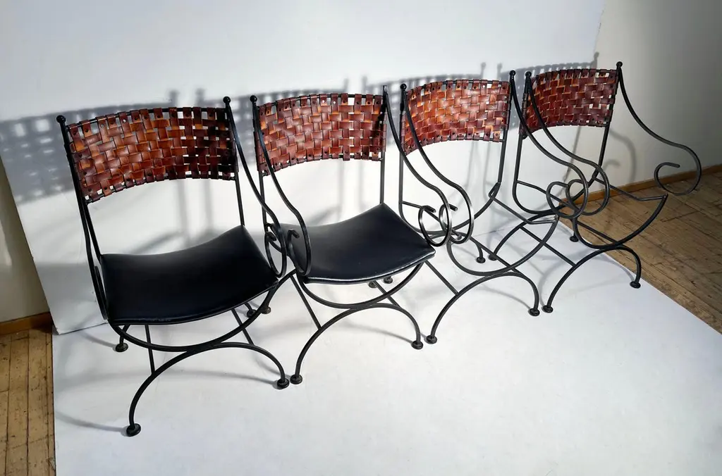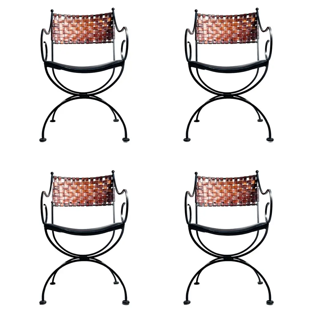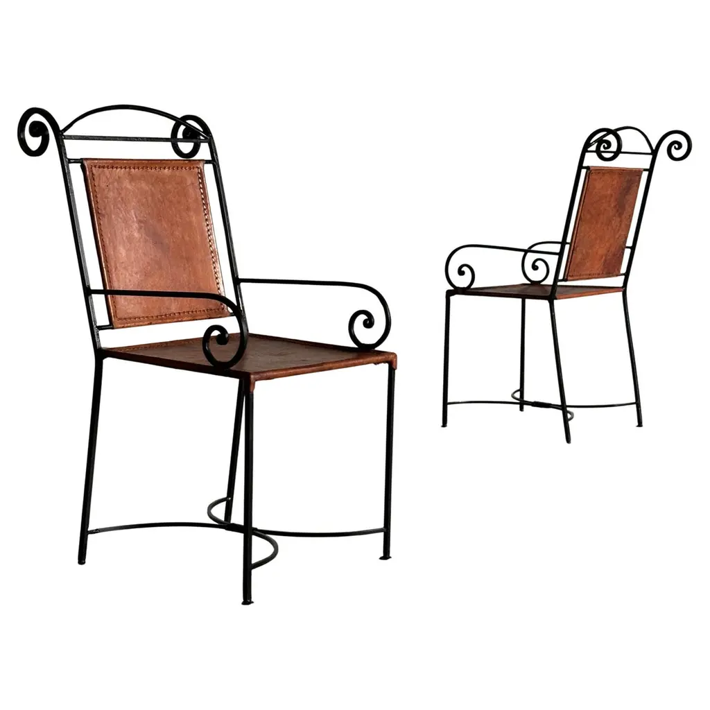 Pair of Wrought Iron Arthur Umanoff Scroll Arm Chairs with Leather Strapping4 Available. Sold in Pairs on this listingOverall pretty good condition. Some wear to the leather strapping. One of the straps appears to have damage to the grommet area and is loose. Missing one of the little black plastic finial sphere caps that simply go over the iron tip at top. Please request additional photos for condition report. upholstery is also original with some minor wear.We have all 4 upholstered seats though 2 are not shown in one photo. Please reach out for dealer shipping quote.Manner of Paul Mccobb and Milo Baughman