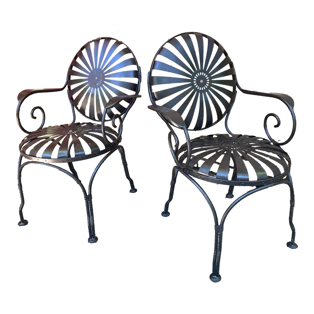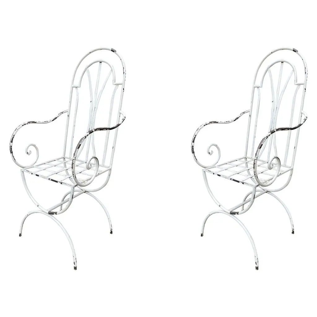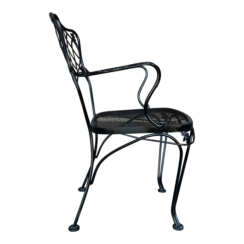 Pair of Wrought Iron Arthur Umanoff Scroll Arm Chairs with Leather Strapping4 Available. Sold in Pairs on this listingOverall pretty good condition. Some wear to the leather strapping. One of the straps appears to have damage to the grommet area and is loose. Missing one of the little black plastic finial sphere caps that simply go over the iron tip at top. Please request additional photos for condition report. upholstery is also original with some minor wear.We have all 4 upholstered seats though 2 are not shown in one photo. Please reach out for dealer shipping quote.Manner of Paul Mccobb and Milo Baughman