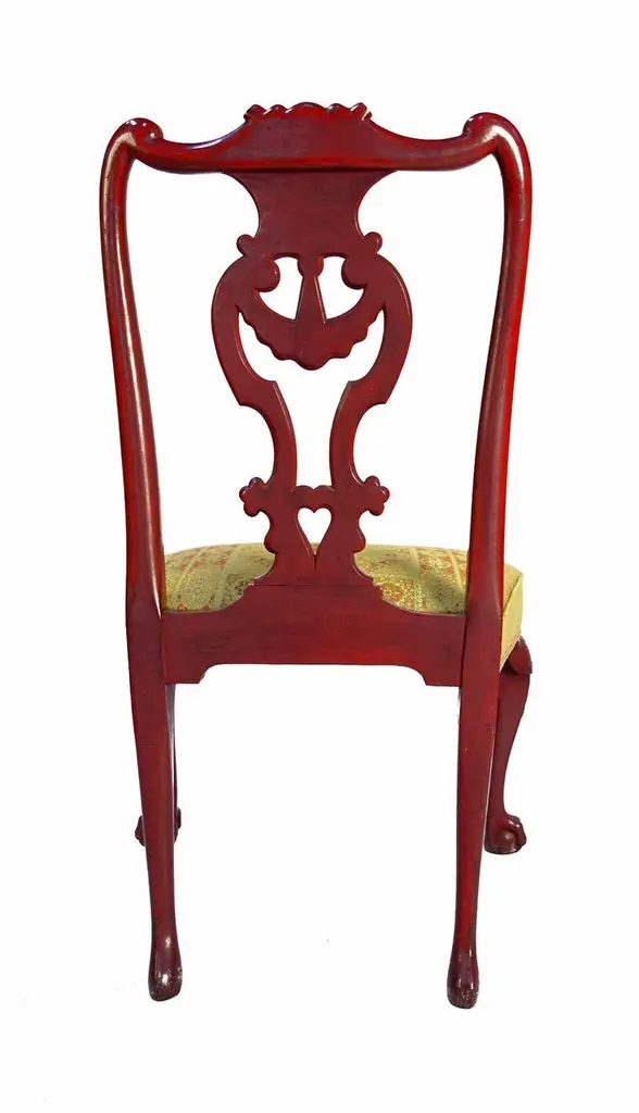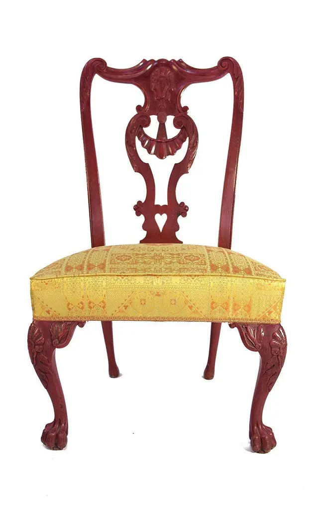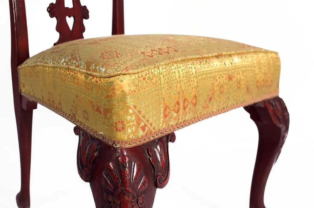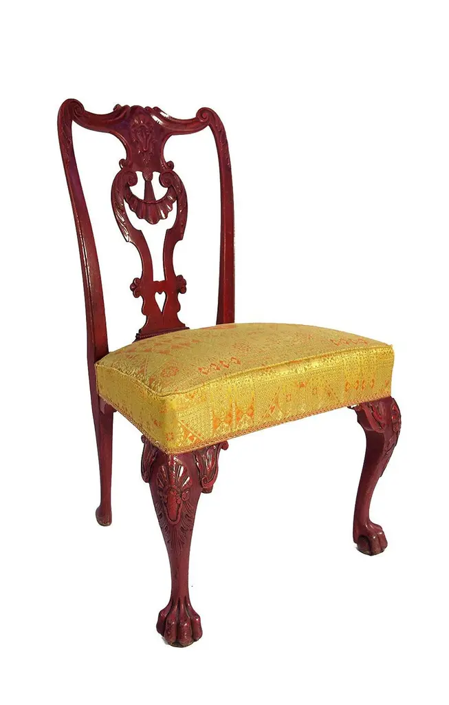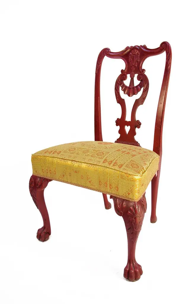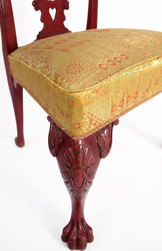 Pair of Chippendale style chairs in red lacquered wood standing on four legs: cabriole front legs with a decor of cartouche, foliage and shell, claw and ball feet. Sabre back legs ending with simple shoes. Openwork fiddle back decorated with acanthus leaves and scrolls on the stiles and central splat adorned with openwork heart, scrolls, acanthus leaves, C-crest and cartouche.Seat upholstered with a yellow background oriental style motifs Rubelli fabric with orange and red tones motifs.Work realized, circa 1880.Trim entirely reupholstered by our workshop with a Rubelli fabric, CASABLANCA reference. Rubelli is historical Venetian fabric manufacture and was created in the late 19th century with now workshops in Cuccagio, Italy, in the former Zanchi workshops. This Manufacture produces high quality and luxury fabrics, also used for La Scala or La Fenice theaters.