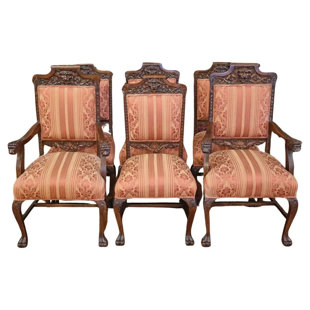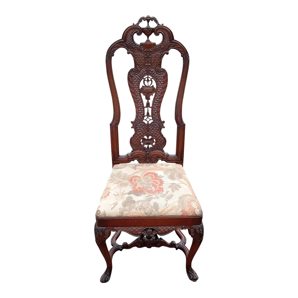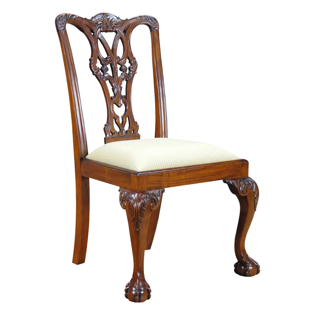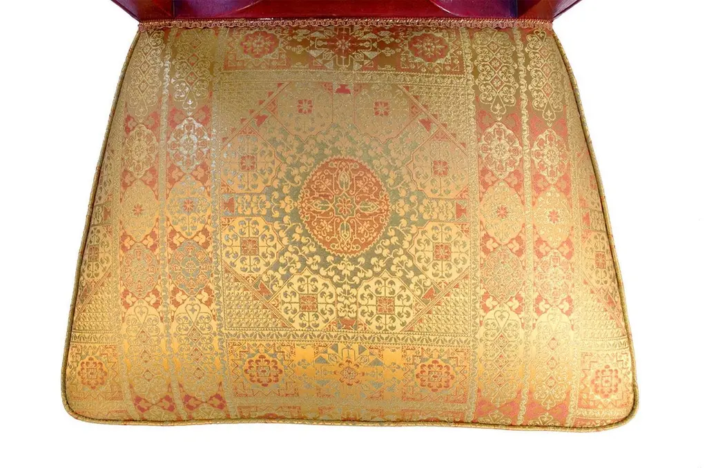 Pair of Chippendale style chairs in red lacquered wood standing on four legs: cabriole front legs with a decor of cartouche, foliage and shell, claw and ball feet. Sabre back legs ending with simple shoes. Openwork fiddle back decorated with acanthus leaves and scrolls on the stiles and central splat adorned with openwork heart, scrolls, acanthus leaves, C-crest and cartouche.Seat upholstered with a yellow background oriental style motifs Rubelli fabric with orange and red tones motifs.Work realized, circa 1880.Trim entirely reupholstered by our workshop with a Rubelli fabric, CASABLANCA reference. Rubelli is historical Venetian fabric manufacture and was created in the late 19th century with now workshops in Cuccagio, Italy, in the former Zanchi workshops. This Manufacture produces high quality and luxury fabrics, also used for La Scala or La Fenice theaters.