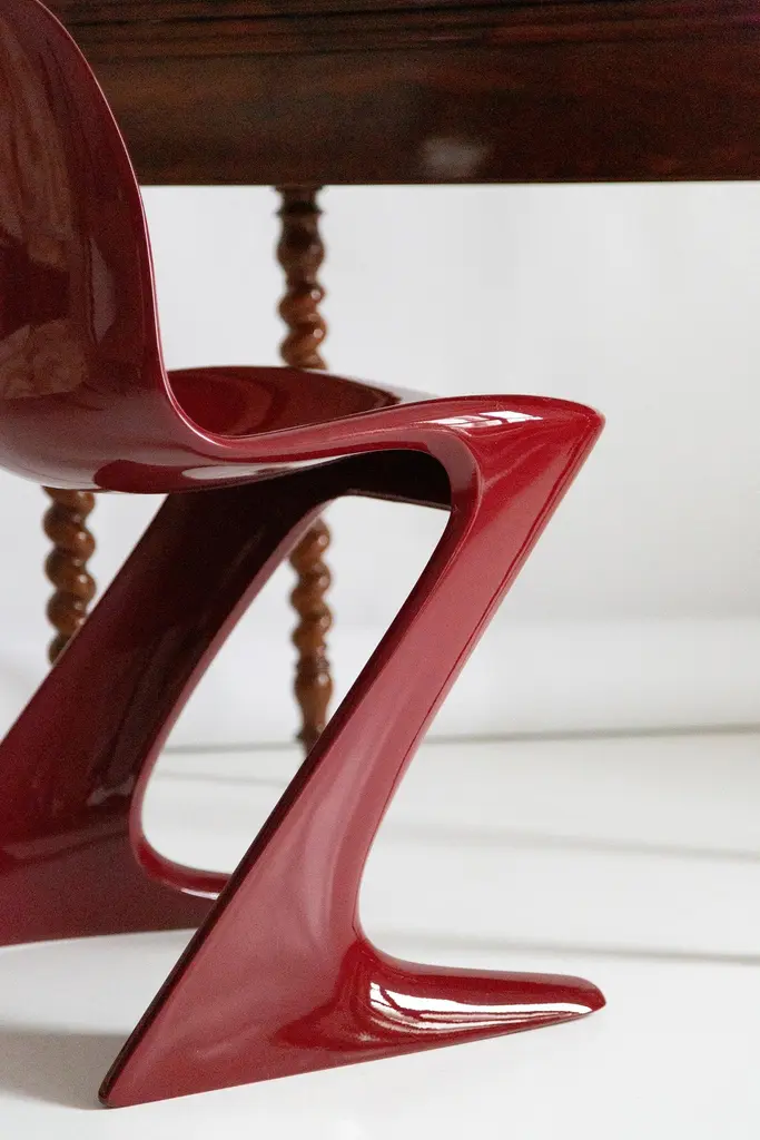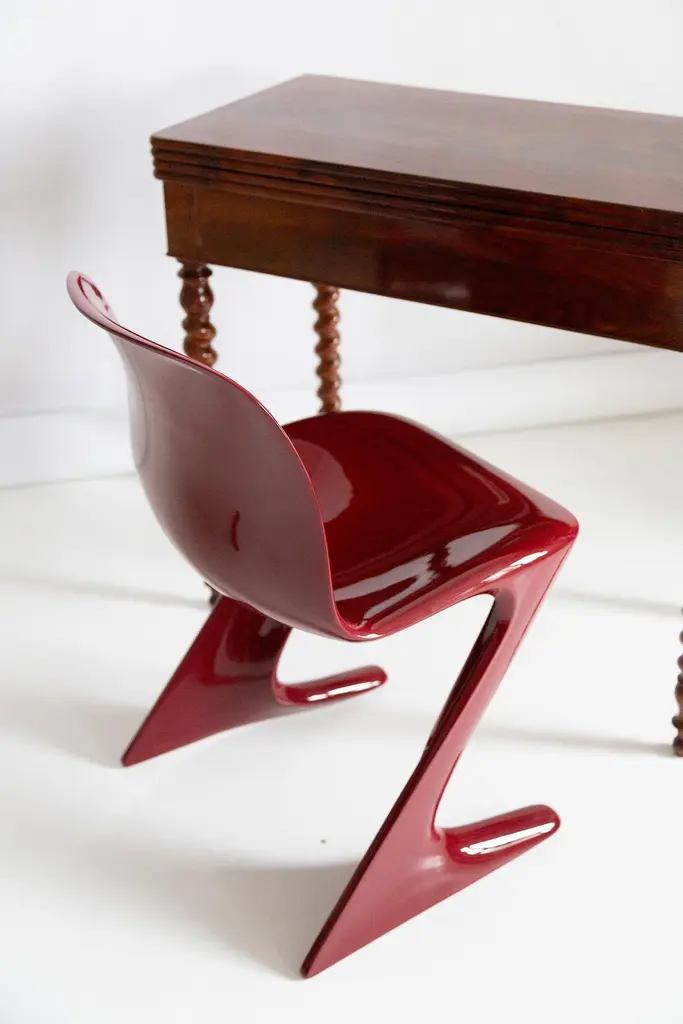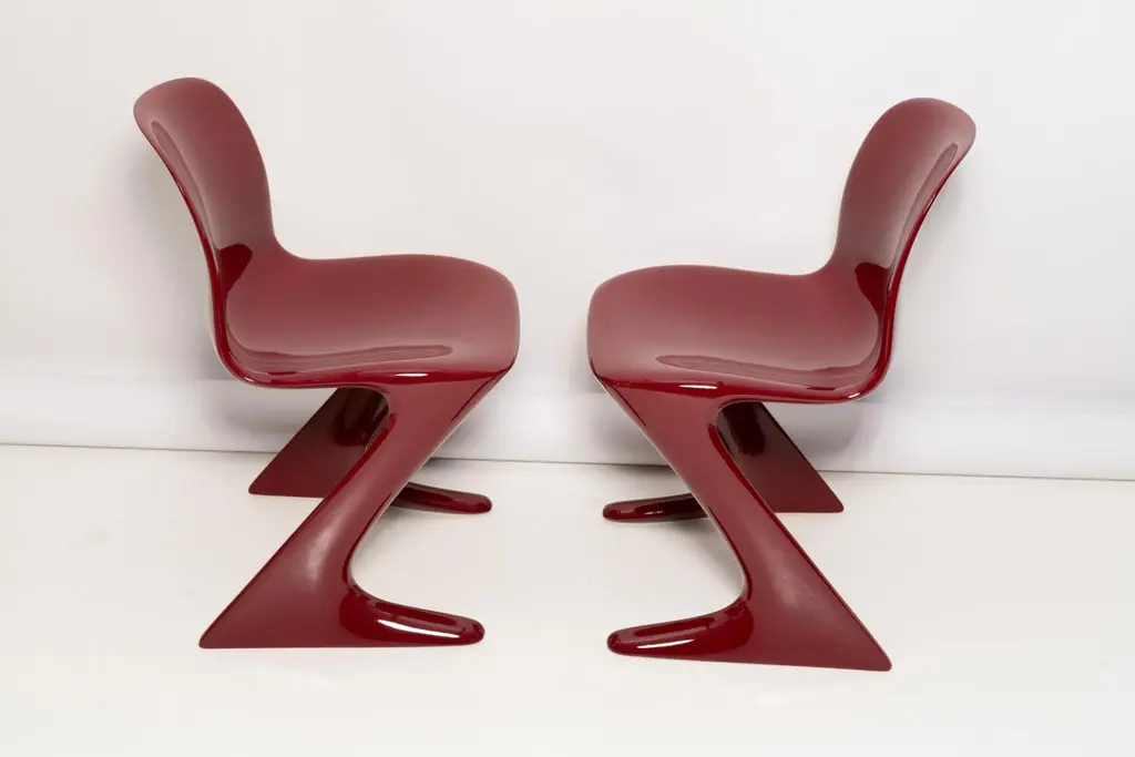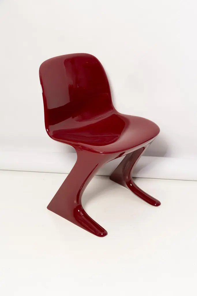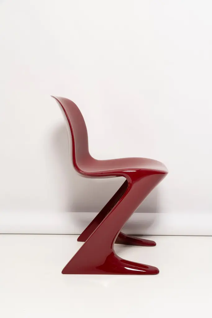 This model is called Z-chair. Designed in 1968 in the GDR by Ernst Moeckl and Siegfried Mehl, German Version of the Panton chair. Also called kangaroo chair or variopur chair. Produced in eastern Germany.Chair is after full renovation, glossy red wine color lacquer (RAL 3005). The chair is extremely comfortable! Beautiful organic shape make them timeless and fits to every interior. We can prepare also set of 4 or 6 or more, also in another RAL/Pantone color.