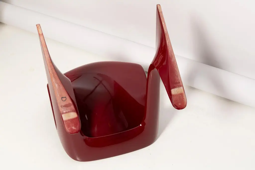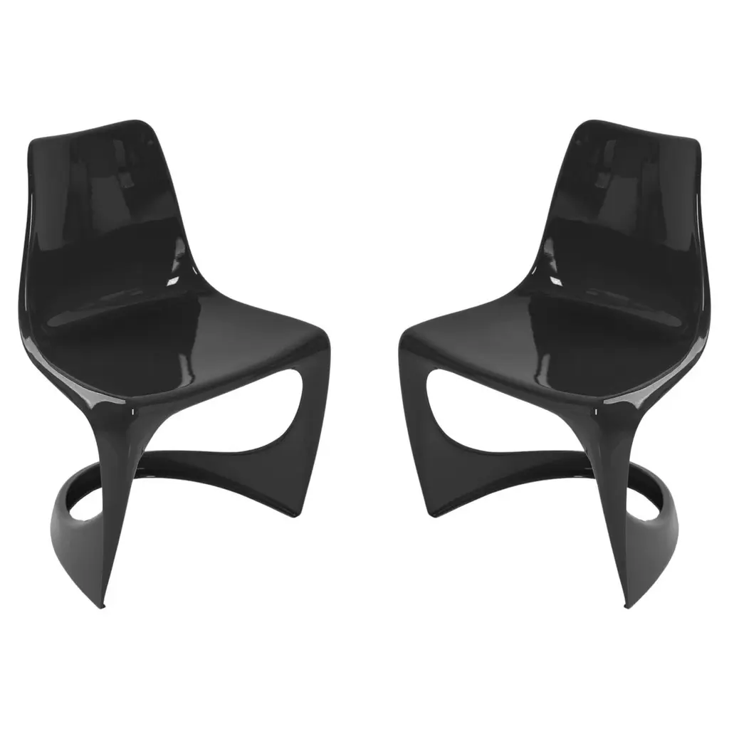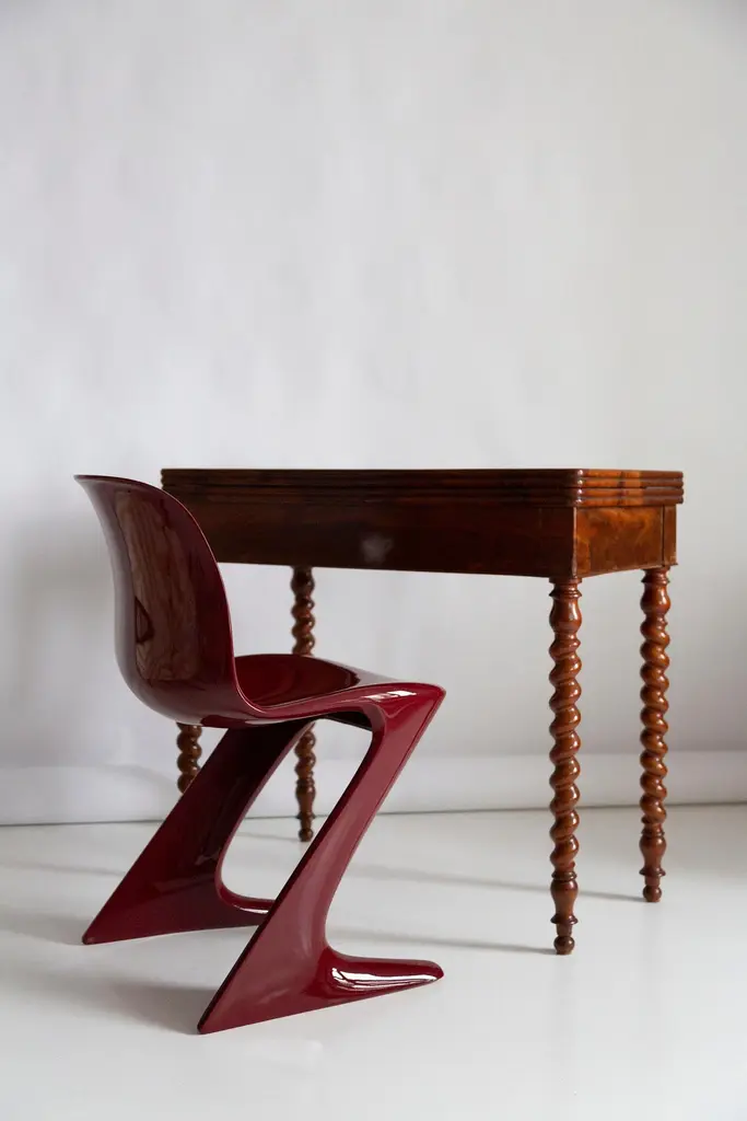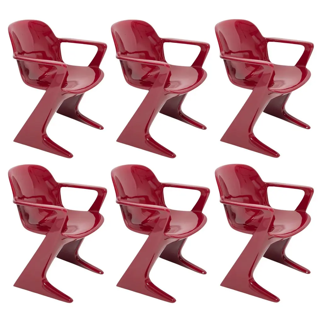 This model is called Z-chair. Designed in 1968 in the GDR by Ernst Moeckl and Siegfried Mehl, German Version of the Panton chair. Also called kangaroo chair or variopur chair. Produced in eastern Germany.Chair is after full renovation, glossy red wine color lacquer (RAL 3005). The chair is extremely comfortable! Beautiful organic shape make them timeless and fits to every interior. We can prepare also set of 4 or 6 or more, also in another RAL/Pantone color.