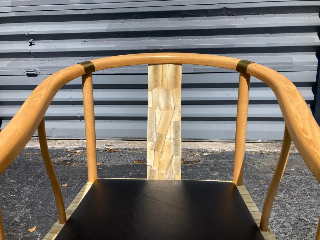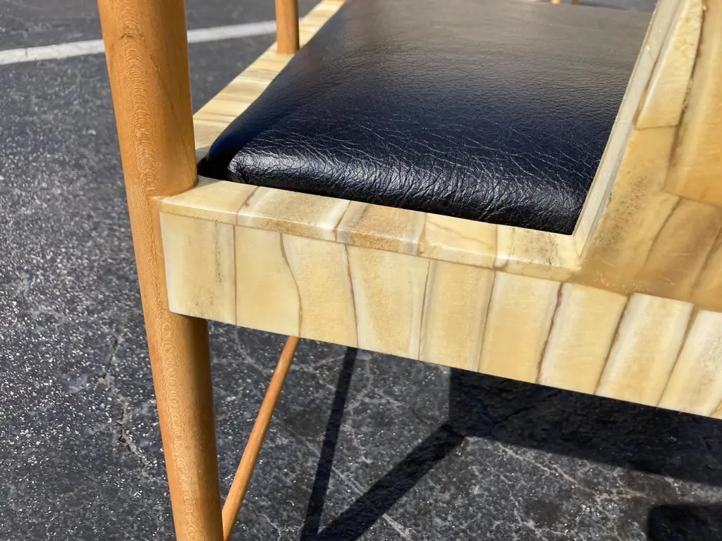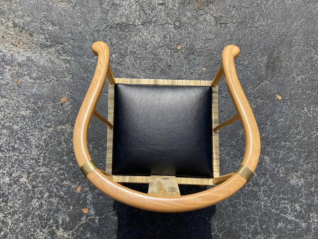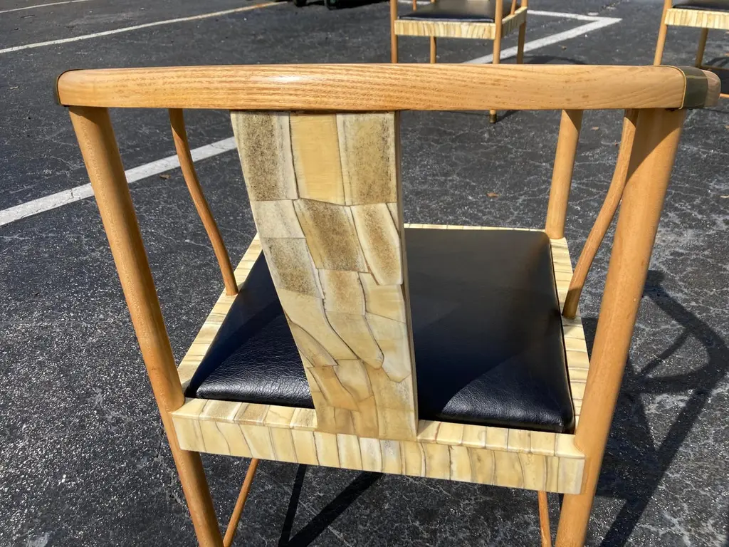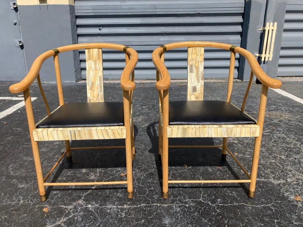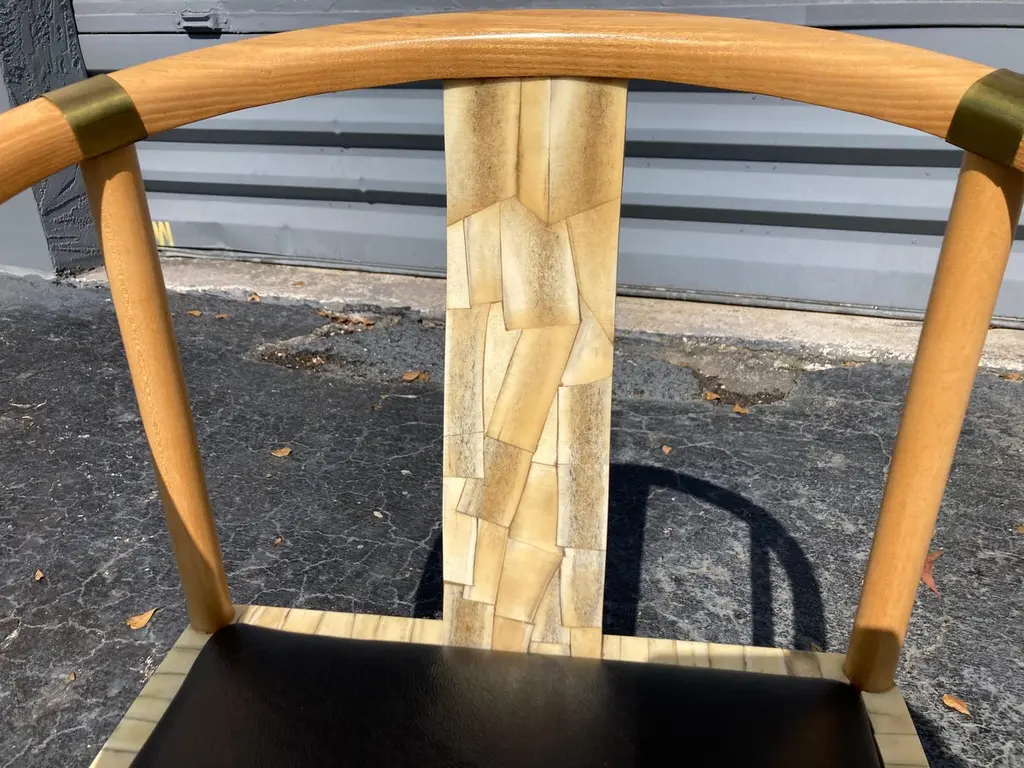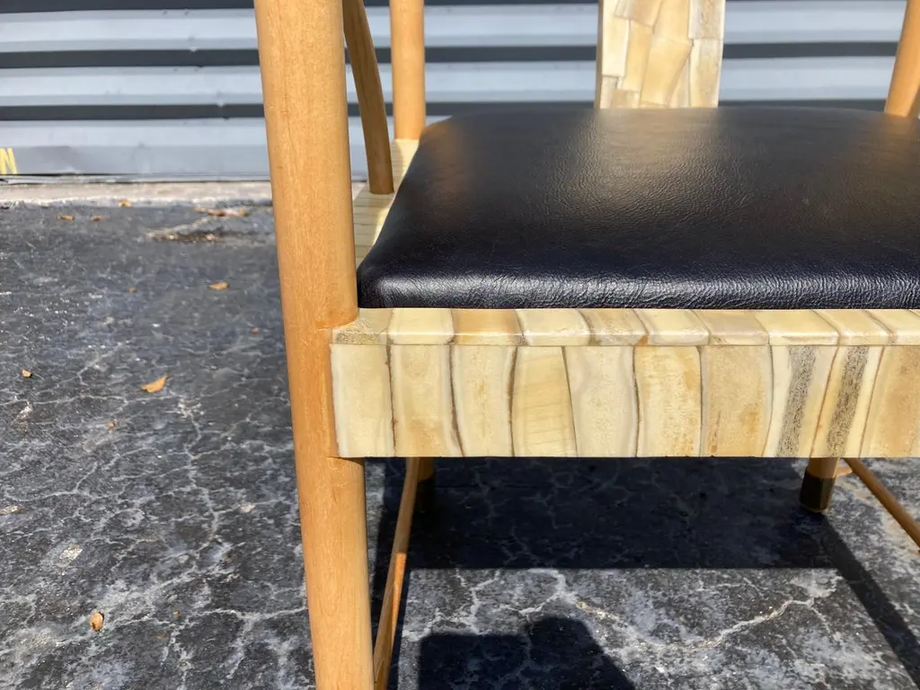 Fabulous pair of designer chairs with black leather seat cushions. Chairs are partly covered in bone with brass details. Please see all pictures. Four chairs in total available. Price is for the pair.