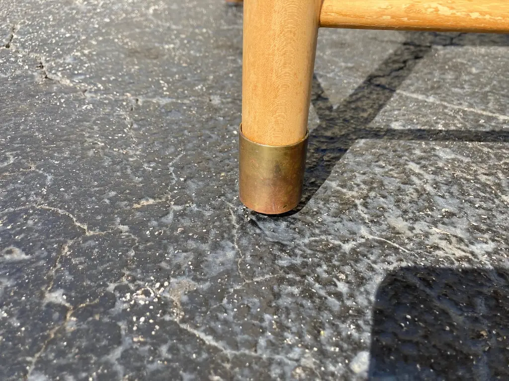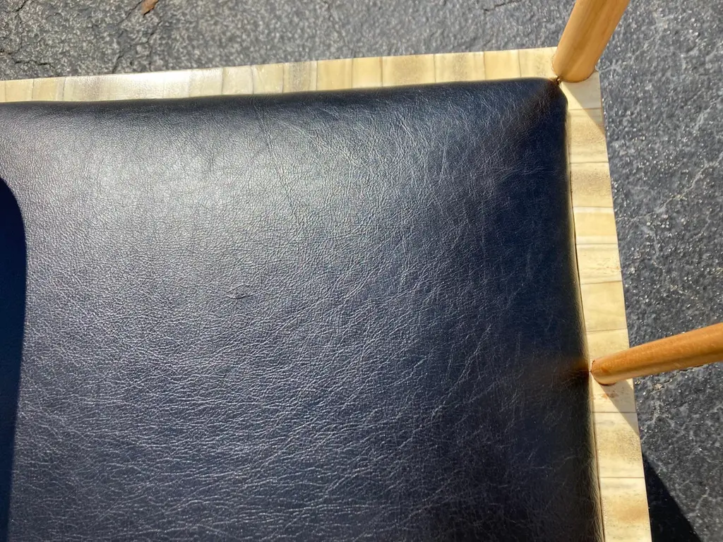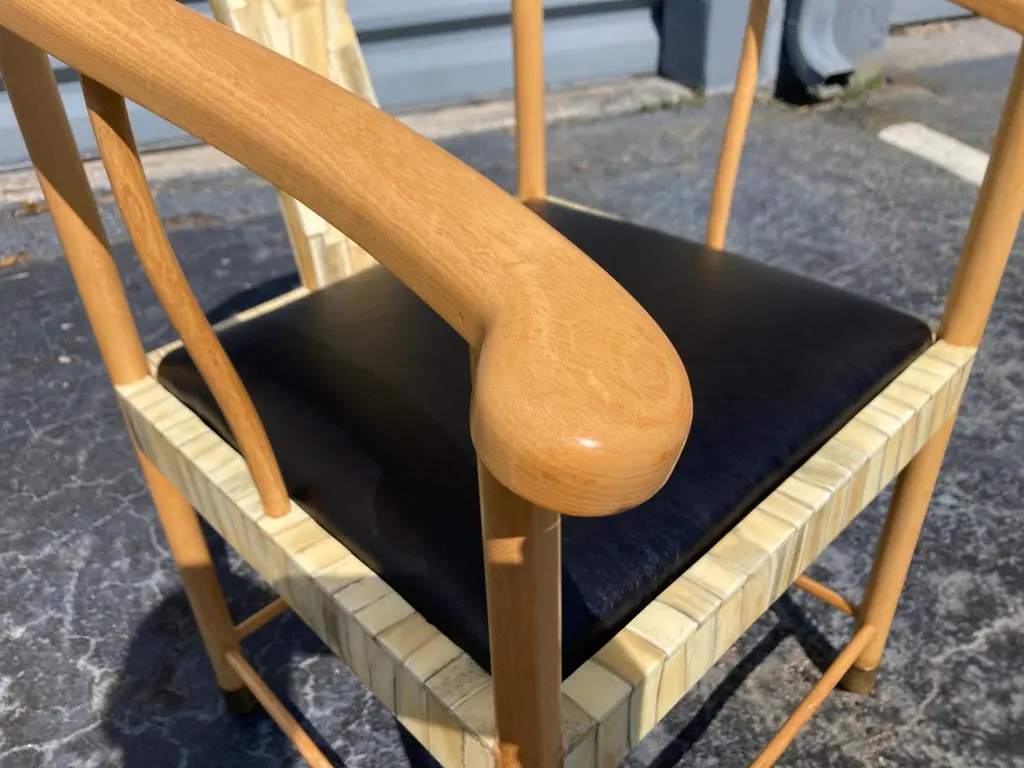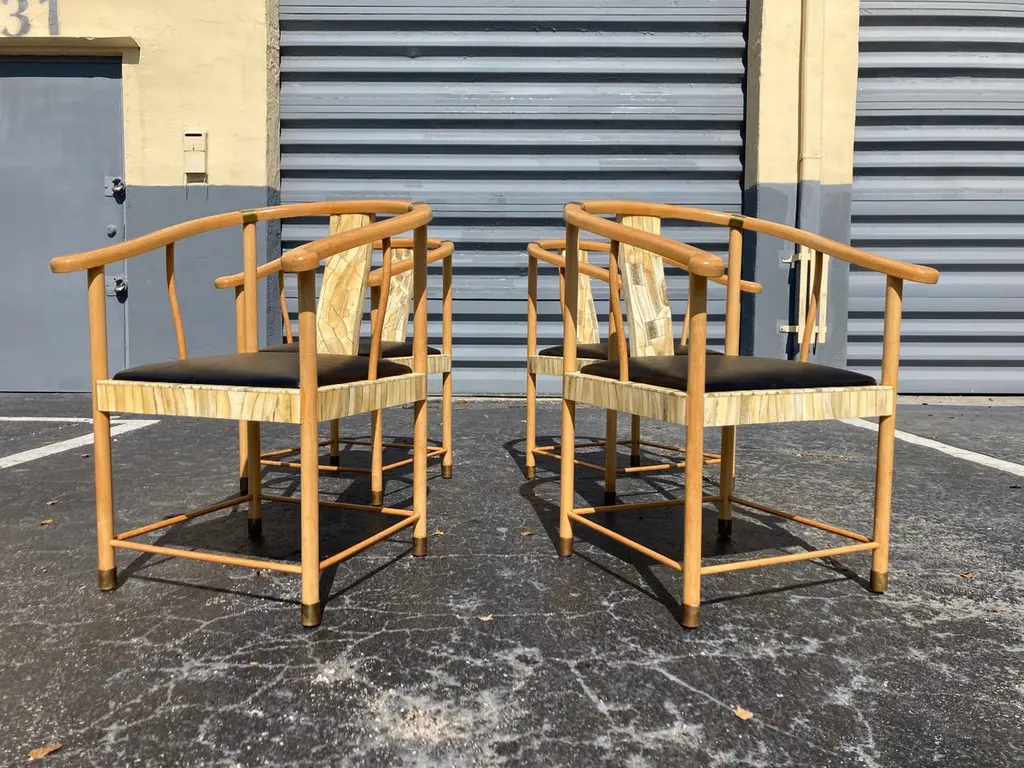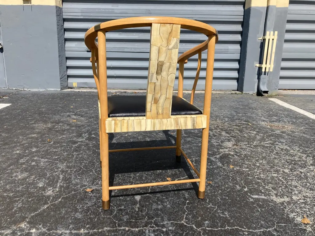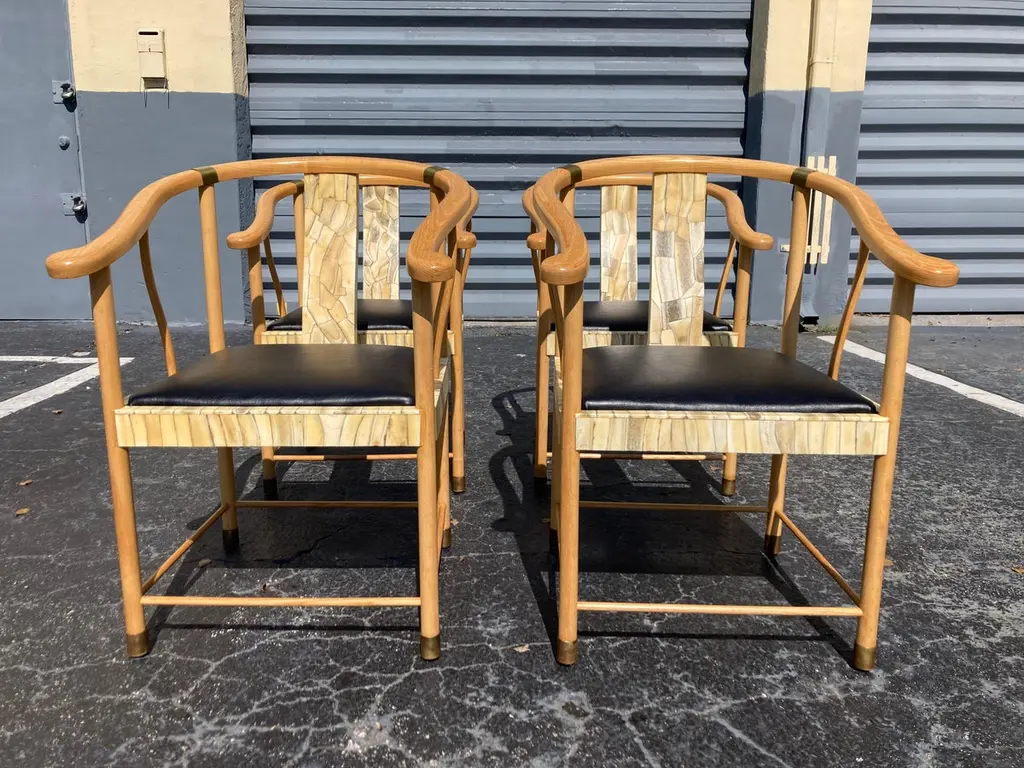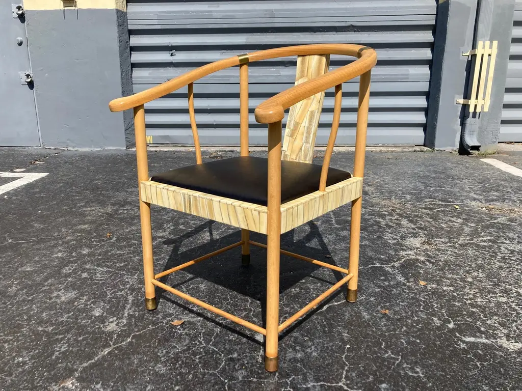 Fabulous pair of designer chairs with black leather seat cushions. Chairs are partly covered in bone with brass details. Please see all pictures. Four chairs in total available. Price is for the pair.