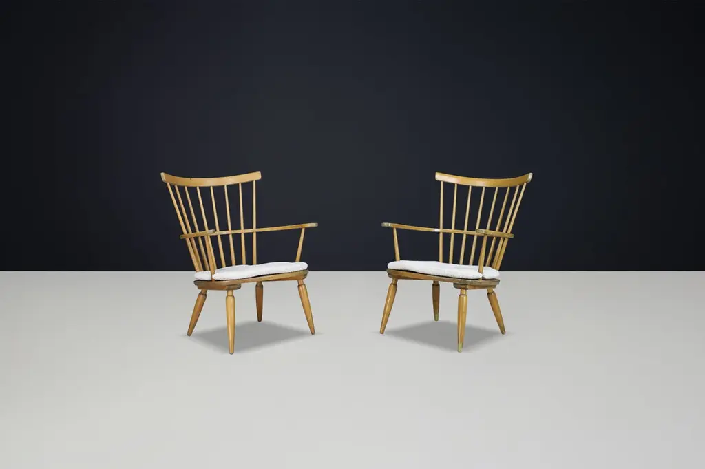 Pair Of Designer Chairs, Bone, Black Leather, Brass