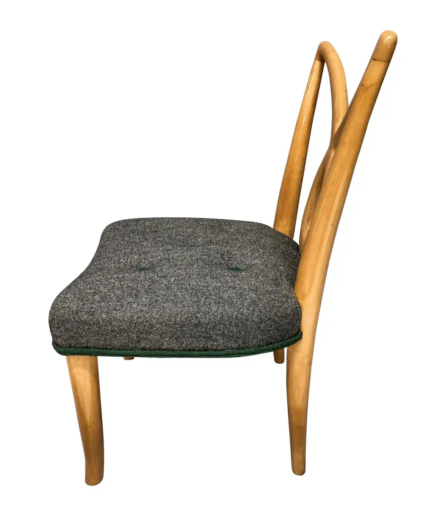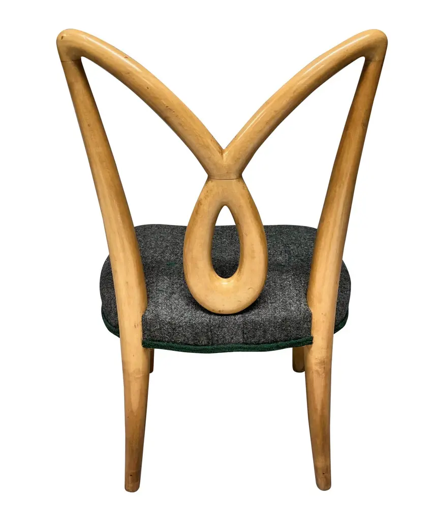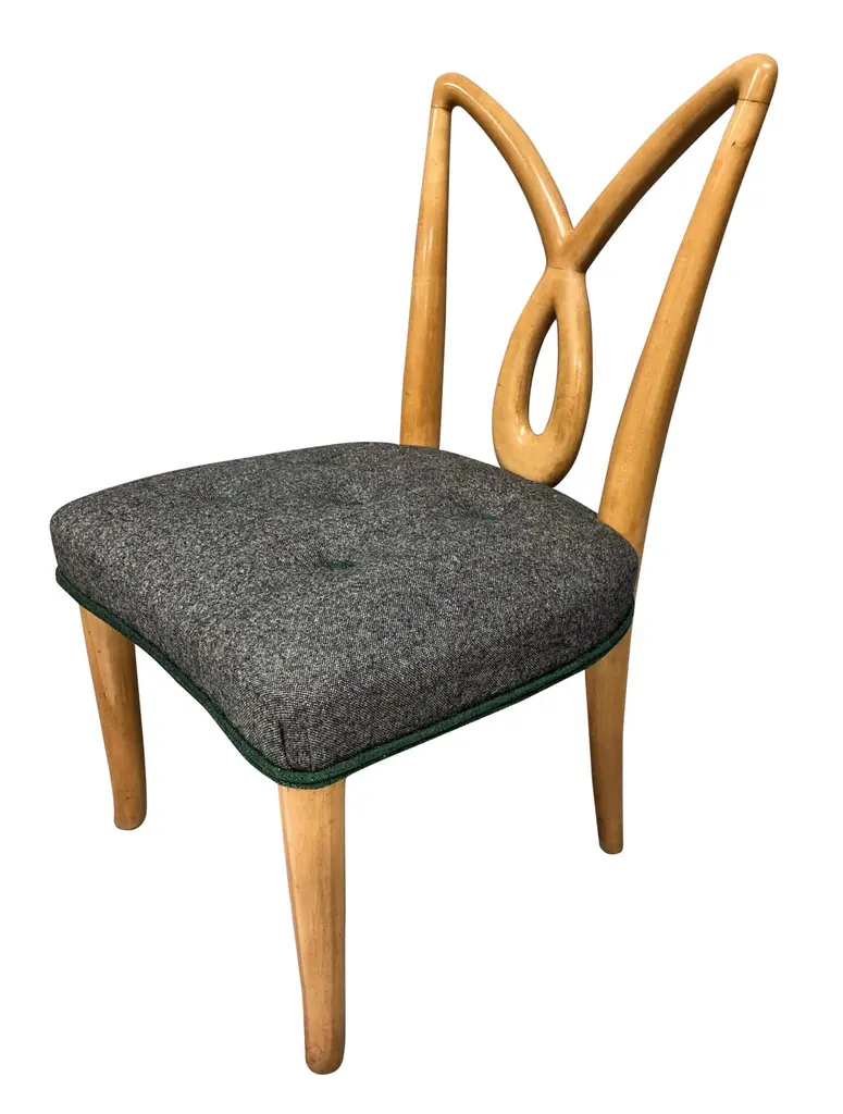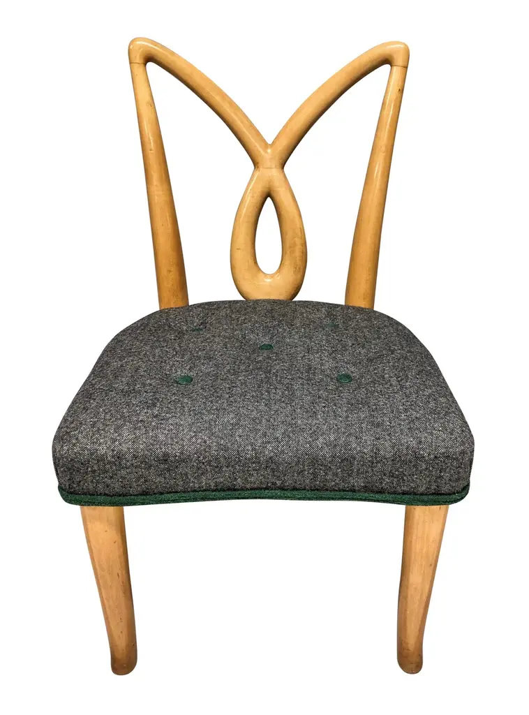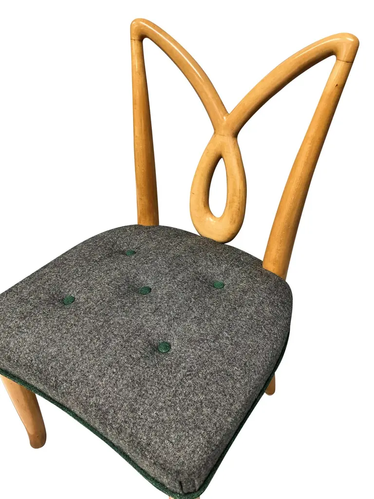 A pair of Italian Mid-Century hall chairs with sculptural backs, in lemon wood. The seats newly upholstered in grey wool with emerald green detailing.