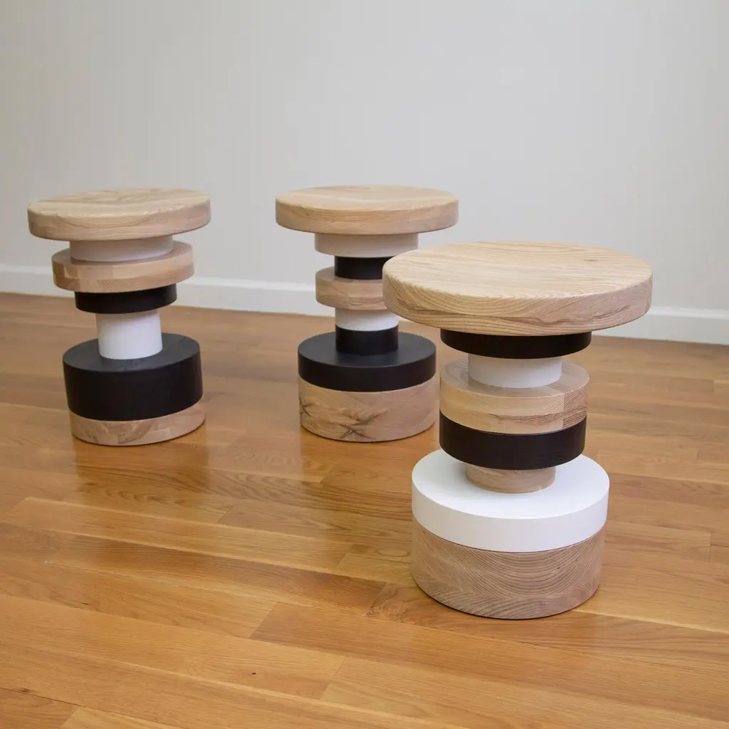 This listing is for 2 Sass Stool from Souda. We offer three different shapes (A, B, & C). This listing is for 'C', which is the stool in the first image. 'A' and 'B' are available in our other listings.The Sottsass inspired “Sass Stools” are simple, sculptural accents for any interior space. Made from stacked wooden bases and a carved out seat, Sass stools are perfect individually or in groups. Measures: 18 inches tall with 14 inch diameter. Each stool has a small dished out top for comfort.Made in the USA Each stool is solid wood.