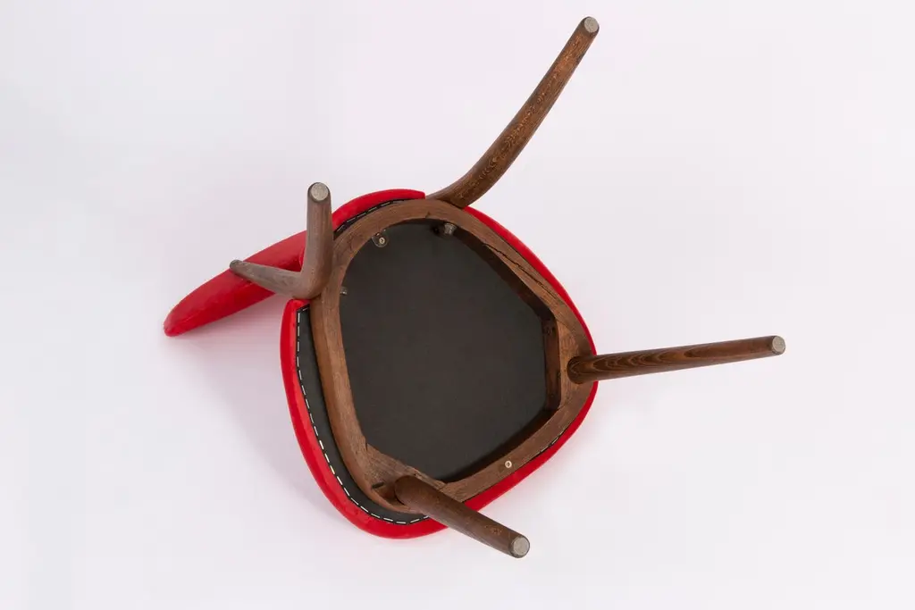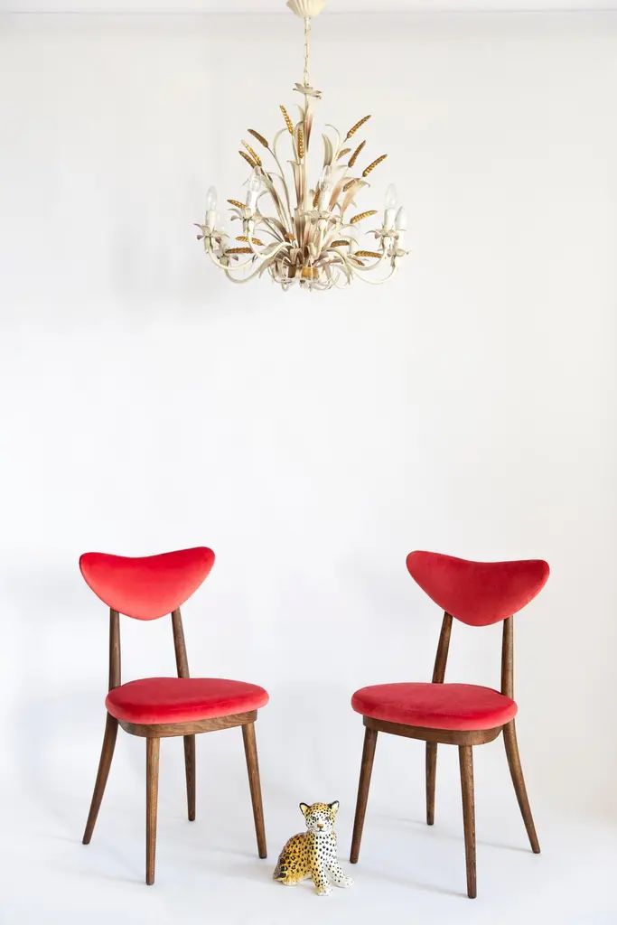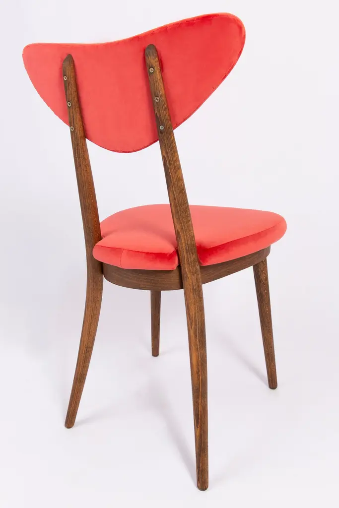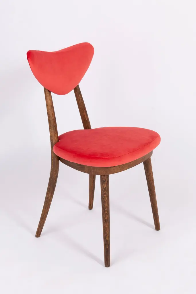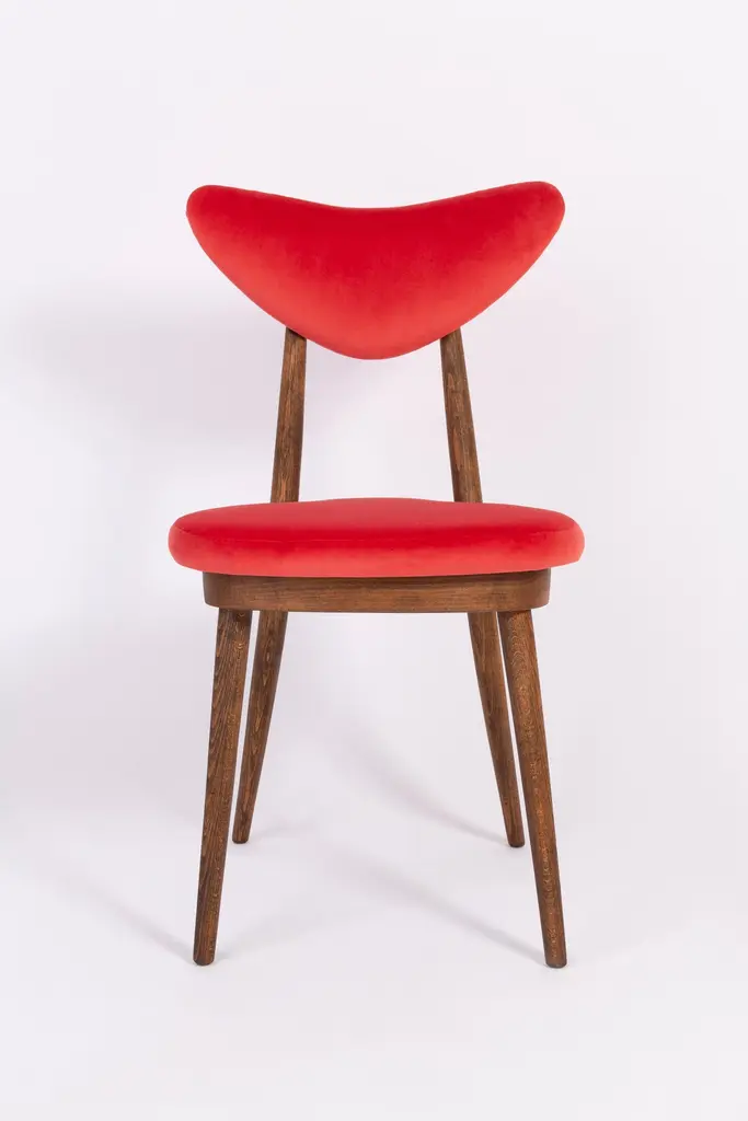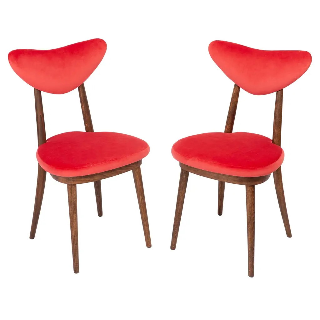 A set of 2 chairs type A5828. Colloquially called "heart". The furniture was designed by Helena and Jerzy Kurmanowicz. They were produced in Radomsko Woodworking Factory and we thoroughly renovated them. The construction is made of beech wood dyed with water stain brown. The chairs are protected with acrylic varnish with a satin glow. The upholstery fabric was produced in the Clean boo technology and has water-repellent properties. This means that the fabric limits the absorption of liquids. Spilled liquid on the surface will form balls. The chairs have undergone a complete carpentry and upholstery renovation. Seats covered with high-quality red velvet (color 2232). ABRASION RESISTANCE Category A (60,000 cycles). We can prepare also bigger sets 4, 6, 8 or more chairs in different wood and velvet color.