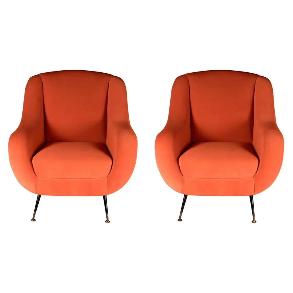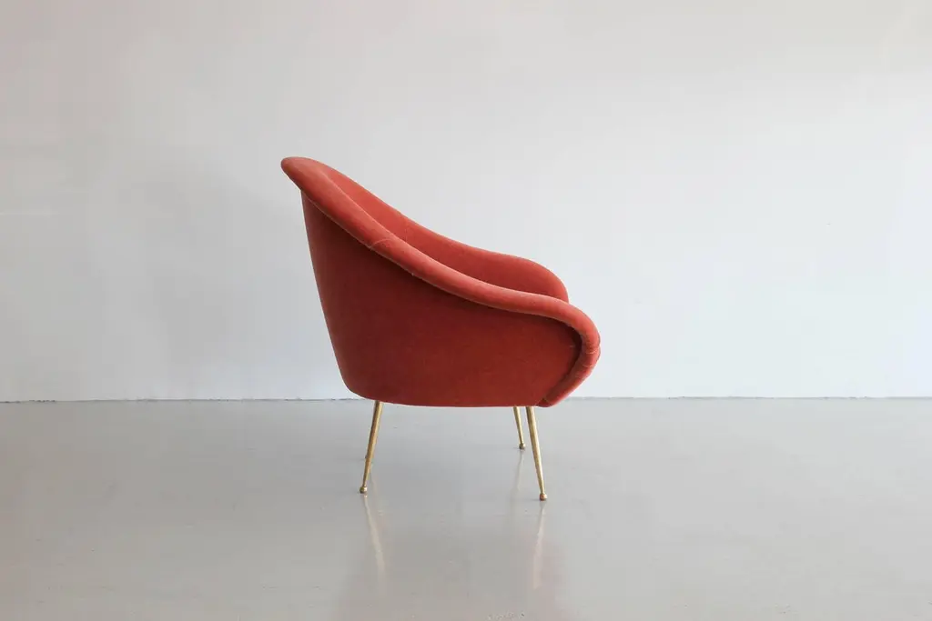 Pair of Italian slipper chairs newly produced by ORANGE with beautiful curved lines and solid brass legs.. Shown in burnt orange mohair and priced COM.