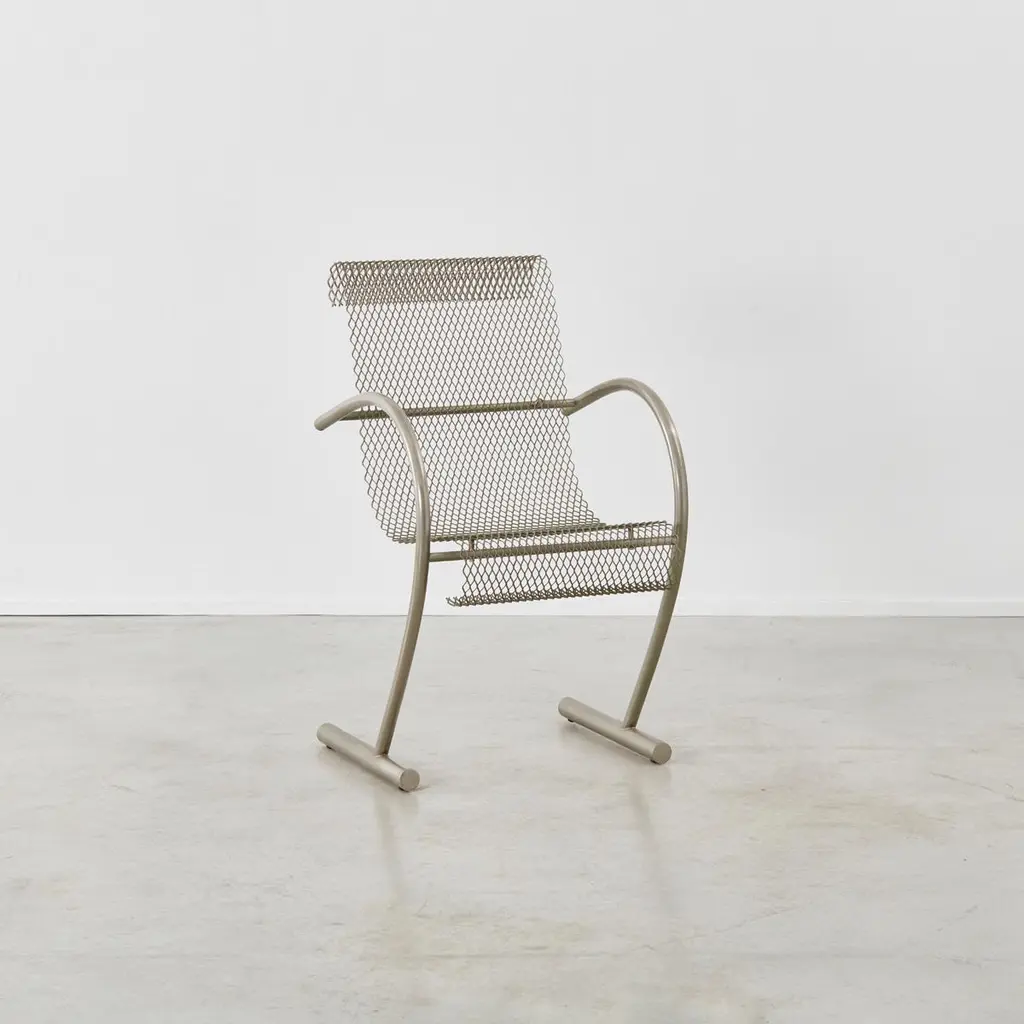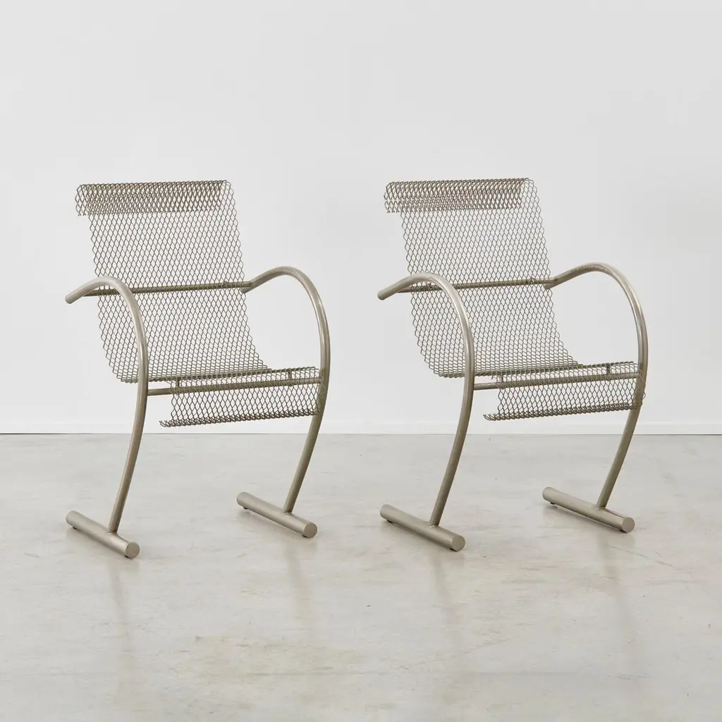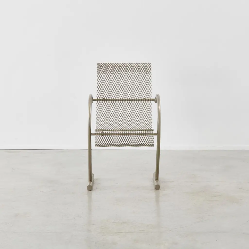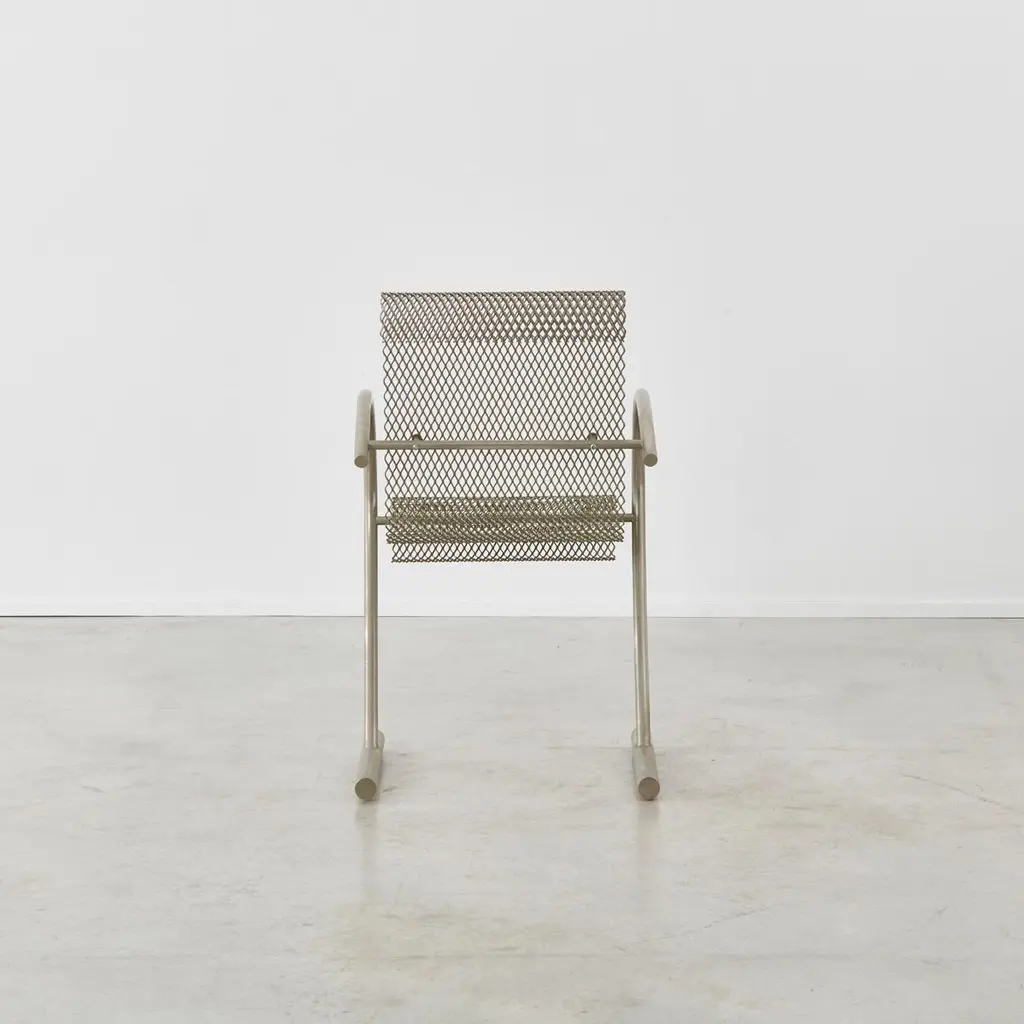 Set of four or six available. Shiro Kuramata (1931-1991) created a fluid exchange between Japanese design philosophy and methodology and European postmodern design. Kuramata’s training was initially centred around traditional woodworking however, when he enrolled at the Kuwasawa Design School was taught by Isamu Kenmochi, who helped him reimagine ancient Japanese traditions using modern materials. The philosophy Kuramata. His designs are made from materials that have reflective, transparent, translucent, opaque and tactile qualities to them, each form a response each material.The sing sing sing chair, designed in 1985 for the French manufacturer XO is crafted from tubular steel and expanded steel mesh. The flow of the piece is reminiscent of a treble clef – perhaps a nod to its title. Each chair shows signs of age.