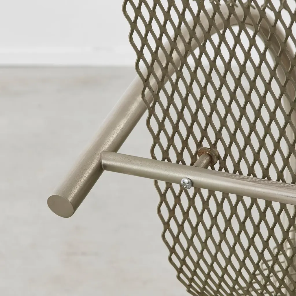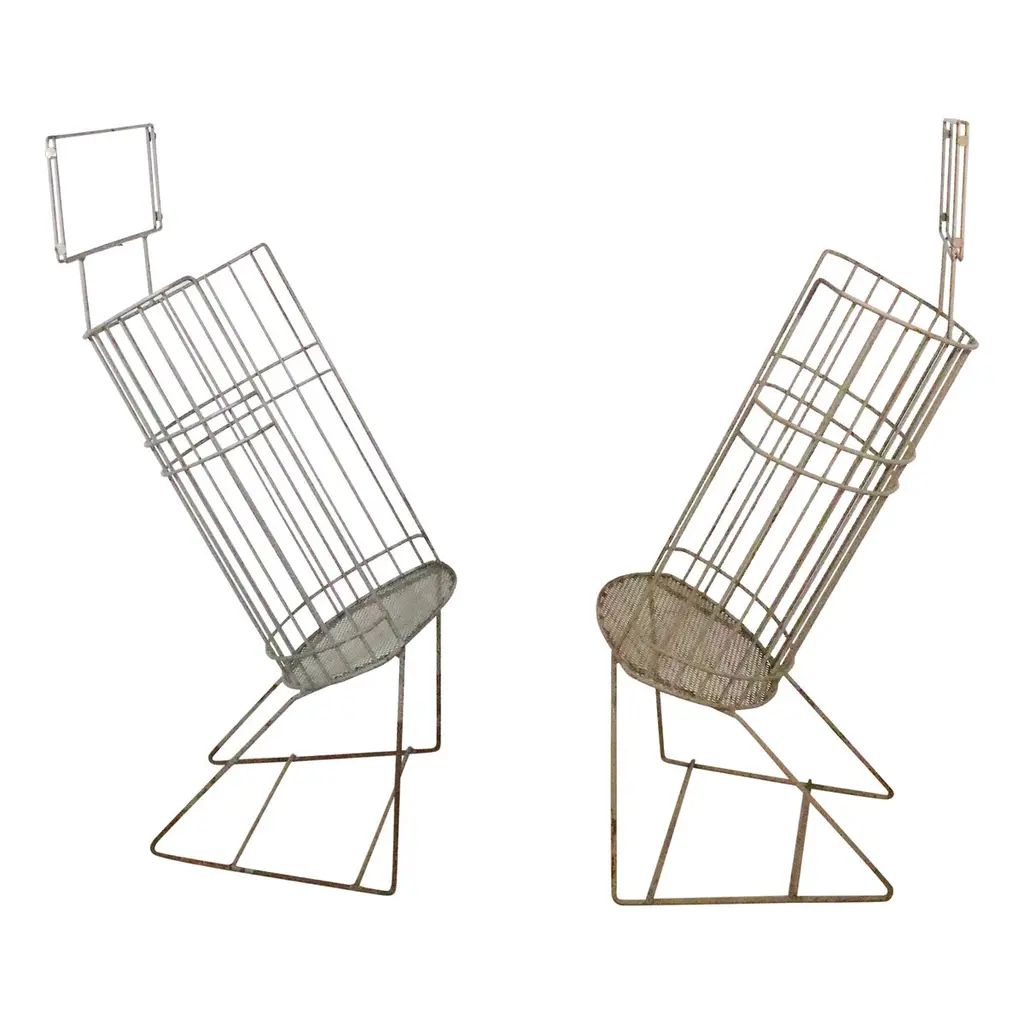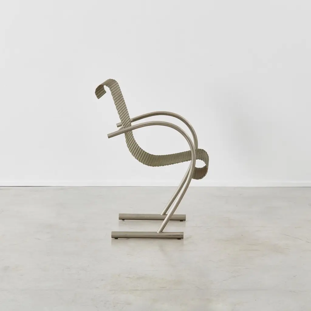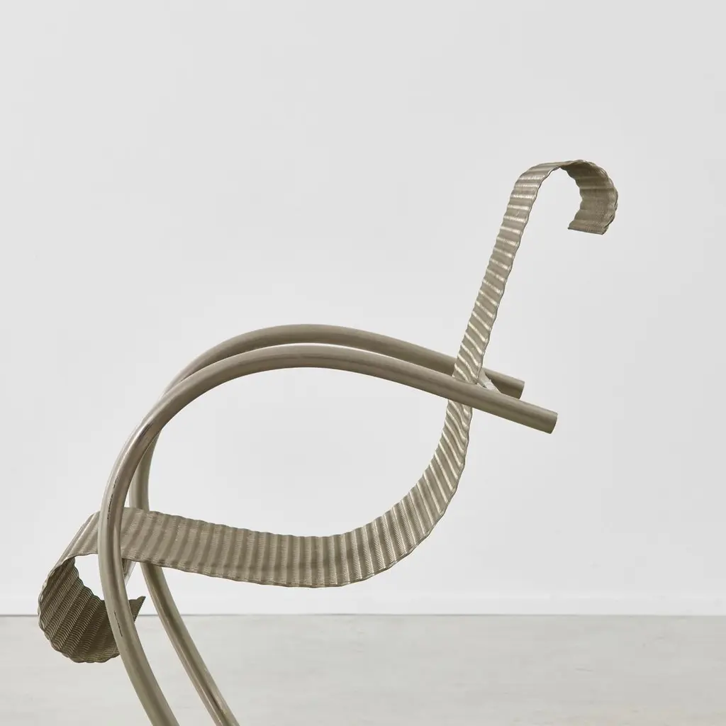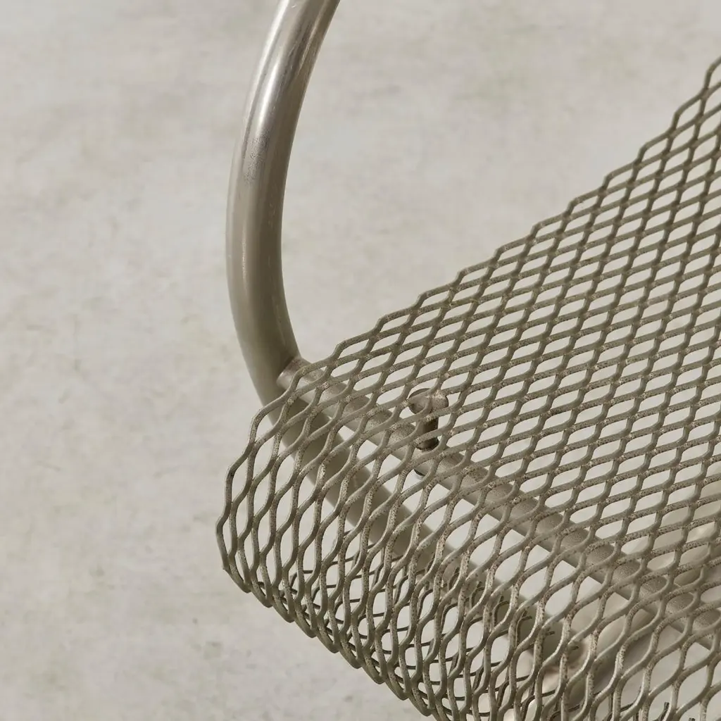 Set of four or six available. Shiro Kuramata (1931-1991) created a fluid exchange between Japanese design philosophy and methodology and European postmodern design. Kuramata’s training was initially centred around traditional woodworking however, when he enrolled at the Kuwasawa Design School was taught by Isamu Kenmochi, who helped him reimagine ancient Japanese traditions using modern materials. The philosophy Kuramata. His designs are made from materials that have reflective, transparent, translucent, opaque and tactile qualities to them, each form a response each material.The sing sing sing chair, designed in 1985 for the French manufacturer XO is crafted from tubular steel and expanded steel mesh. The flow of the piece is reminiscent of a treble clef – perhaps a nod to its title. Each chair shows signs of age.