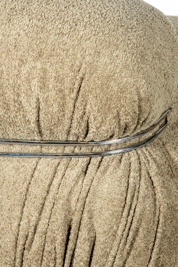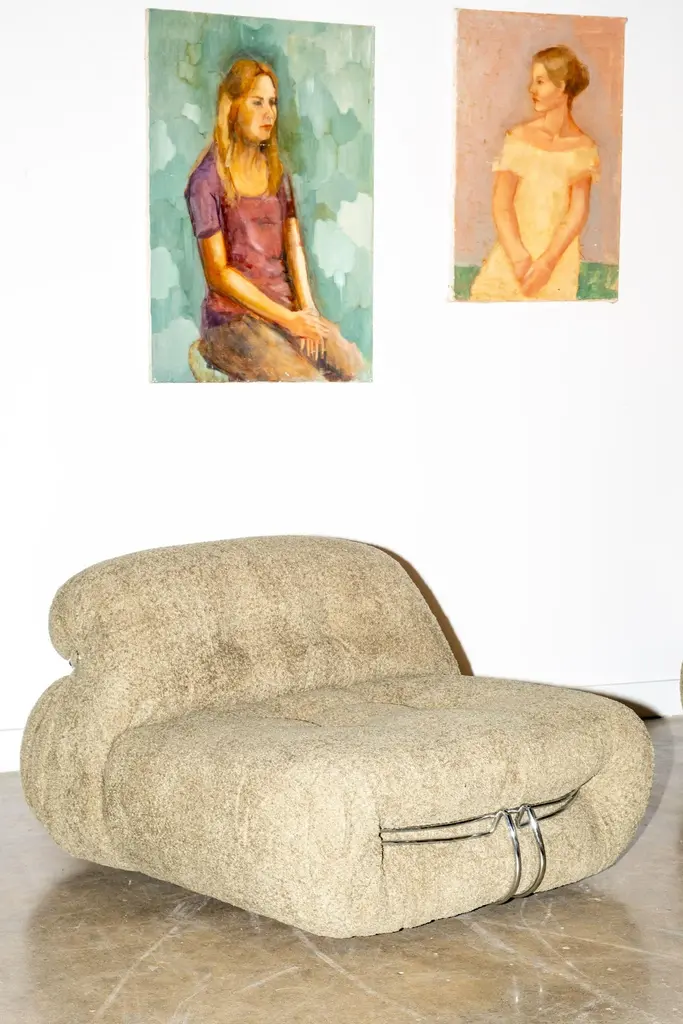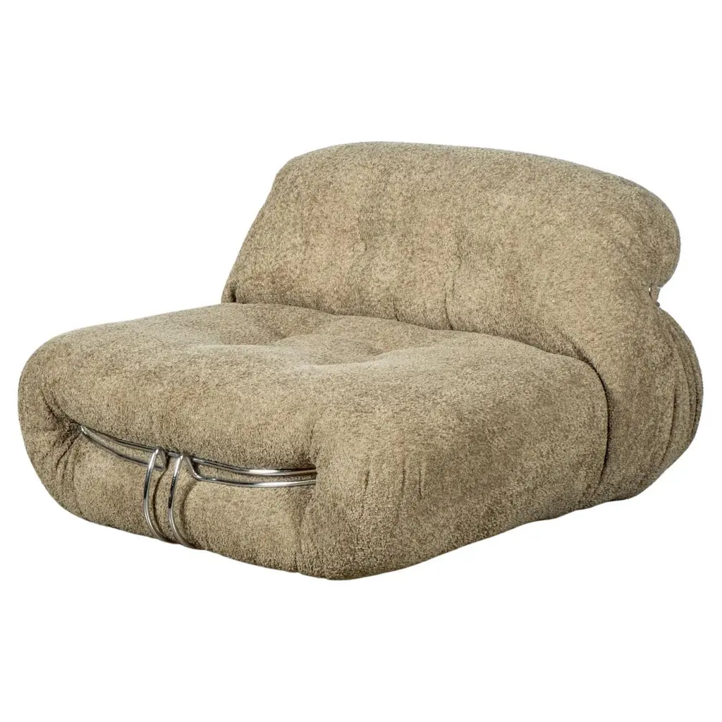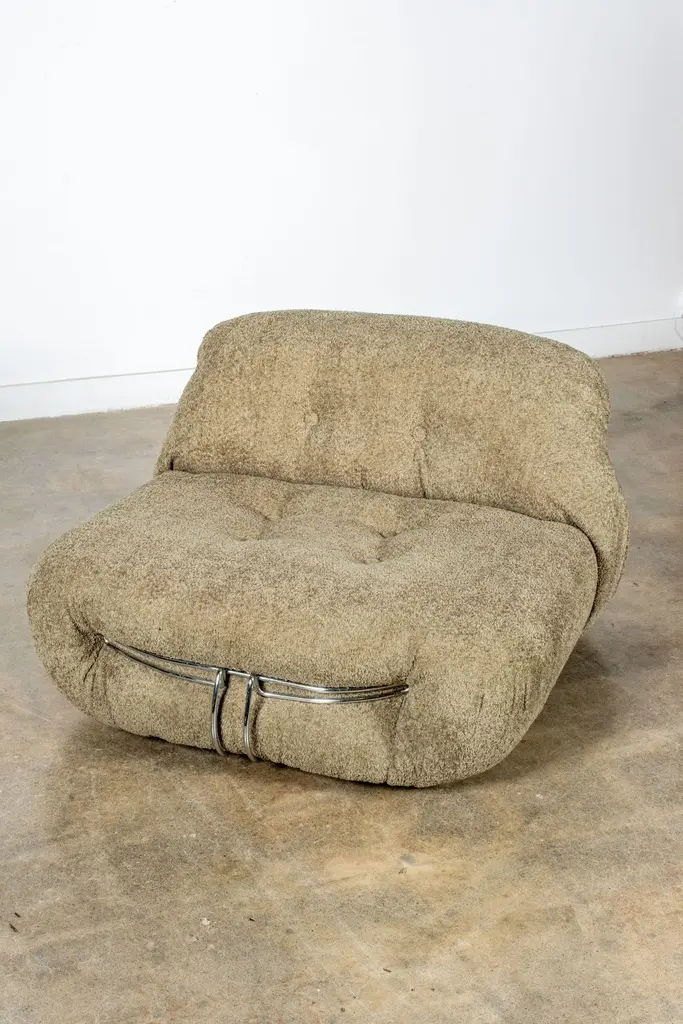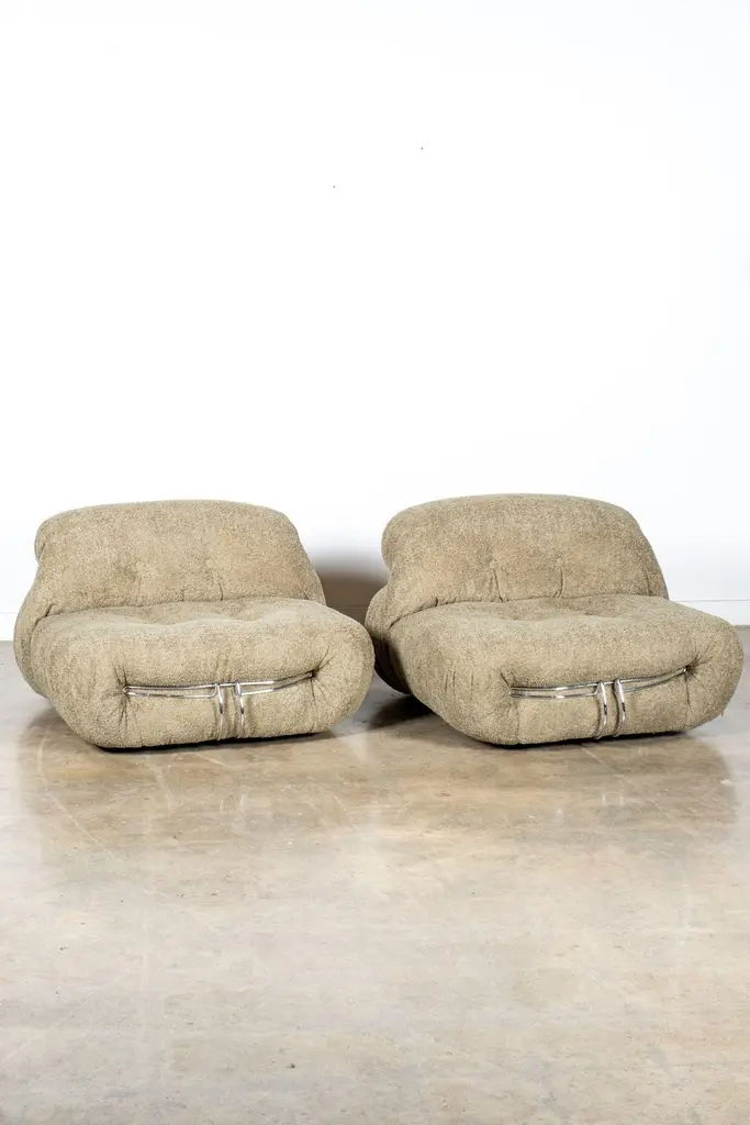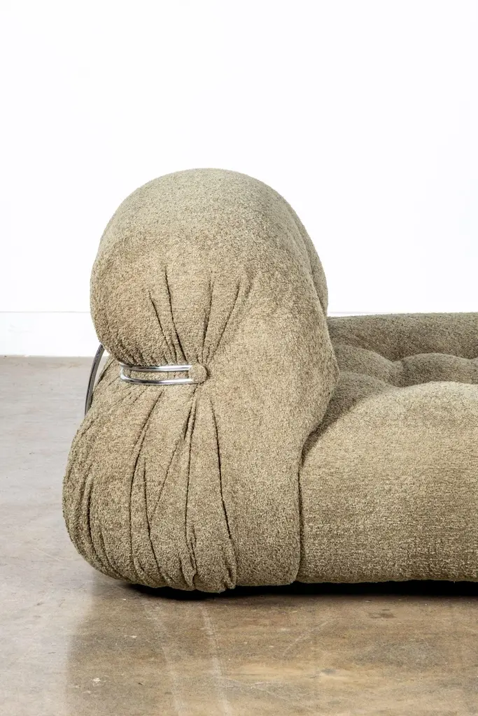 Winner of the Compasso d’Oro award in 1970, the Soriana led Italian power-couple Afra and Tobia Scarpa to instant success. Together in 1968 they designed the pair of cloud-like chairs for low-slung lounging. An original concept, the fully stuffed seats maintain their structure in a wrap-around metal belt.This pair has been newly reupholstered in a luxe mossy green boucle, furthering their comfort-to-the-max status.