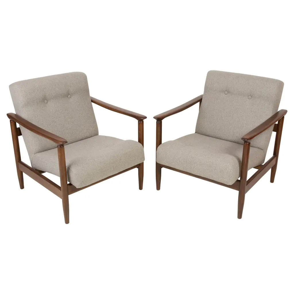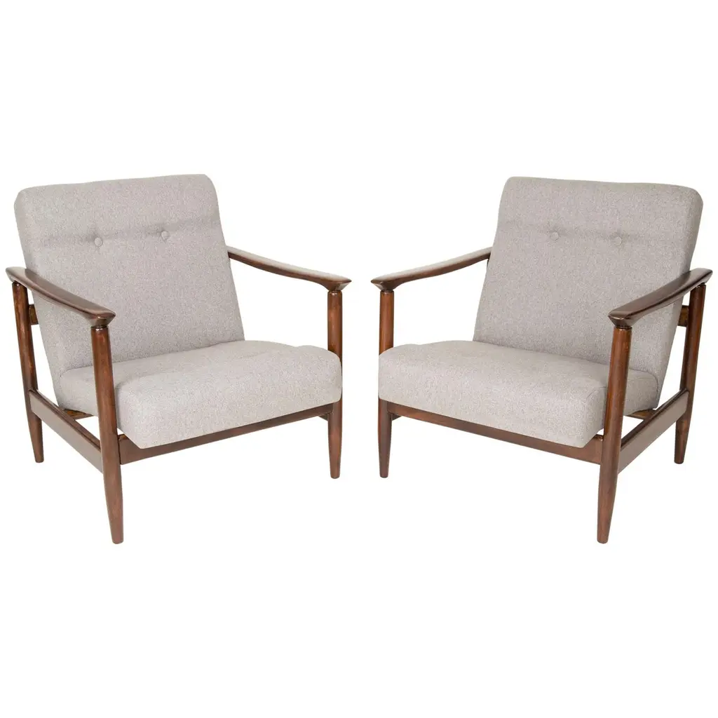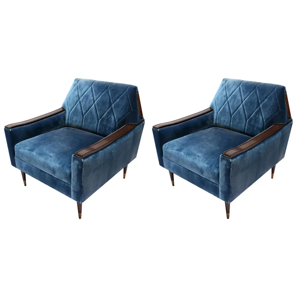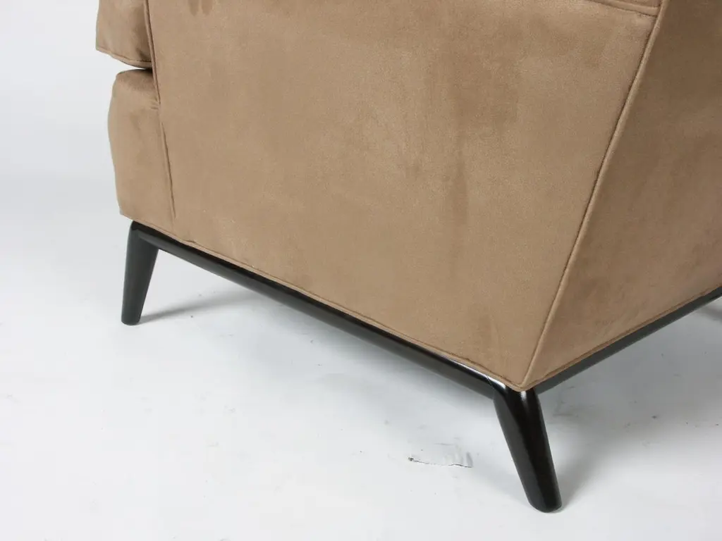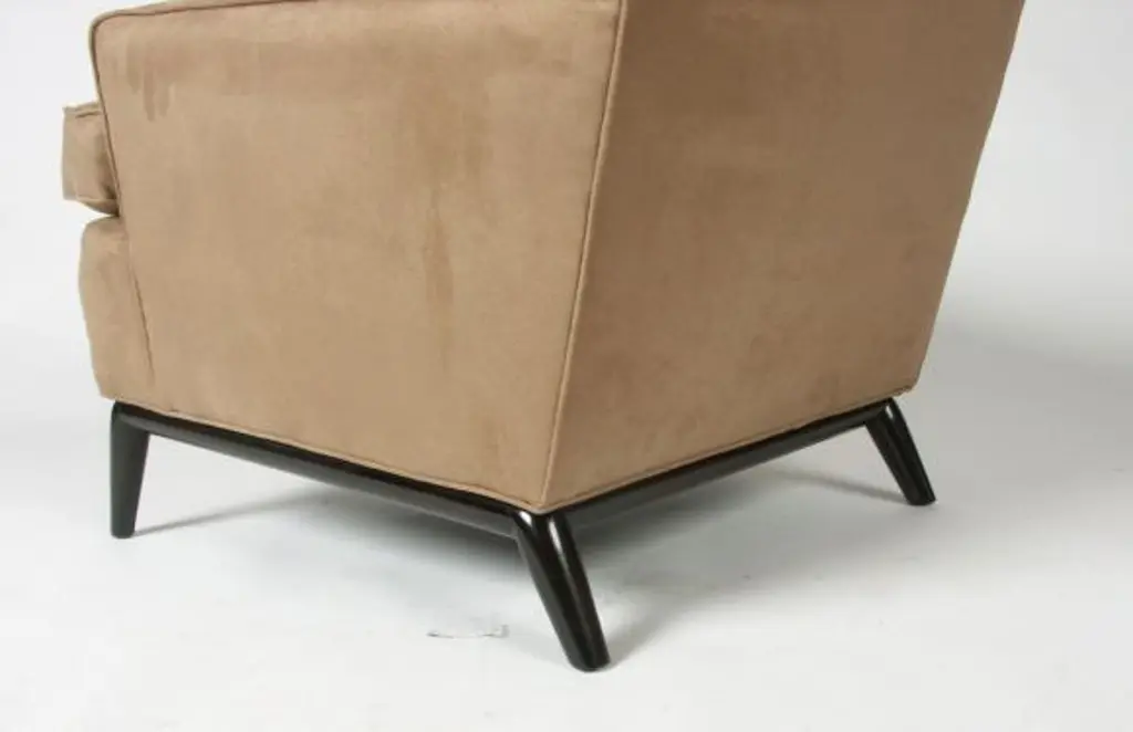 Pair of T.H. Robsjohn-Gibbings for Widdicomb highback club chairs with dark walnut base, tapered conical, angled legs. Only one chair has been upholstered.