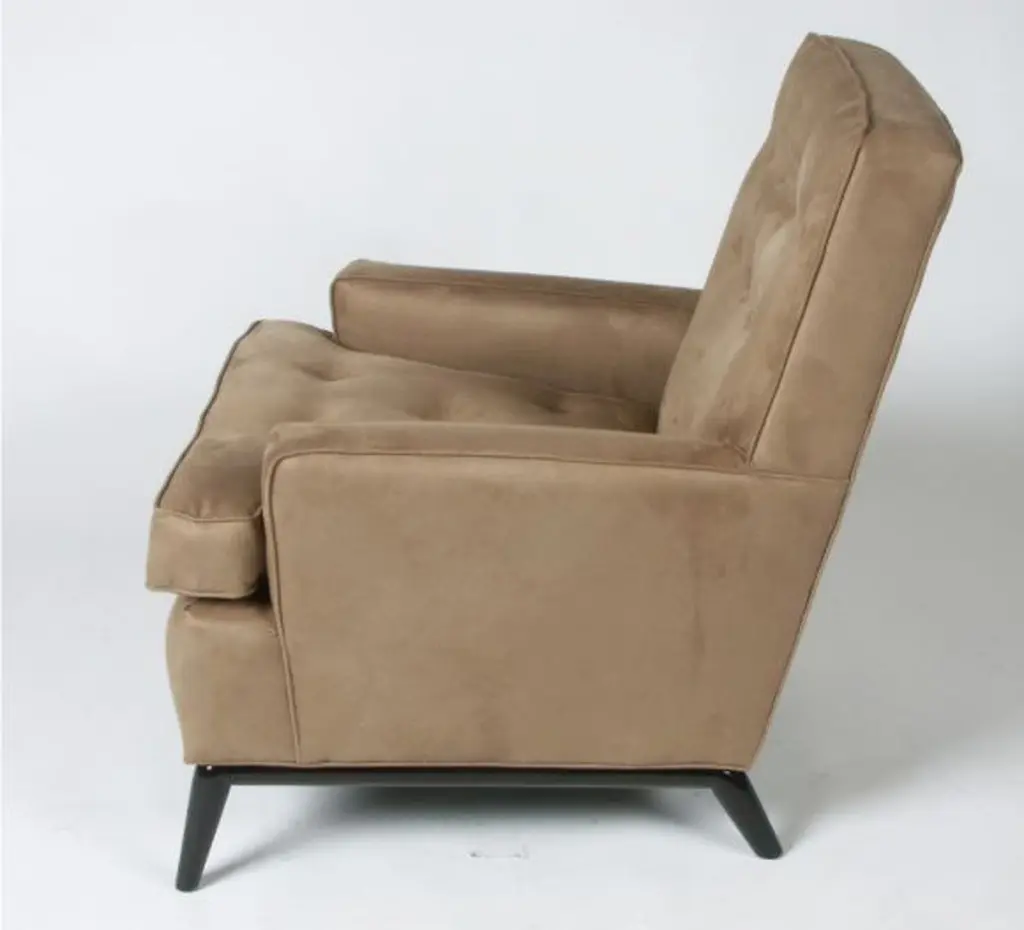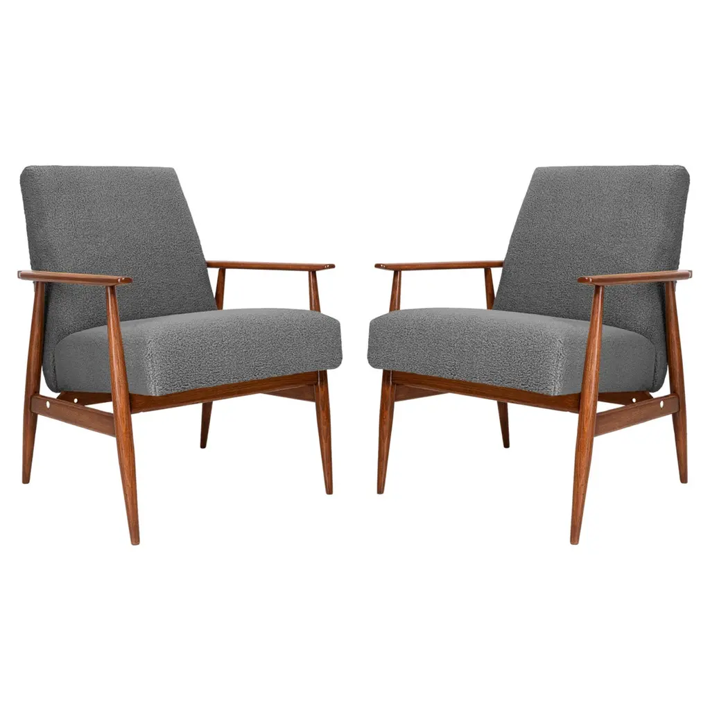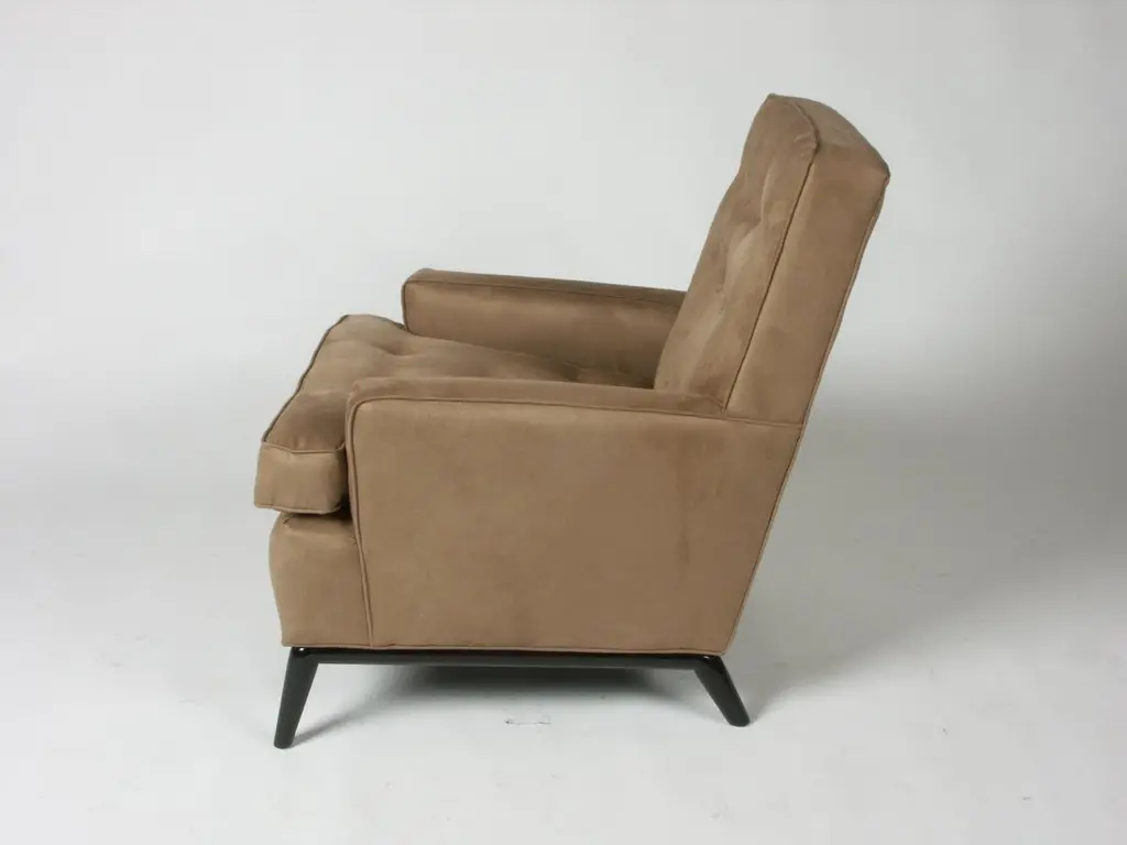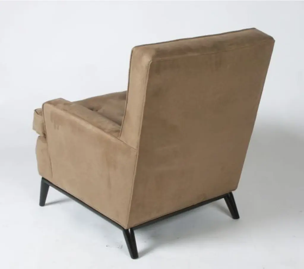 Pair of T.H. Robsjohn-Gibbings for Widdicomb highback club chairs with dark walnut base, tapered conical, angled legs. Only one chair has been upholstered.