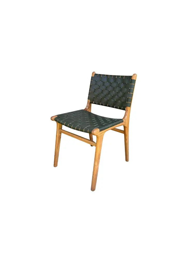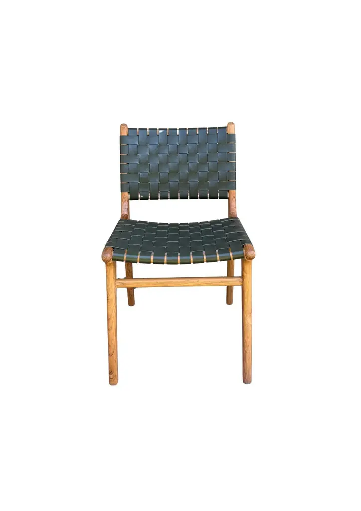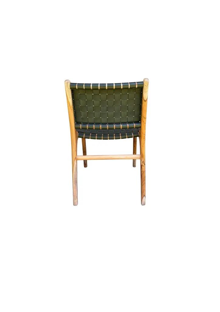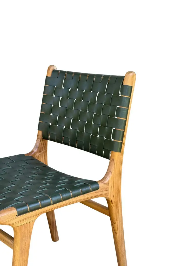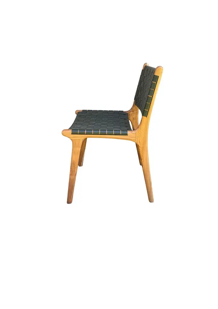 A pair of hand-crafted teak framed & woven leather strap chairs. These chairs are crafted by local artisans using a wood joinery technique without the use of nails. They feature a subtle wood texture and are robust and sturdy.