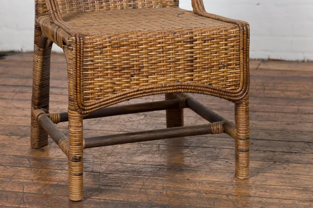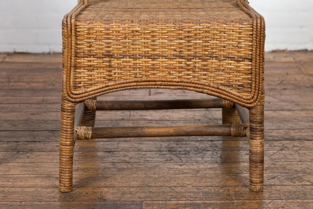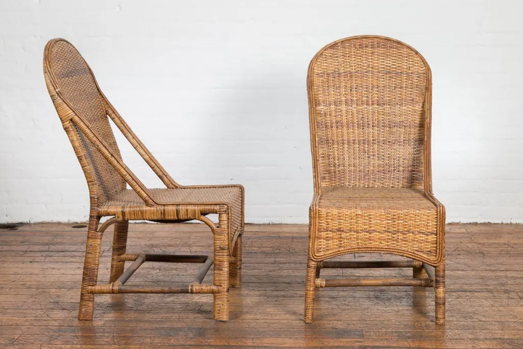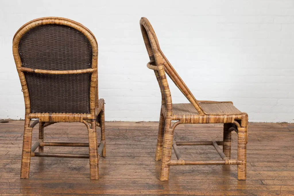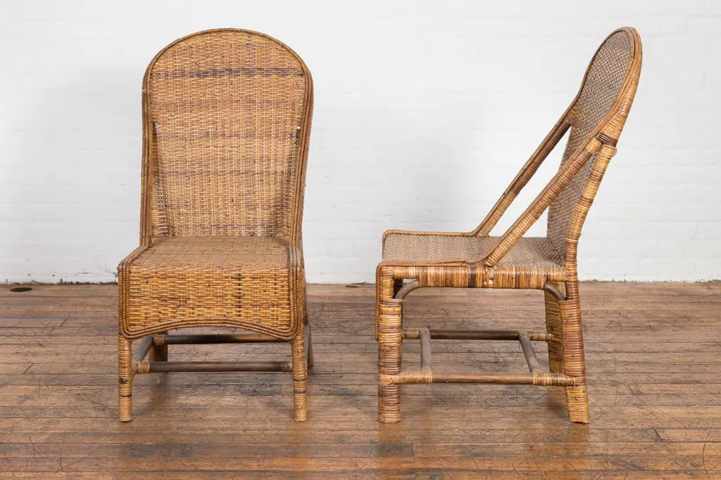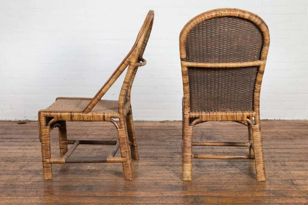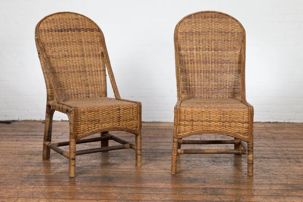 A vintage pair of Country style Burmese hand woven rattan chairs from the mid 20th century, with arching backs and double H-Form cross stretchers. Created in Burma (nowadays called Myanmar) during the midcentury period, this pair of rattan chairs captures our attention with its elegant lines and relaxed presence. Each chair features a comfortable back with arching top, connected to a seat falling into a long skirt. The ensemble is raised on four bamboo legs, straight in the front and slightly splaying in the back. These legs are strengthened and connected to one another through a double H-Form cross stretcher. With their graceful lines and rattan structure, this vintage pair of Country style Burmese chairs from the mid 20th century will make for a wonderful addition to any home, particularly placed in a beach house, country home or mountain cabin! We have several pairs available, priced and sold per pair.