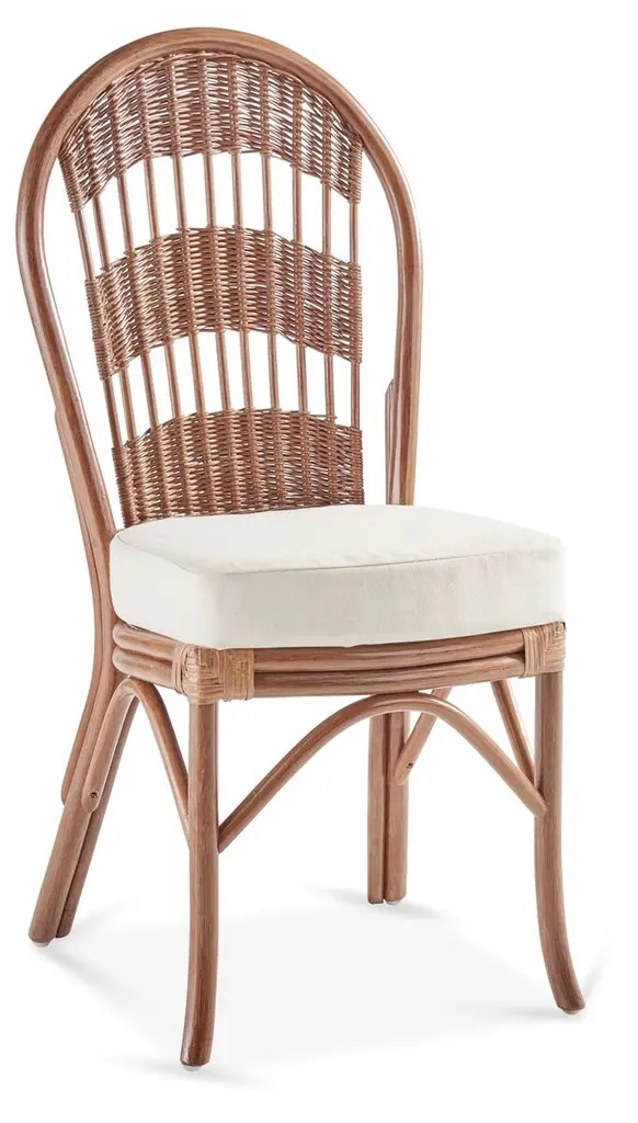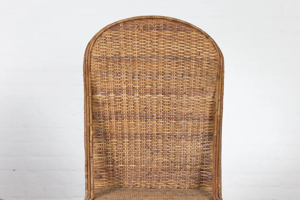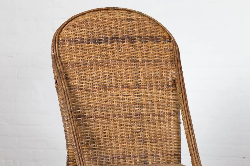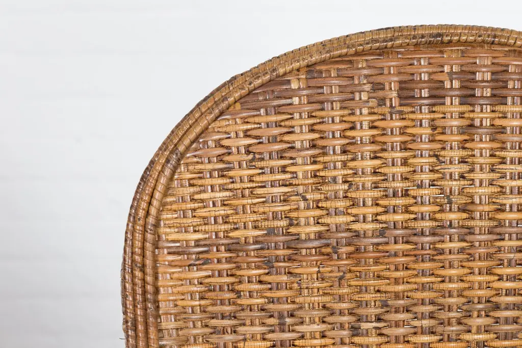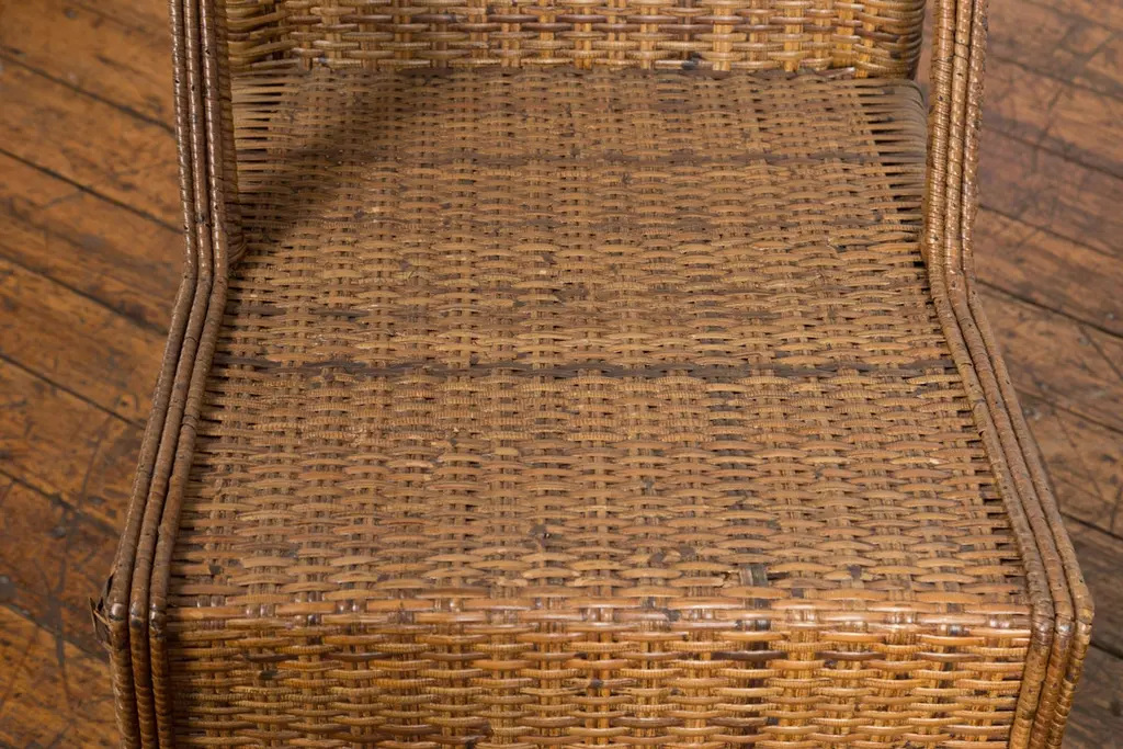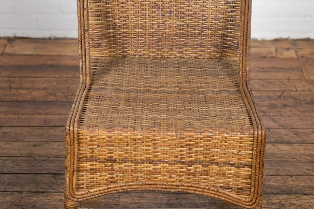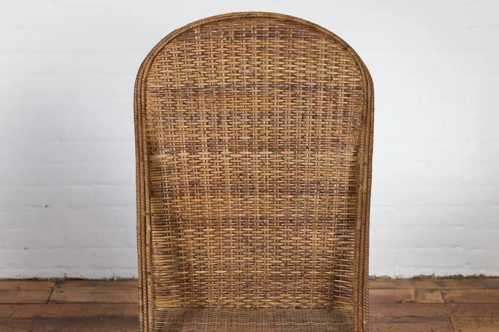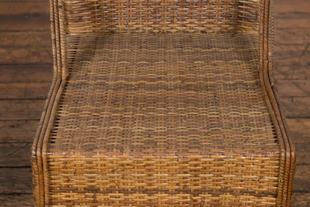 A vintage pair of Country style Burmese hand woven rattan chairs from the mid 20th century, with arching backs and double H-Form cross stretchers. Created in Burma (nowadays called Myanmar) during the midcentury period, this pair of rattan chairs captures our attention with its elegant lines and relaxed presence. Each chair features a comfortable back with arching top, connected to a seat falling into a long skirt. The ensemble is raised on four bamboo legs, straight in the front and slightly splaying in the back. These legs are strengthened and connected to one another through a double H-Form cross stretcher. With their graceful lines and rattan structure, this vintage pair of Country style Burmese chairs from the mid 20th century will make for a wonderful addition to any home, particularly placed in a beach house, country home or mountain cabin! We have several pairs available, priced and sold per pair.