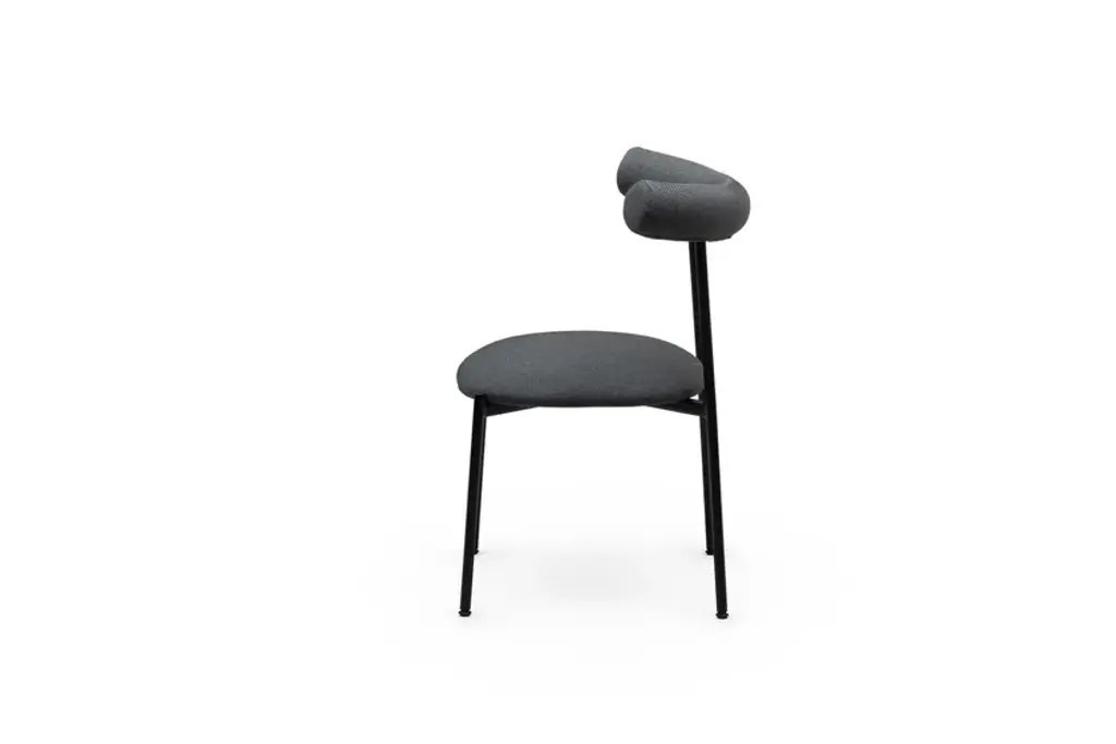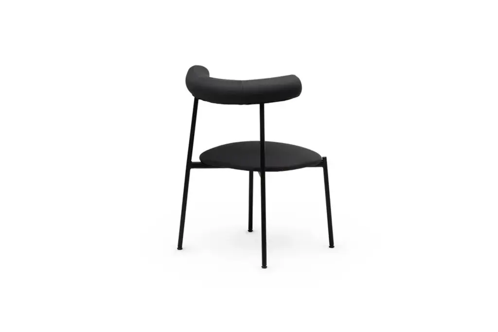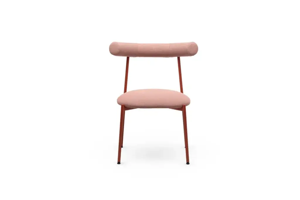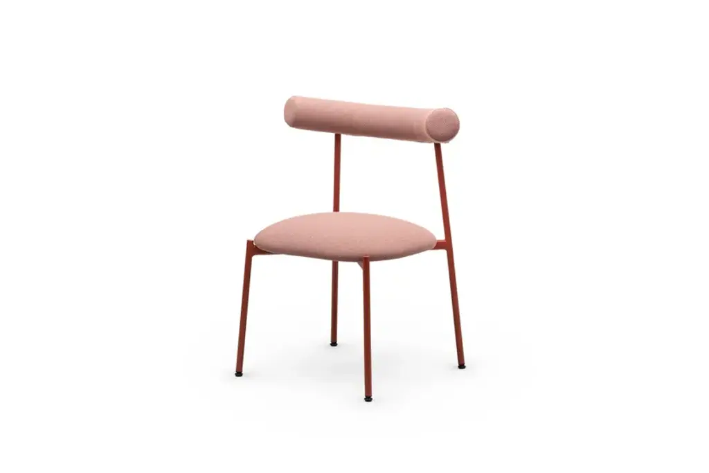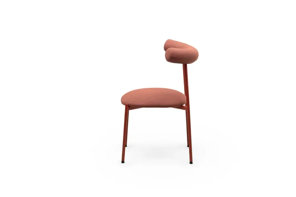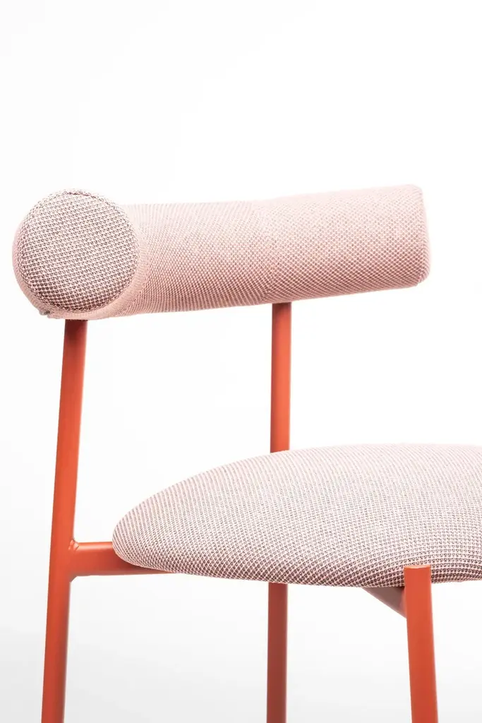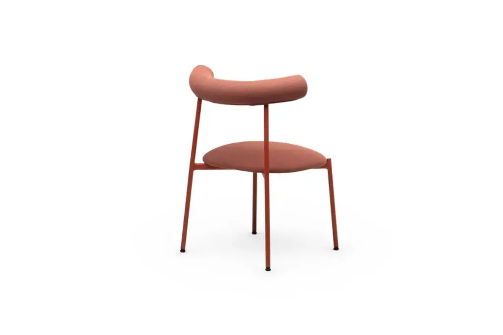 Pampa S is a chair in black, white or brick red painted metal frame, and upholstered seat and back with fabric.Gleefully extravagant in its proportions, Pampa is a collection of chairs and stools with an unusual and delicate charm. Welcoming in the oversized design of the upholstered backrest, combined with a thin metal structure and a soft seat, the Pampa chairs interpret the needs of any environment with imagination and delicacy. Linearity and iconography come together in a game of proportions. The filiform harmony of the structure is unbalanced by a rounded and generous back which becomes the distinctive element of the collection. The result is a series of iconic and vaguely extravagant seats that evoke the fascinating graphic signs of rock paintngs and frescoes of ancient Mediterranean civilizatons. With its welcoming shapes, its contemporary profile and colored upholstery in recycled fiber fabrics, the Pampa collecton is dedicated to comfort in every scenario of contemporary living.