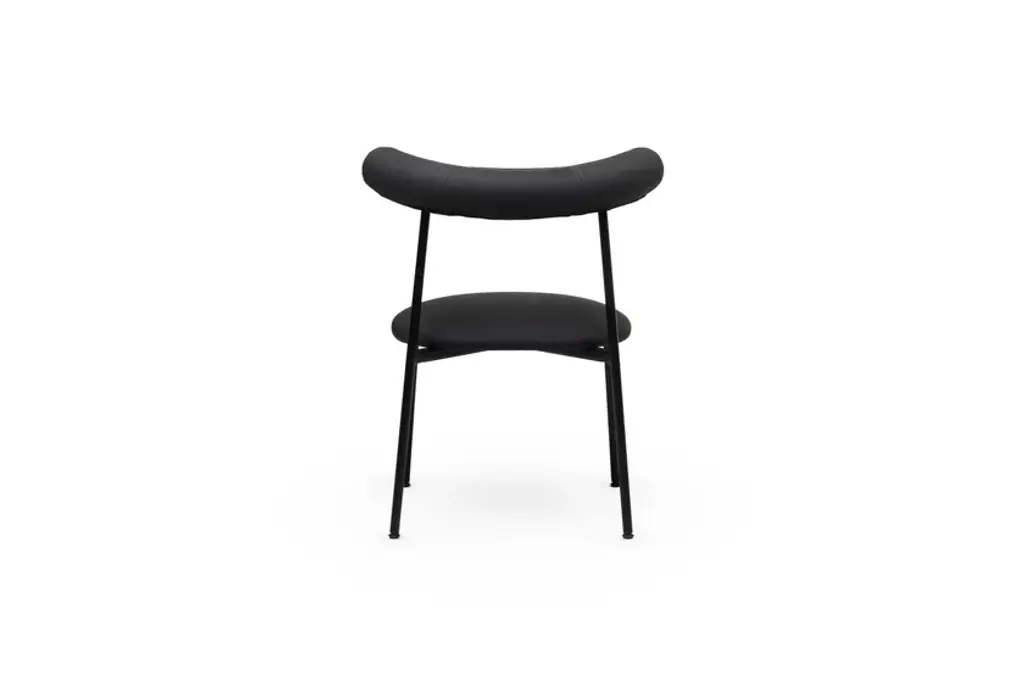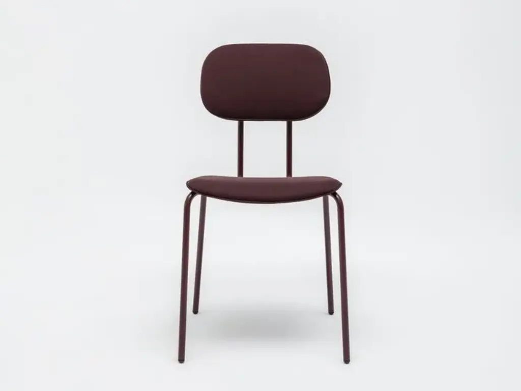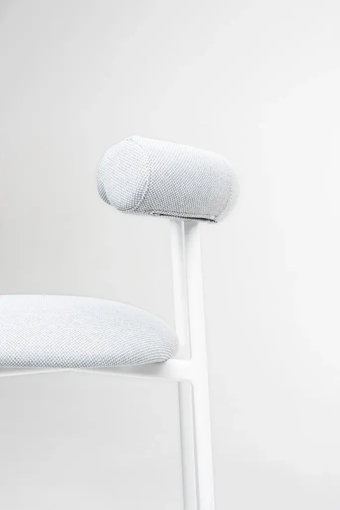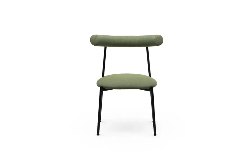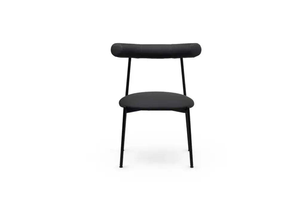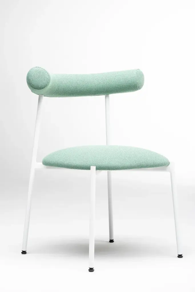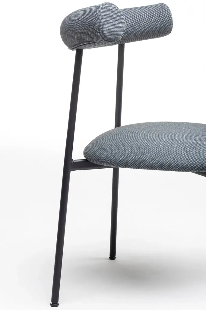 Pampa S is a chair in black, white or brick red painted metal frame, and upholstered seat and back with fabric.Gleefully extravagant in its proportions, Pampa is a collection of chairs and stools with an unusual and delicate charm. Welcoming in the oversized design of the upholstered backrest, combined with a thin metal structure and a soft seat, the Pampa chairs interpret the needs of any environment with imagination and delicacy. Linearity and iconography come together in a game of proportions. The filiform harmony of the structure is unbalanced by a rounded and generous back which becomes the distinctive element of the collection. The result is a series of iconic and vaguely extravagant seats that evoke the fascinating graphic signs of rock paintngs and frescoes of ancient Mediterranean civilizatons. With its welcoming shapes, its contemporary profile and colored upholstery in recycled fiber fabrics, the Pampa collecton is dedicated to comfort in every scenario of contemporary living.