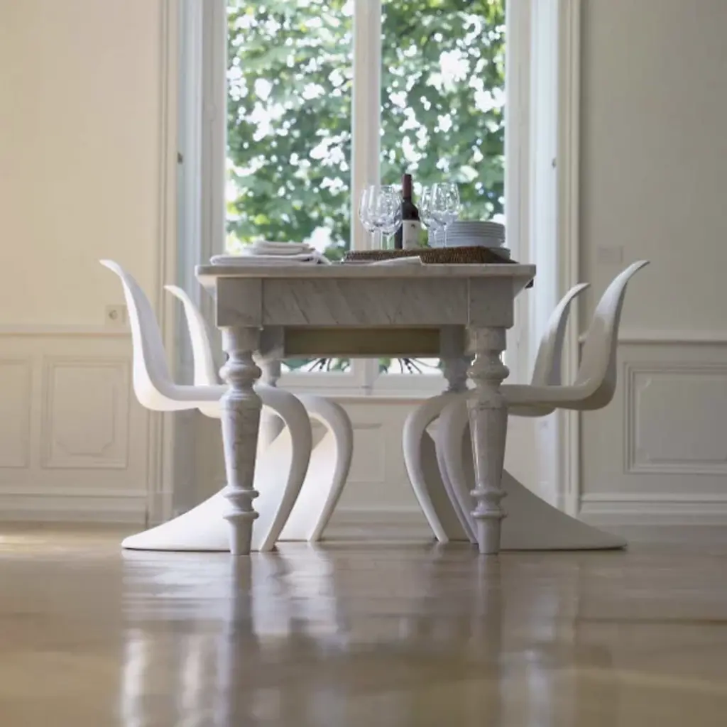 A 1999 revision to the classic Panton chair--and the last version authorized by Verner Panton. The plastic in this model has been completely re-engineered and molded out of a single piece of dyed polypropylene. It also has a matte surface (the 1959/60 original version has a glossy finish). Finally...a Panton chair that realized one of its creator's primary objectives: a plastic chair as an affordable industrial product.