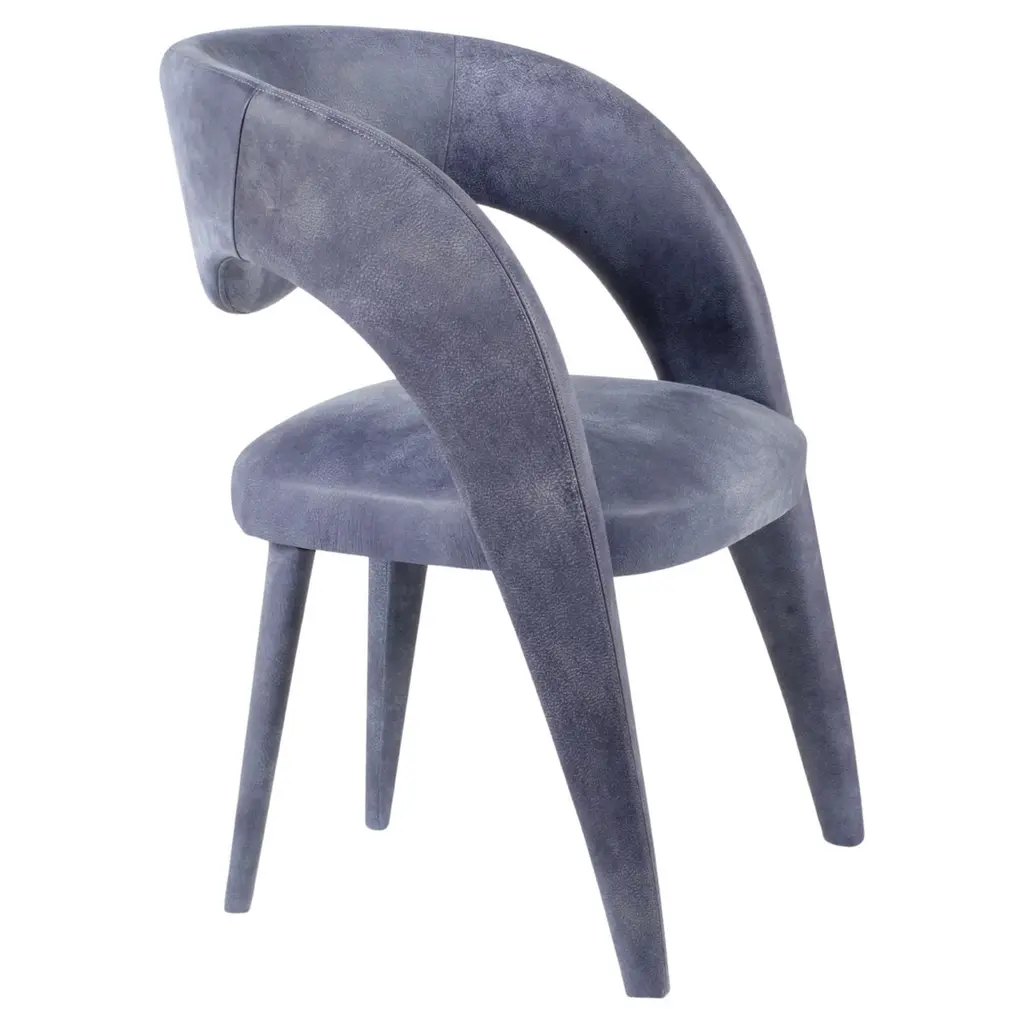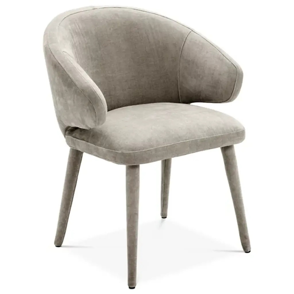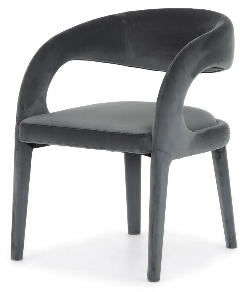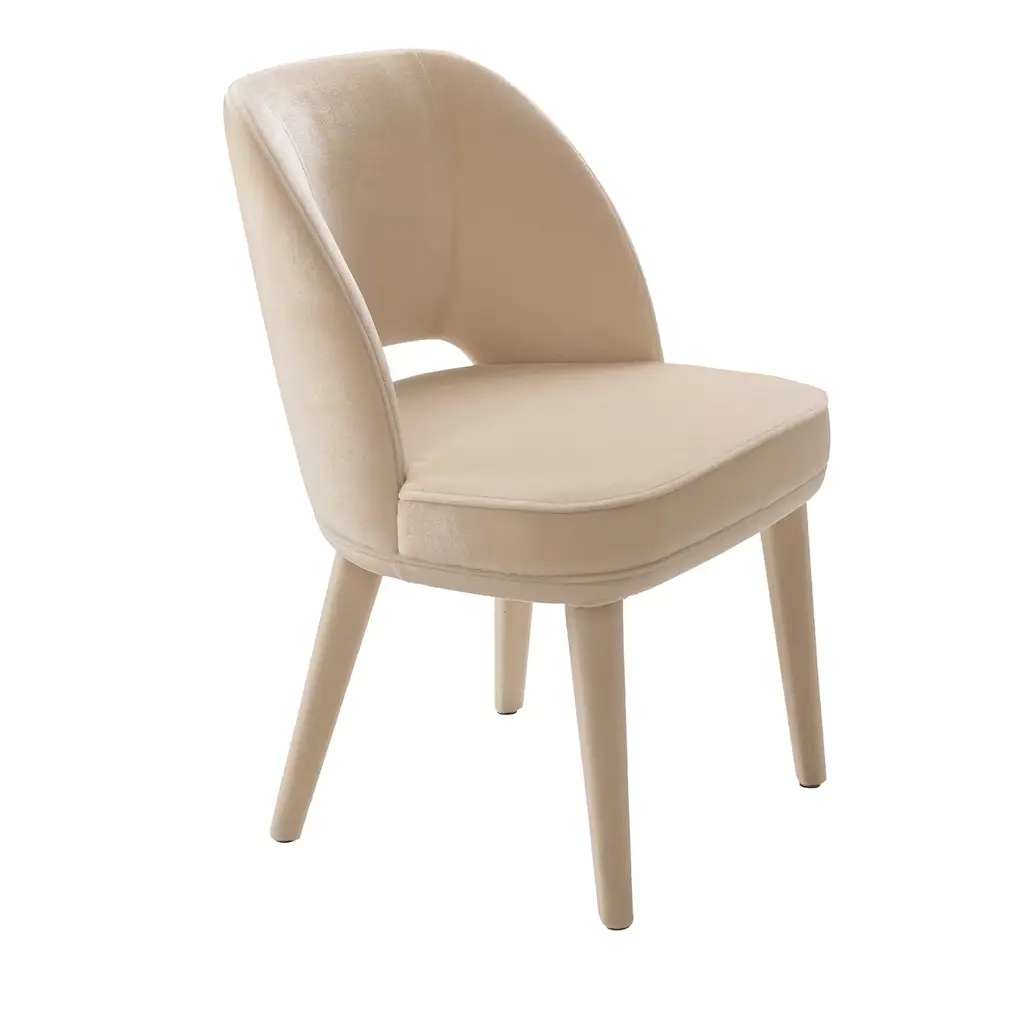 Brimming with sartorial elegance, this exquisite chair promises impeccable comfort. Generously stuffed and completely covered in fine gray-hued Vladimiro velvet (cat. A+), its silhouette is distinguished by an enveloping backrest and tapered legs distilling quiet dynamism. A precious horn disk set in a burnished brass frame adorns the back, revealing the piece's opulent character.