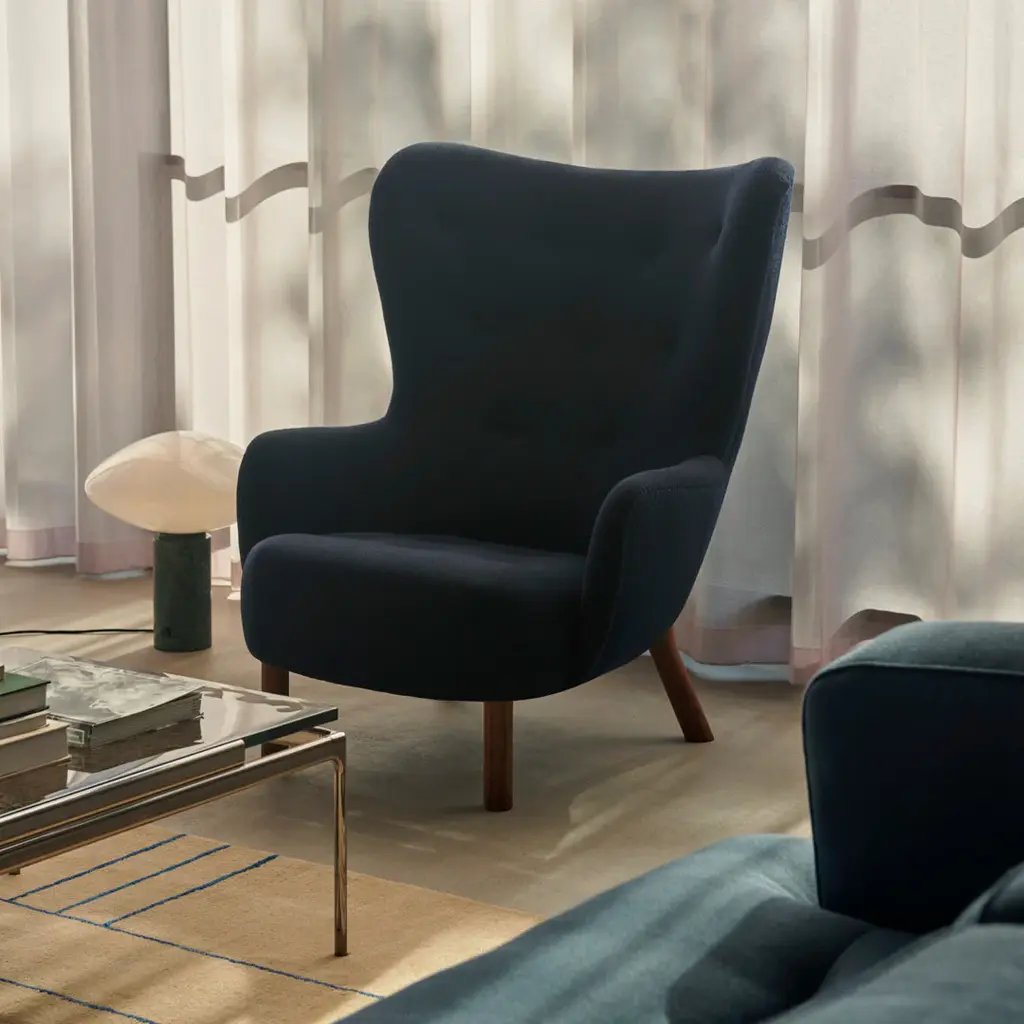 Initially introduced back in 1938, Petra won instant praise at the Copenhagen Cabinetmakers Guild Exhibition, subsequently winning awards at exhibits in New York and Berlin. It's one of just a few designs by architect Viggo Boesen, who became associated with Denmark's signature design aesthetic in the 1930s called funkis style. Distinguished by a softer, more abundant, organic aesthetic that challenged the minimalistic approach of Bauhaus. Low to the ground, open and embracing, it embodies the essence of a lounge chair, allowing for all kinds of seating positions in any cozy setting imaginable. A lot of work has gone into ensuring the utmost comfort, from the seat to the upholstery. Respecting Boesen's love of natural materials, the legs of the chair have been crafted in oak or walnut. The result is an endearing lounge chair that beckons you to stay.