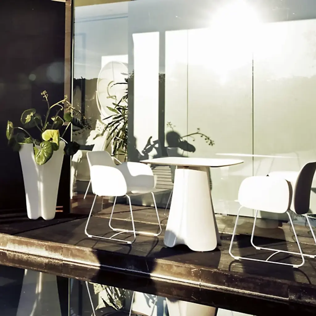 The Pezzettina Armrest Chair draws upon the natural world of cloud and stone for its unlikely beauty. This sled-base chair complements the original shapes of the Pezzettina collection, with its askew rounded rhombus armrests and trapazoidal base frame. Like most Vondom products, the chair is 100% recyclable, not that you would ever stop loving it!